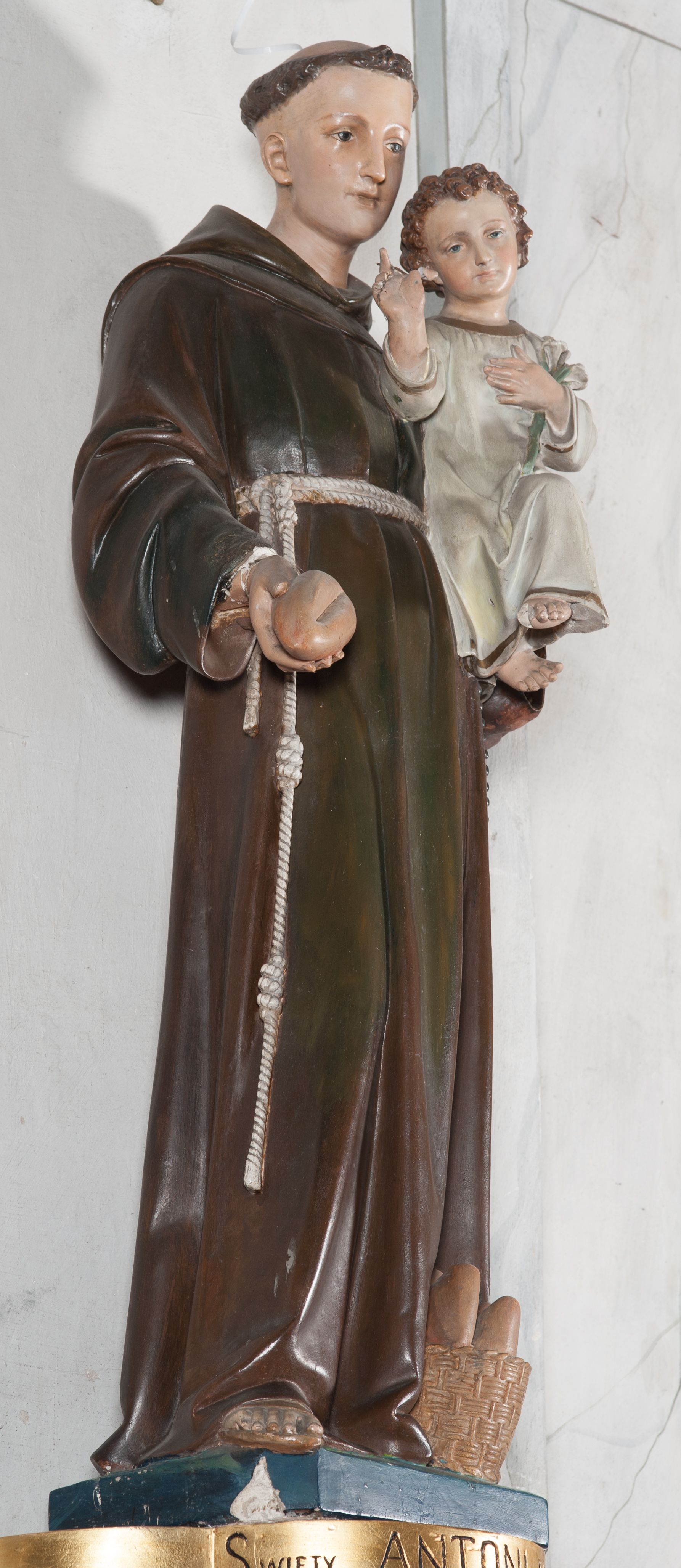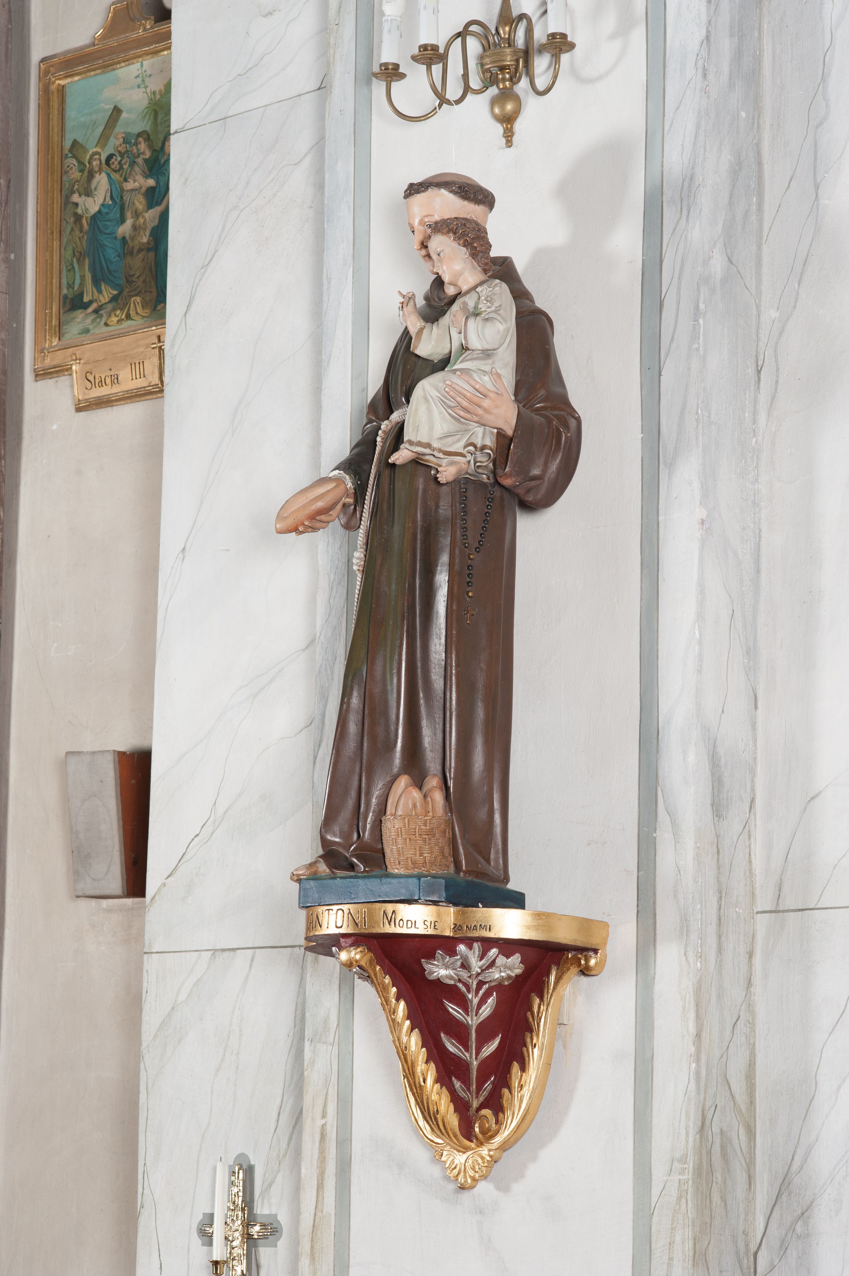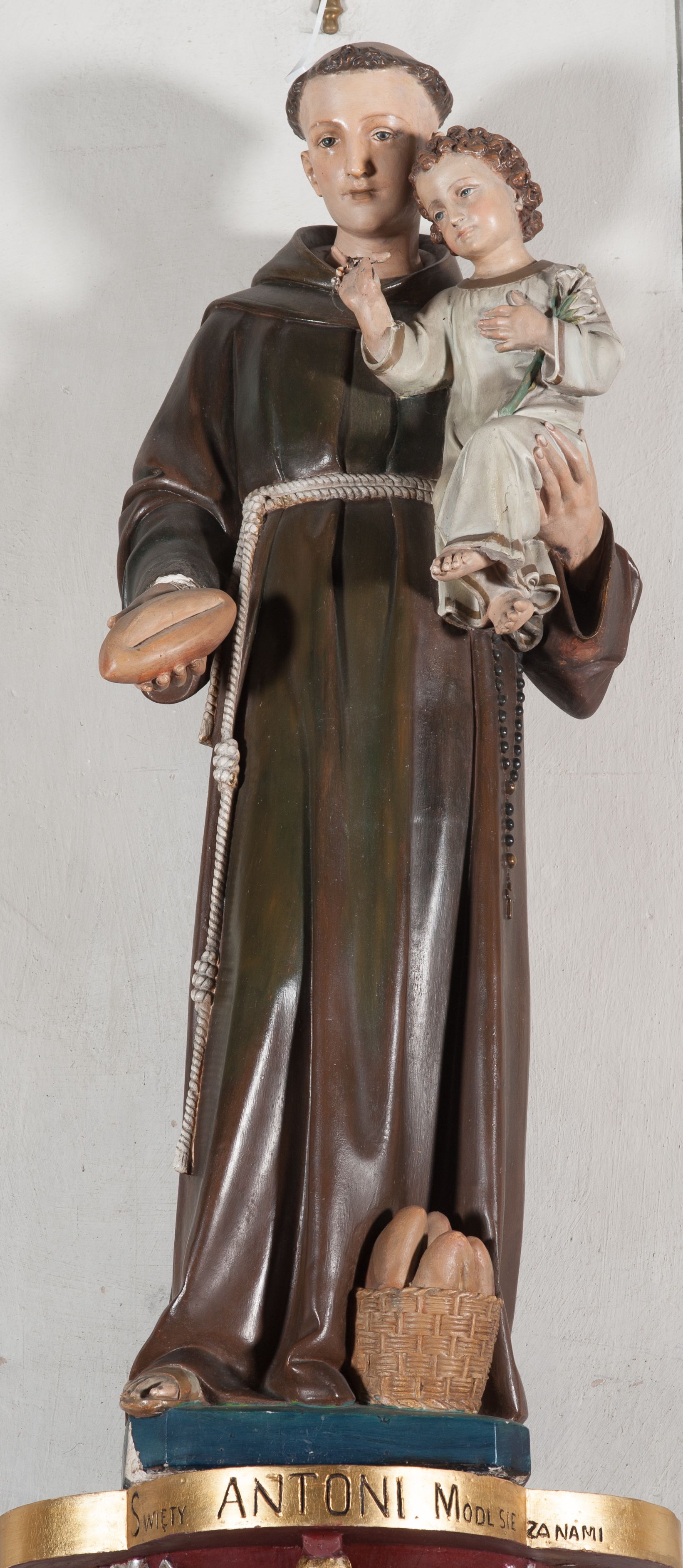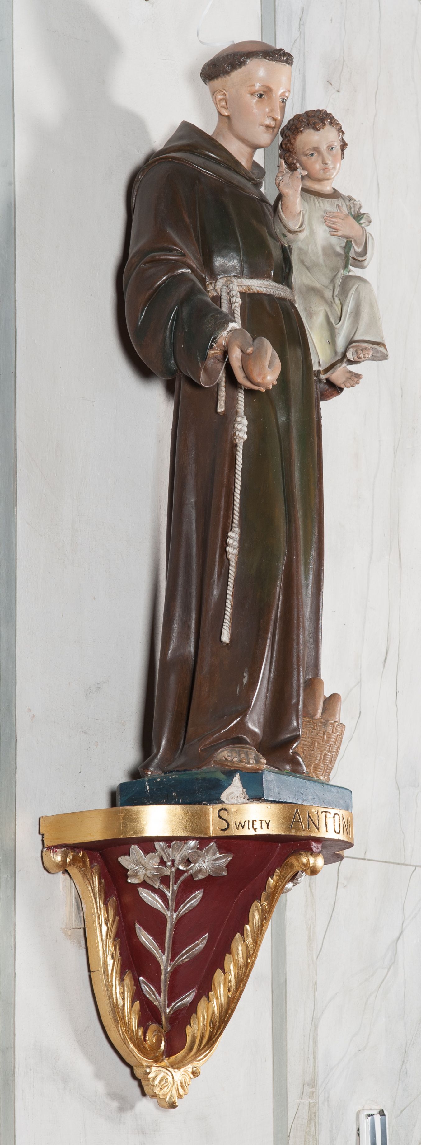 Rzeźba pełnoplastyczna, umieszczona na niewielkim prostopadłościennym postumencie o ściętych narożach oraz złoconej i srebrzonej konsoli utworzonej z liści akantu i róż. Święty ukazany całopostaciowo, frontalnie w pozycji stojącej. Antoni został przedstawiony jako młody mężczyzna o owalnej, pozbawionej zarostu twarzy i krótkich, brązowych włosach z tonsurą. Ma oczy wpatrzone przed siebie, wydatny, prosty nos, usta zamknięte. Postać w prawej ręce trzyma bochenek chleba, a na lewej podtrzymuje Dzieciątko Jezus. Święty ubrany jest w długi, ciemnobrązowy habit franciszkański. Do sznura z trzema węzłami ujmującego go w pasie przywiązany jest różaniec. Spod habitu widoczne stopy obute w sandały. U stóp ustawiony kosz z bochenkami chleba. Jasnowłose Dzieciątko Jezus ukazane w pozycji siedzącej z głową zwróconą w trzech czwartych w prawo. Prawą ręką wykonuje gest błogosławieństwa, lewą składa na piersi, podtrzymując kwiat białej lilii. Postać ubrana z białą tunikę ze złotą lamówką wokół dekoltu, rękawów oraz dolnej krawędzi szaty. Na konsoli, na której ustawiona jest rzeźba widnieje napis: ŚWIĘTY ANTONI MÓDL SIĘ ZA NAMI.