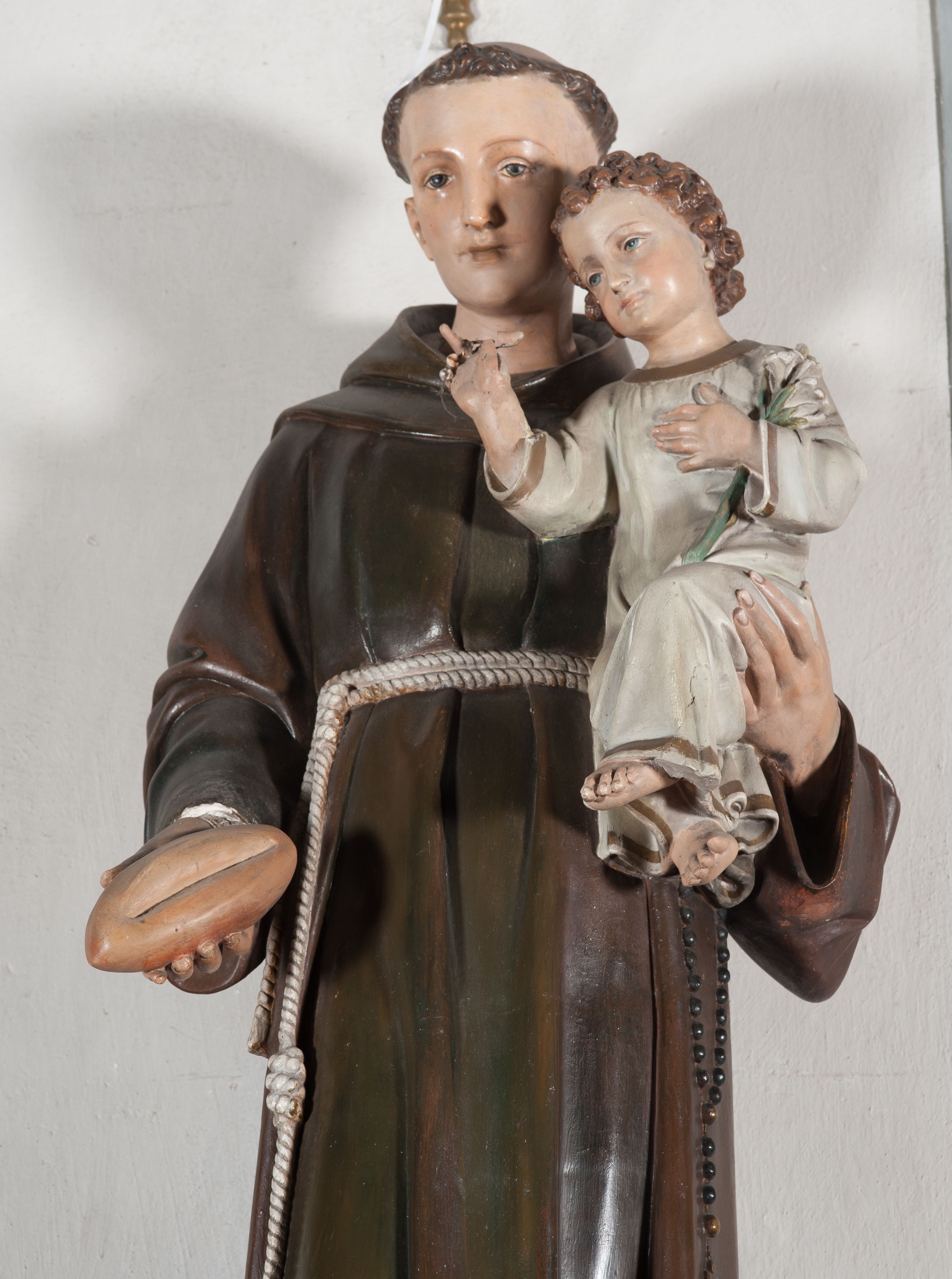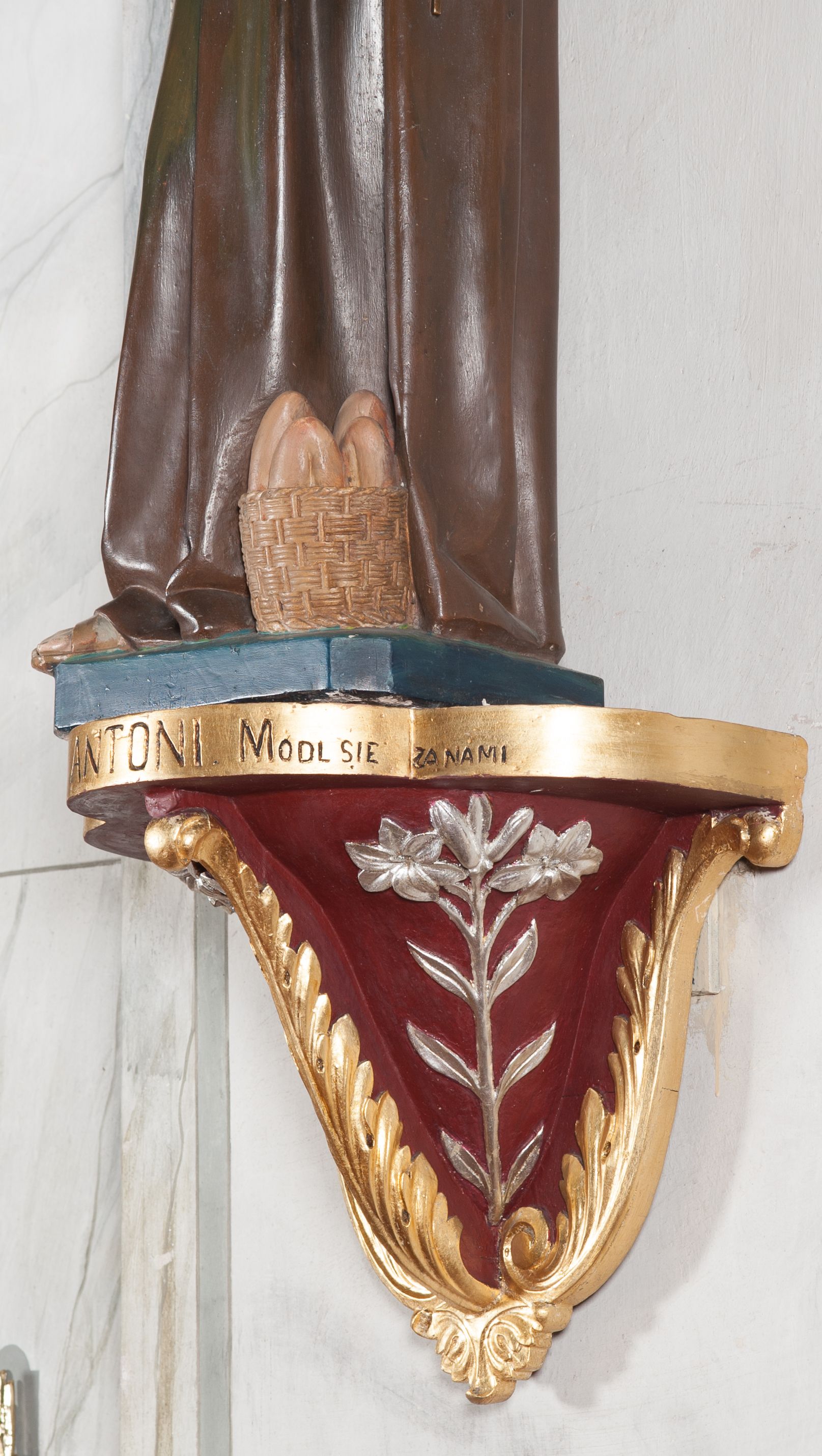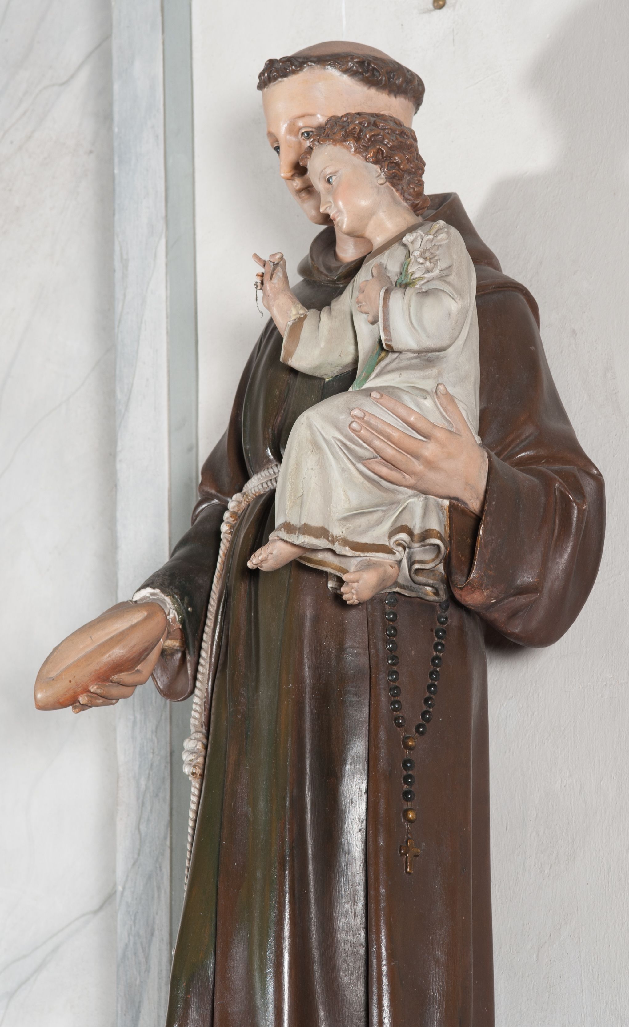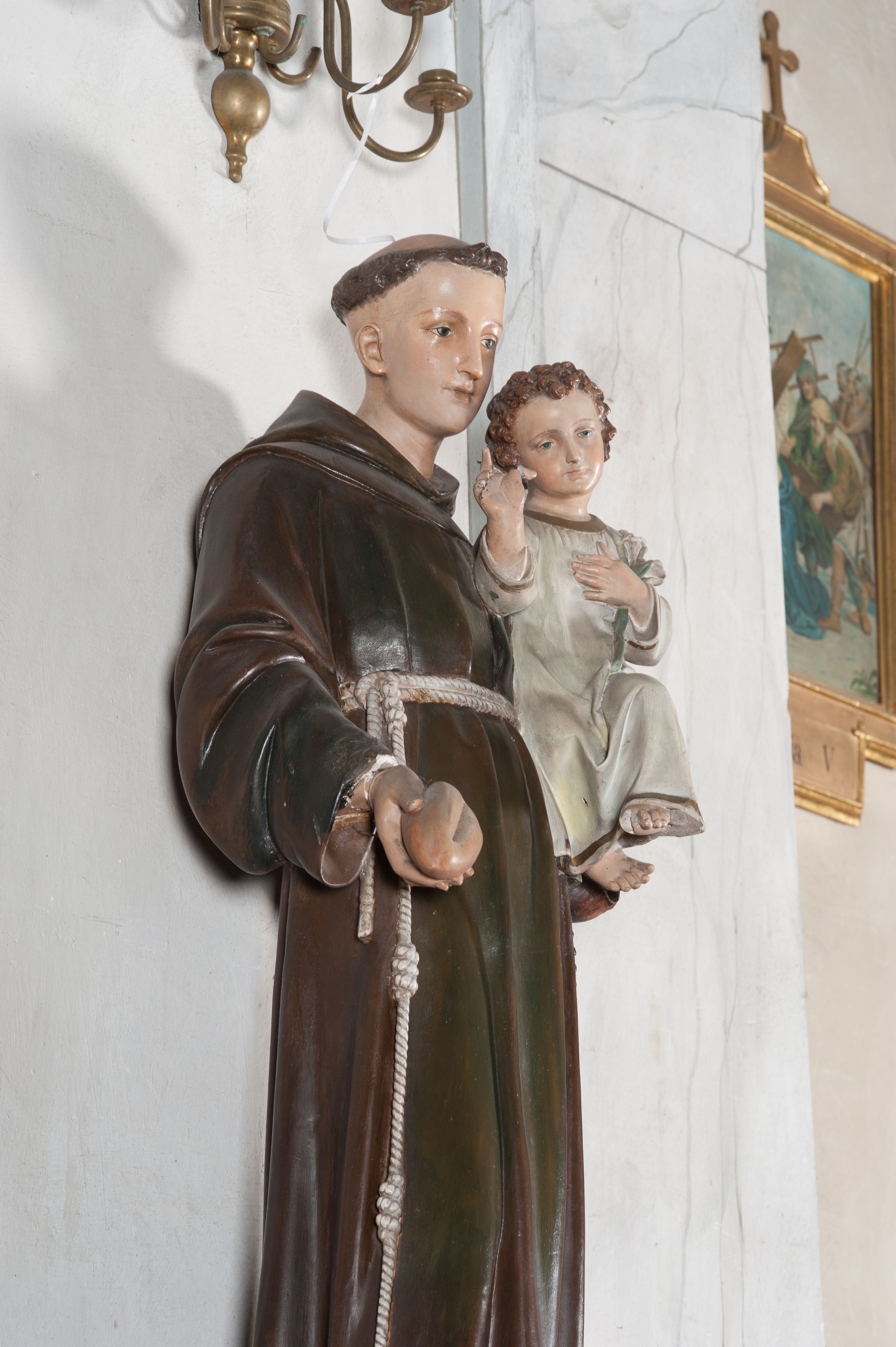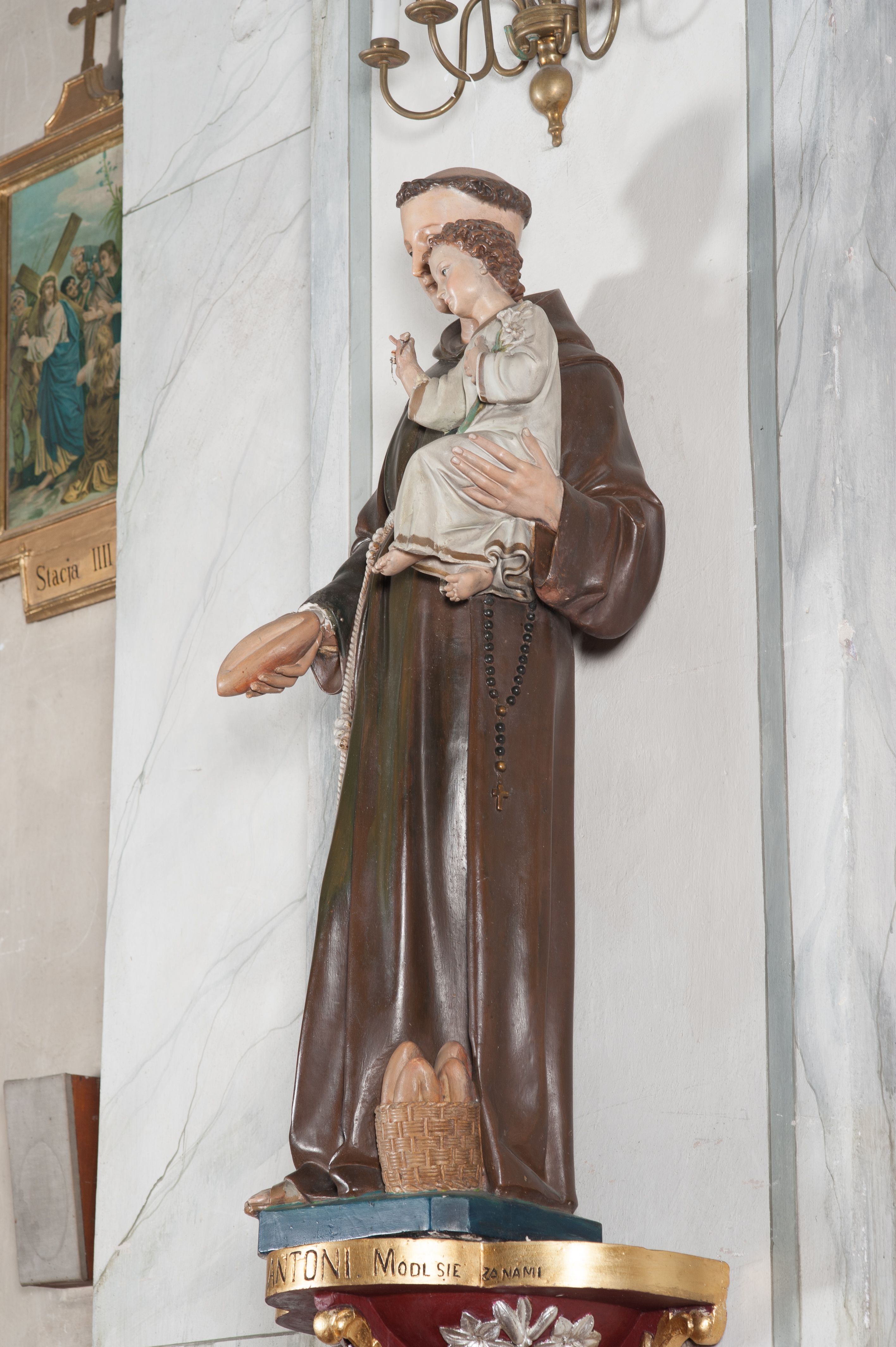 Rzeźba pełnoplastyczna, umieszczona na niewielkim prostopadłościennym postumencie o ściętych narożach oraz złoconej i srebrzonej konsoli utworzonej z liści akantu i róż. Święty ukazany całopostaciowo, frontalnie w pozycji stojącej. Antoni został przedstawiony jako młody mężczyzna o owalnej, pozbawionej zarostu twarzy i krótkich, brązowych włosach z tonsurą. Ma oczy wpatrzone przed siebie, wydatny, prosty nos, usta zamknięte. Postać w prawej ręce trzyma bochenek chleba, a na lewej podtrzymuje Dzieciątko Jezus. Święty ubrany jest w długi, ciemnobrązowy habit franciszkański. Do sznura z trzema węzłami ujmującego go w pasie przywiązany jest różaniec. Spod habitu widoczne stopy obute w sandały. U stóp ustawiony kosz z bochenkami chleba. Jasnowłose Dzieciątko Jezus ukazane w pozycji siedzącej z głową zwróconą w trzech czwartych w prawo. Prawą ręką wykonuje gest błogosławieństwa, lewą składa na piersi, podtrzymując kwiat białej lilii. Postać ubrana z białą tunikę ze złotą lamówką wokół dekoltu, rękawów oraz dolnej krawędzi szaty. Na konsoli, na której ustawiona jest rzeźba widnieje napis: ŚWIĘTY ANTONI MÓDL SIĘ ZA NAMI.