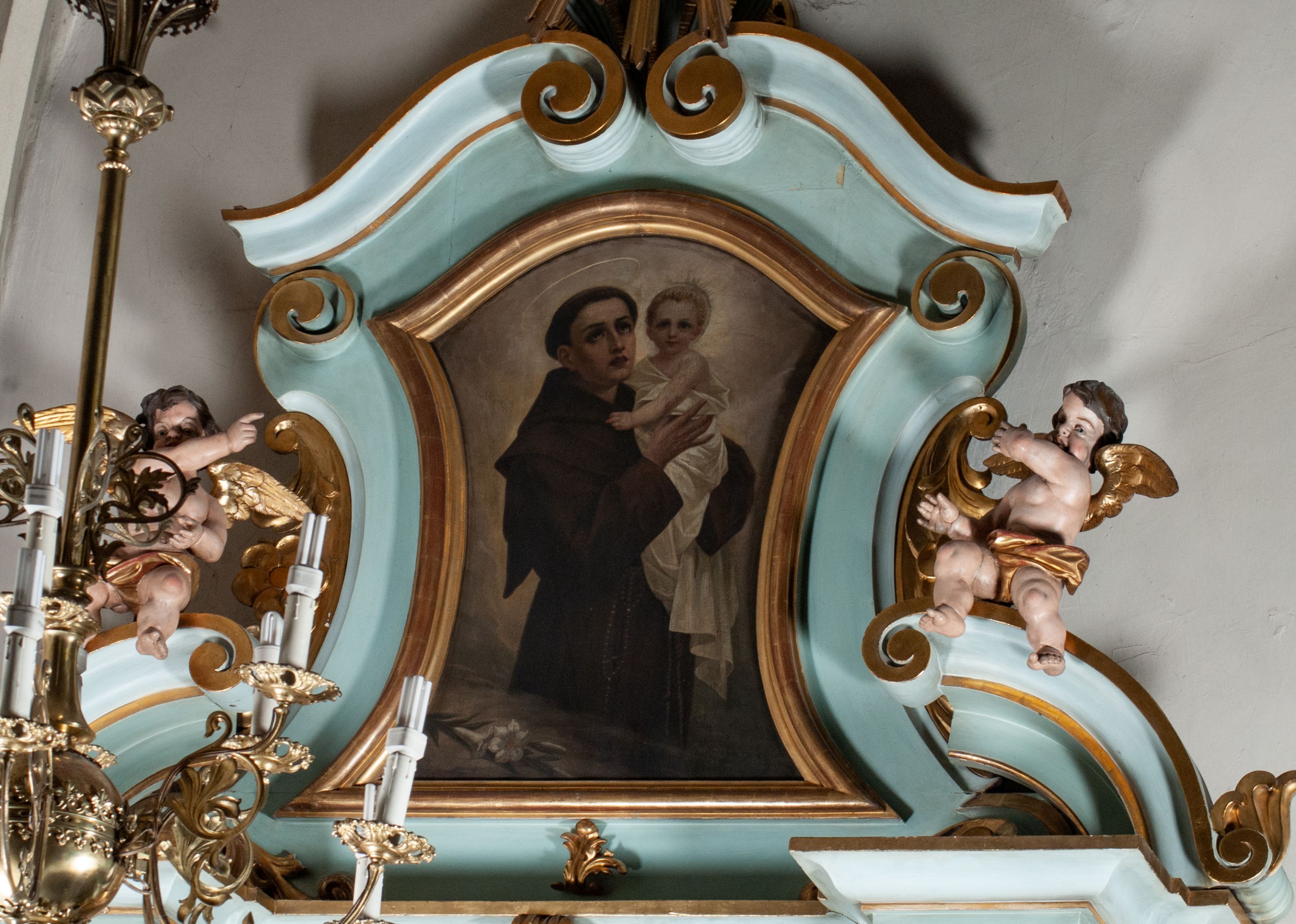 Ukazany na obrazie św. Antoni jeszcze w młodym wieku wstąpił do zakonu kanoników regularnych, dopiero później do franciszkanów, gdzie przyjął imię Antoni. Prowadził przede wszystkim działalność kaznodziejską, jak również był wykładowcą na uniwersytecie w Bolonii. Pozostawił po sobie liczne teksty kazań. Święty Antoni otrzymał tytuł doktora Kościoła. W ikonografii przedstawiany jest w habicie franciszkańskim z tonsurą na głowie. Często trzyma bądź adoruje Dzieciątko, gdyż według legendy świętemu ukazał się Jezus. Jego atrybutem jest również lilia.