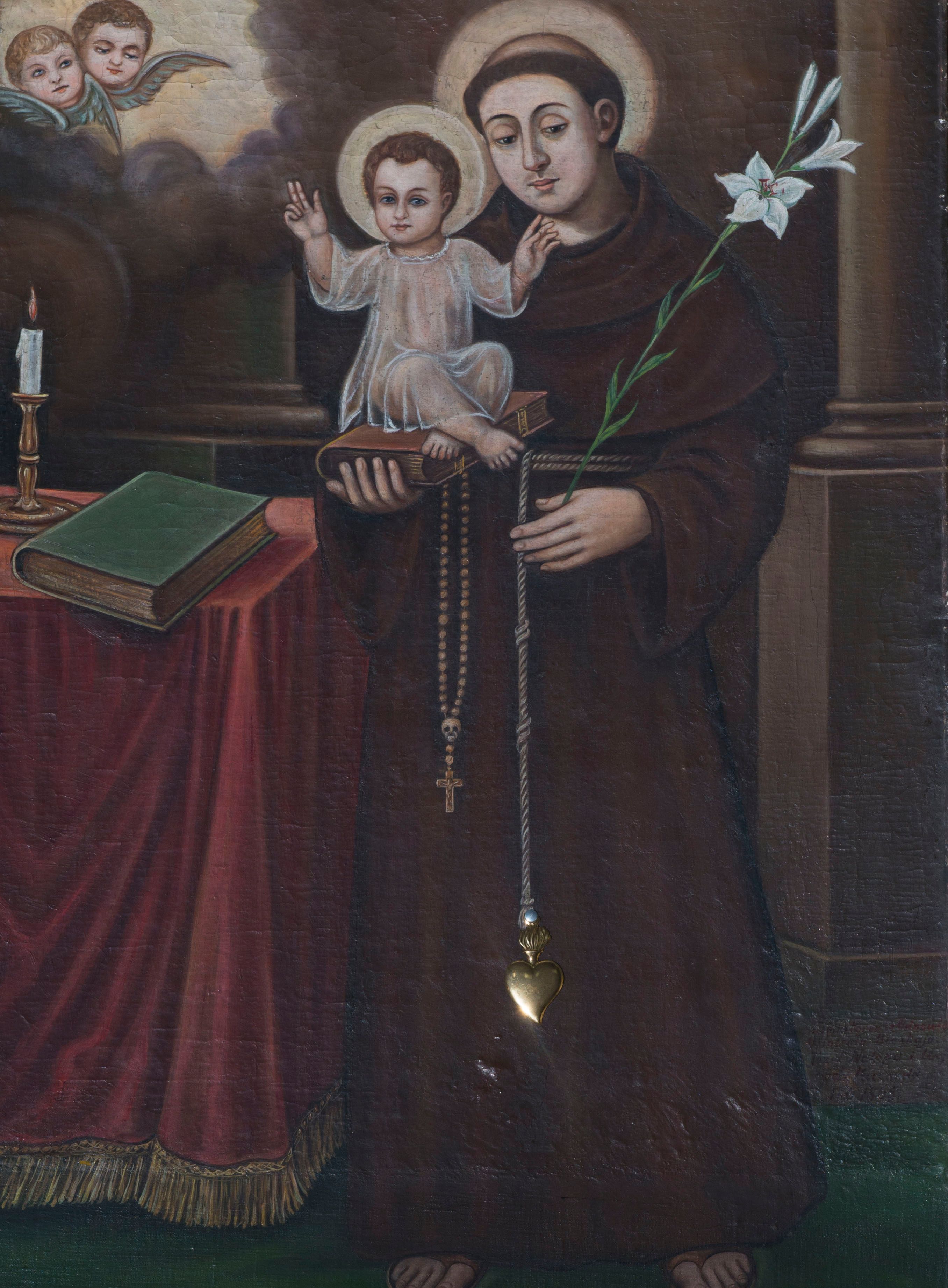 Święty Antoni został ukazany w tradycyjnym typie ikonograficznym jako młody zakonnik w habicie franciszkańskim z Dzieciątkiem Jezus, którego obecność nawiązuje do jego mistycznych przeżyć. Gorejące serce na końcu sznura jest symbolem gorliwości, a trzymana w ręce lilia czystości. Dwie widoczne na obrazie księgi mogą nieść różne znaczenie. Jedna to być może Biblią – ulubiona lektura Antoniego lub inne dzieło będące symbolem wykładowcy teologii. Druga może nawiązywać do legendarnego wydarzenia kradzieży psałterza. Kiedy święty zwrócił się o pomoc do Boga skruszony złodziej wrócił i oddał książkę.