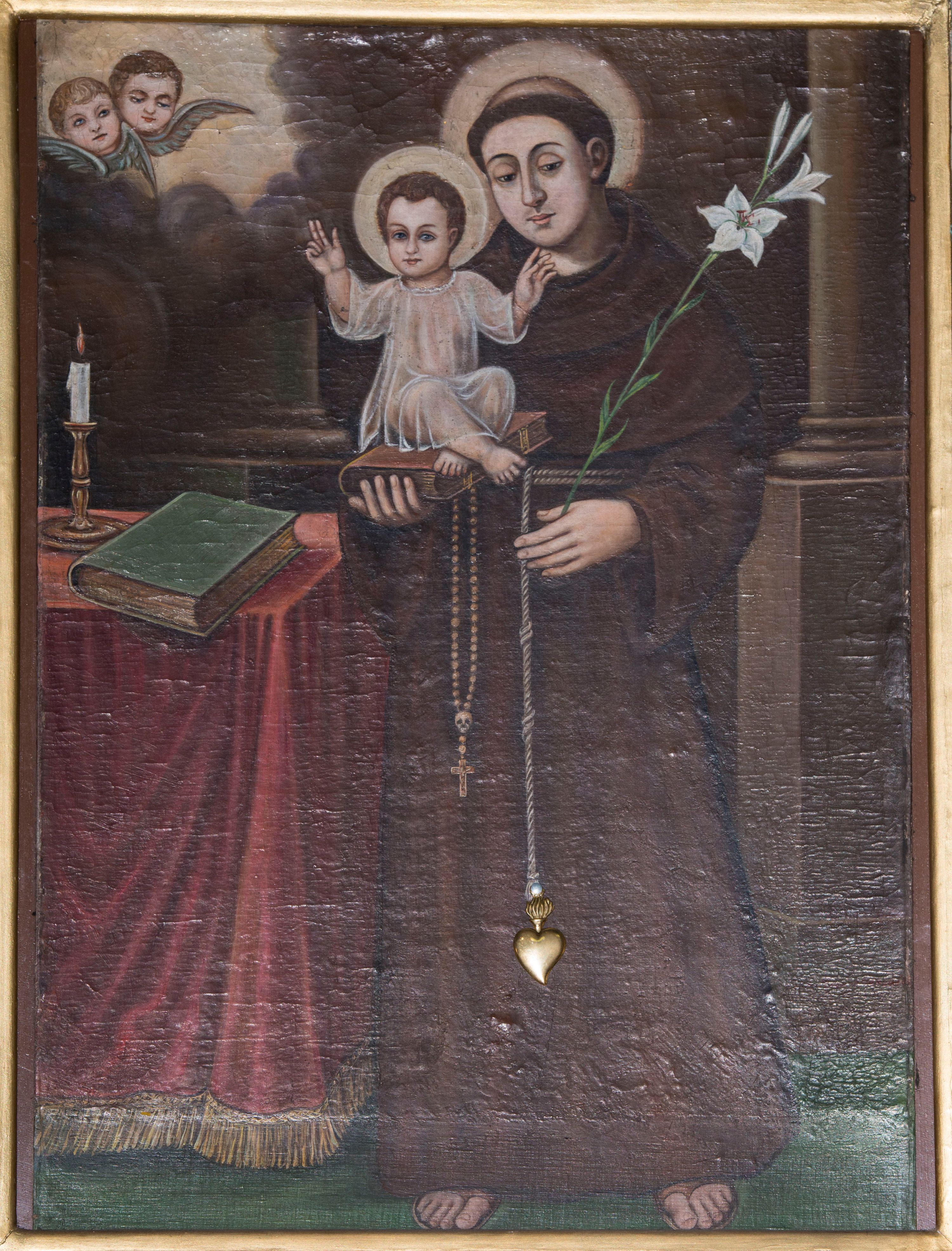 Obraz, którego autorstwo nie jest znane, został namalowany w XIX wieku i najpewniej od początku przeznaczony do ołtarza bocznego. Święty Antoni został ukazany w tradycyjnym typie ikonograficznym jako młody zakonnik w habicie franciszkańskim z Dzieciątkiem Jezus. Otaczające go atrybuty wskazują na jego pobożność i czystość.