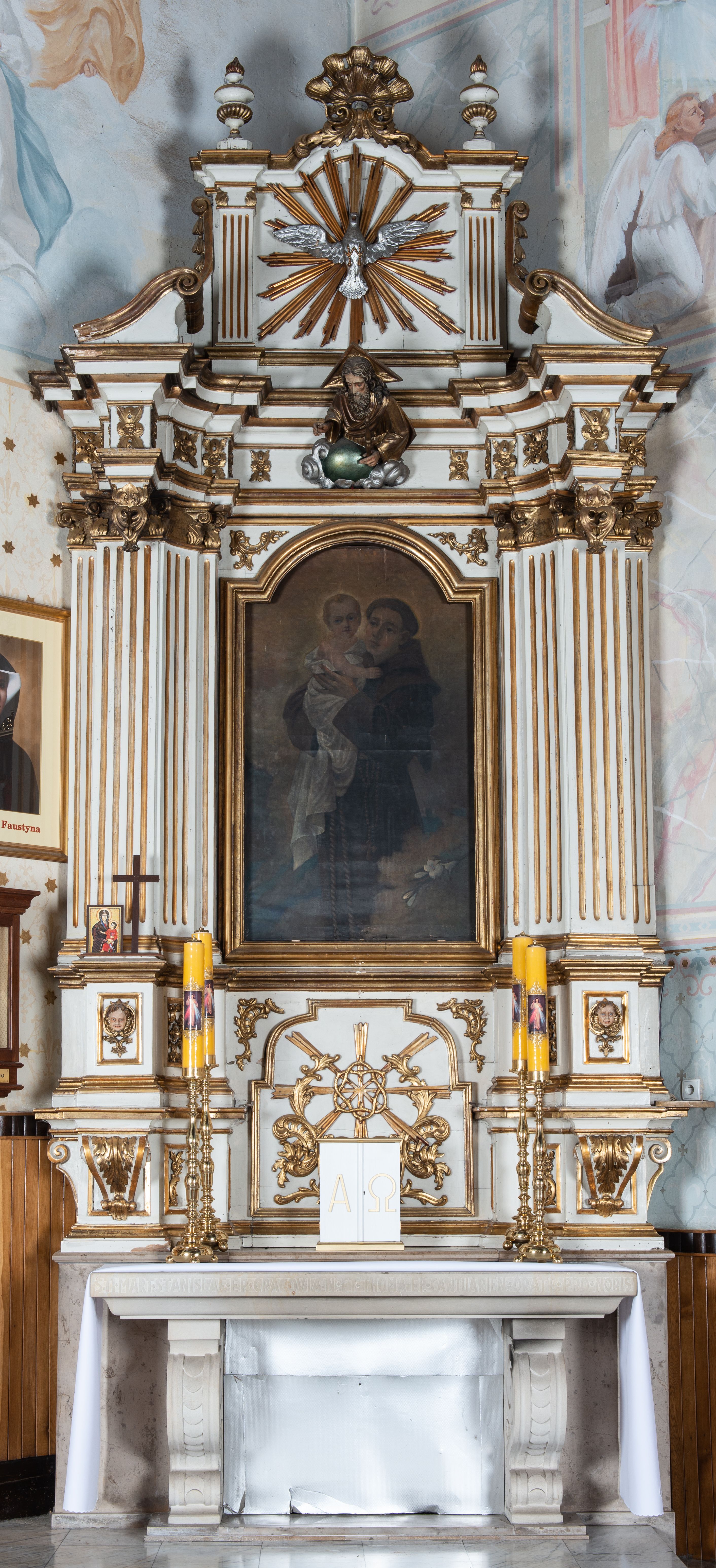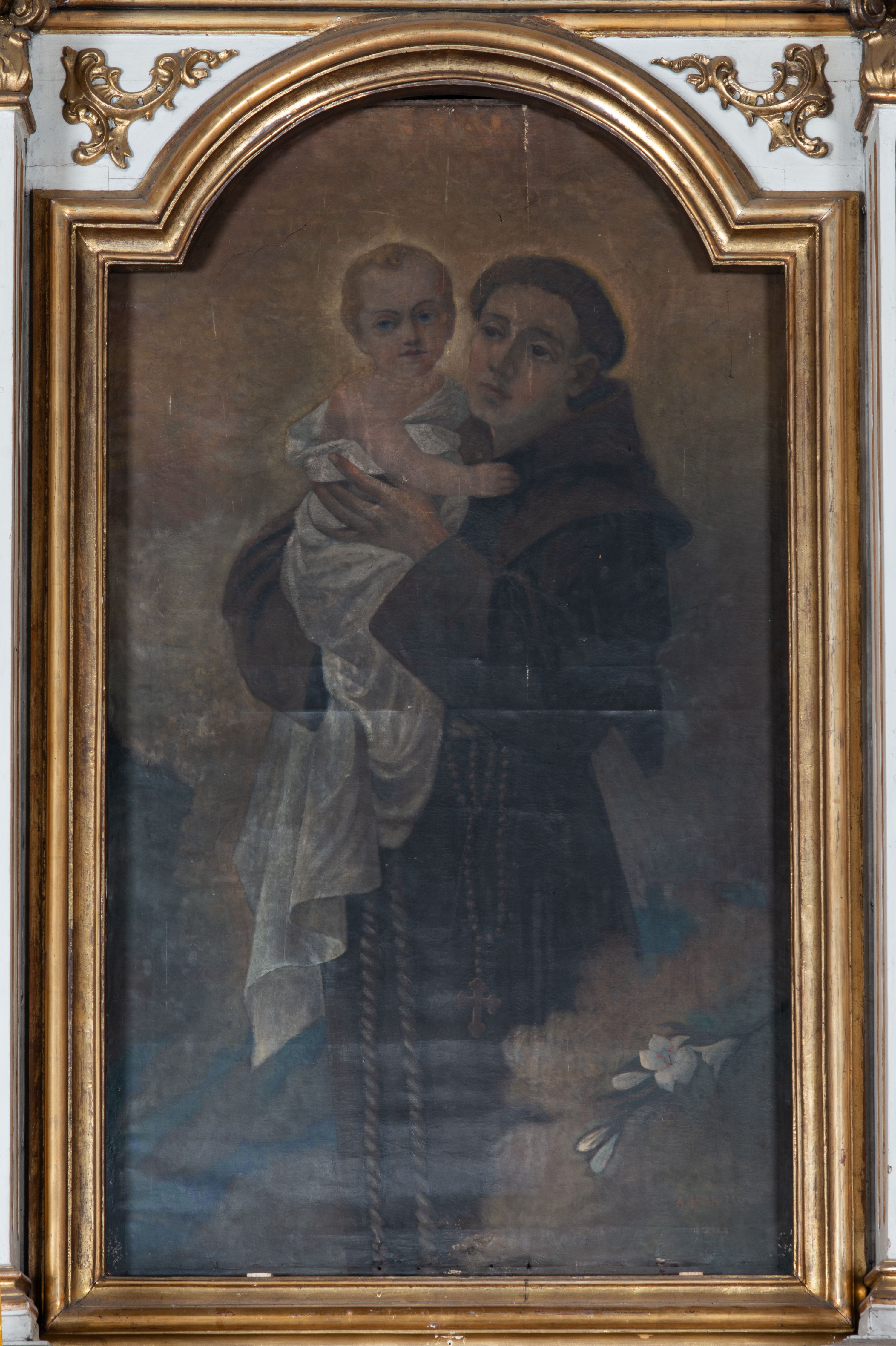 Obraz w kształcie stojącego prostokąta zwieńczonego łukiem nadwieszonym z przedstawieniem św. Antoniego Padewskiego. Święty Antoni ukazany do wysokości trzech czwartych, zwrócony w swoją prawą stronę z Dzieciątkiem Jezus na prawym ręku. Twarz owalna z długim i szerokim nosem, dużymi oczami o migdałowym kształcie i zarumienionymi policzkami. Ubrany jest w brązowy habit franciszkański, przewiązany sznurem, z różańcem u boku i z tonsurą na głowie. Dzieciątko Jezus zwrócone trzy czwarte w lewo, rączkami obejmujące św. Antoniego, z główką skierowaną na wprost. Twarz o rysach dziecięcych, okolona jasnymi i krótkimi włosami. Ubrane jest w białą, długą pieluszkę, spływającą obficie w dół. Wokół głów postaci rozświetlone otoki. Tło pochmurne. W prawym dolnym narożu obrazu, na obłoku leży gałązka białej lilii. Rama drewniana, profilowana i złocona. W prawym dolnym narożu słabo czytelna sygnatura „A. HANUSZ / 1[?]”.