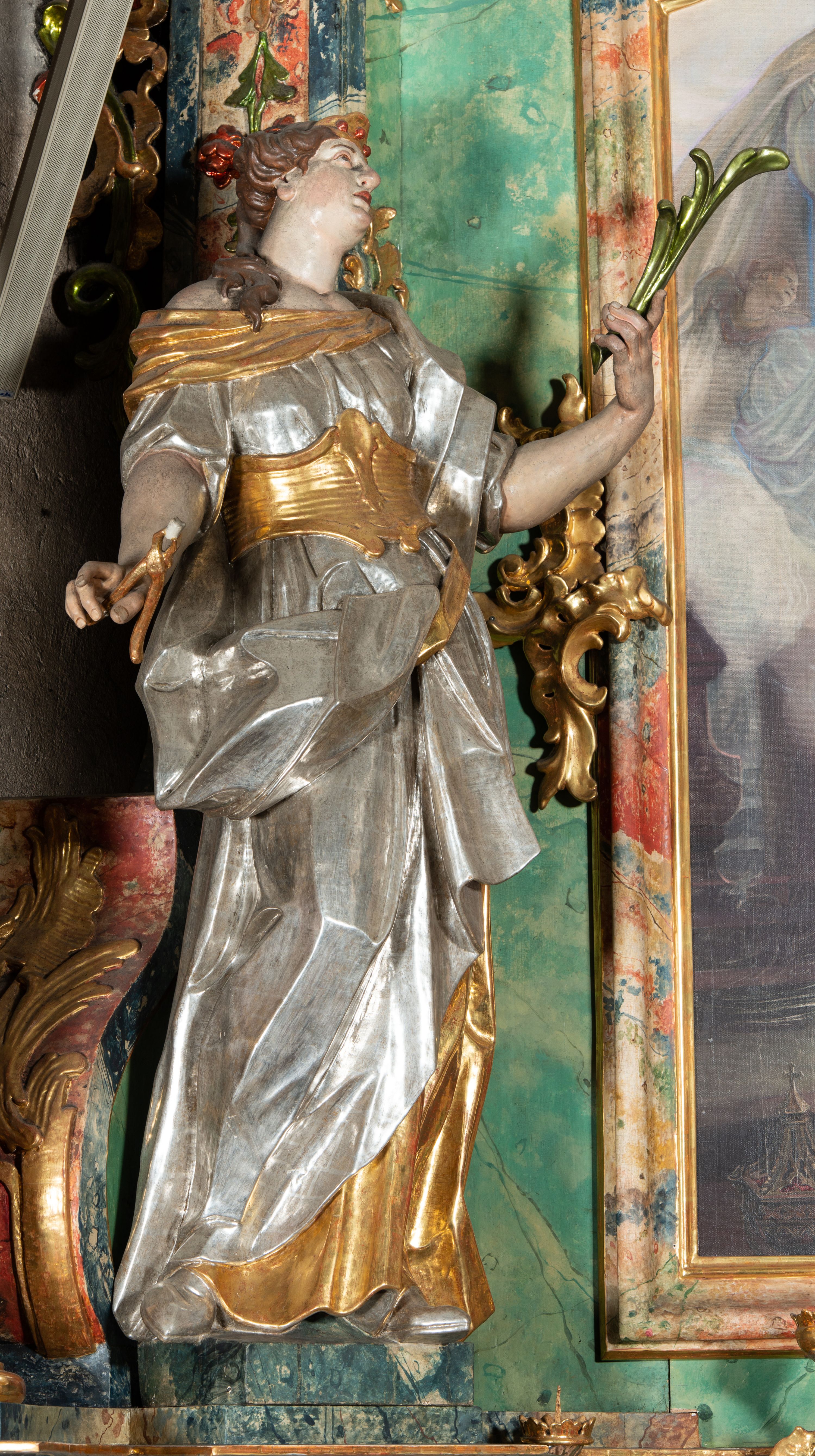 Rzeźba drewniana, polichromowana i złocona, umieszczona w rokokowym retabulum ołtarza bocznego. Całopostaciowe przedstawienie św. Apolonii, stojącej bokiem do widza, w lekkim kontrapoście, w lewej dłoni palma, w prawej obcęgi z zębem. Dzieło Johannesa Feega z Kiežmarku, z około 1770 roku.