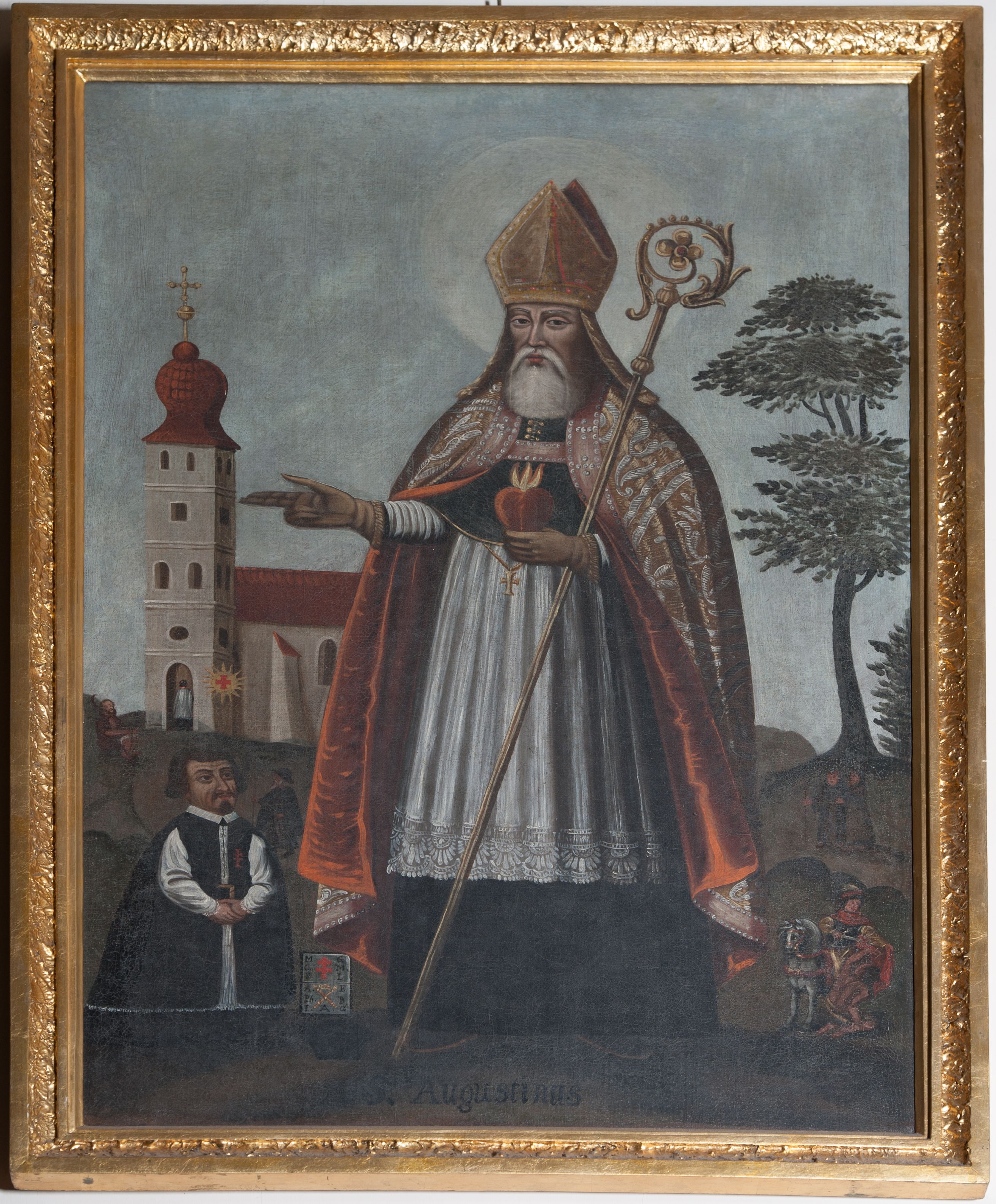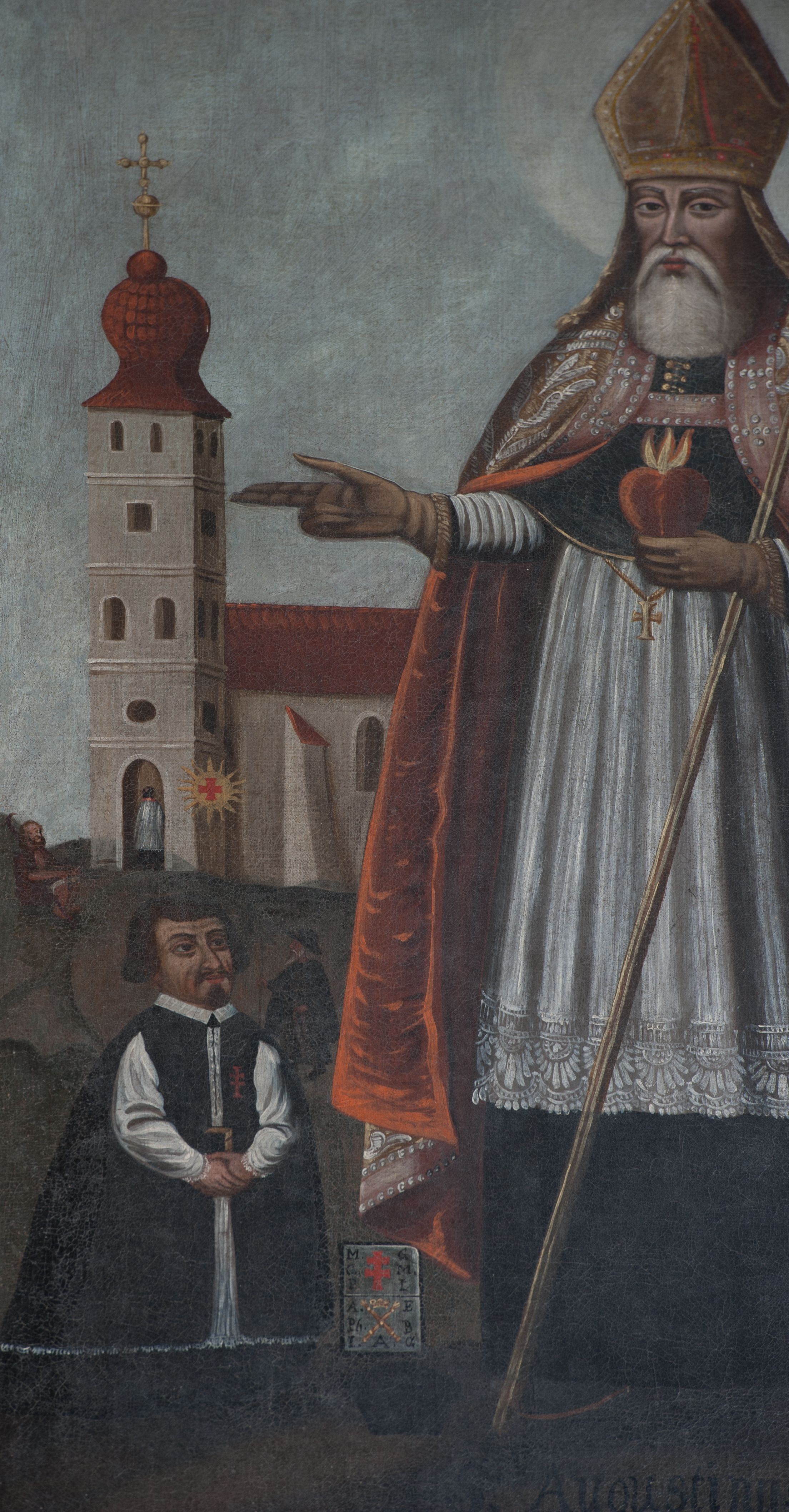 W centrum kompozycji został ukazany św. Augustyn, prawdopodobnie na tle kościoła w Miechowie. Zdania badaczy historii kościoła w Łapszach Niżnych na ten temat są jednak podzielone. Jedni uważają, że jest to architektura pierwszego kościoła w Łapszach Niżnych, zniszczonego przez husytów, inni iż jest to świątynia miechowska sprzed pożaru. I do tej drugiej hipotezy przychyla się znacznie większa część historyków sztuki i architektów. Na obrazie ukazano św. Augustyna, który związany jest z regułą zakonu Bożogrobowców, ponieważ jest ona oparta na nauczaniu tego świętego.