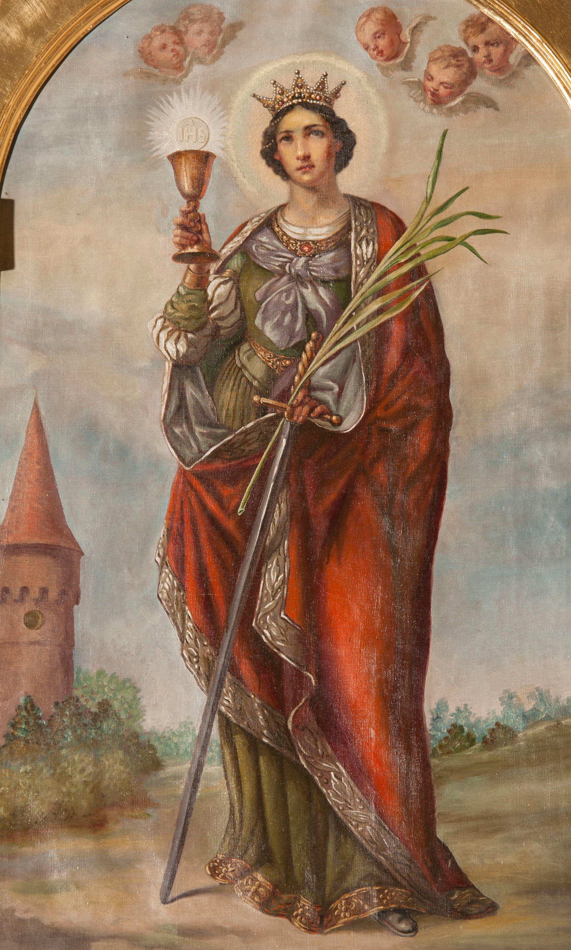Obraz przedstawia św. Barbarę, która żyła na przełomie III i IV wieku i była córką bogatego poganina. Została zamknięta w wieży, lecz pomimo odcięcia od świata z własnej woli przyjęła wiarę chrześcijańską. Sąd skazał ją na chłostę; ostatecznie została zamordowana w Nikomedii w 306 roku. Święta została przedstawiona w sposób konwencjonalny – jako młoda kobieta, z atrybutami odnoszącymi się do jej historii. Trzyma w dłoniach kielich z hostią nawiązujący do Komunii Świętej, której udzielił jej Chrystus po poddaniu jej torturom, liść palmowy, symbol jej męczeńskiej śmierci poniesionej według tradycji z rąk własnego ojca przy użyciu miecza, który opiera o ziemię. Obraz z przedstawieniem św. Barbary należy do nurtu historyzmu czerpiącego inspiracje formalne oraz stylistyczne z dawnych epok. Święta została odziana w suknię przypominającą strój bogatych kobiet epoki renesansu – z gorsetem oraz bufiastymi rękawami i haftami, wieża w której ją więziono nawiązuje stylistycznie do średniowiecznych budowli obronnych. Obraz cechuje dobry poziom wykonania, czytelna kompozycja oraz dbałość o detale.