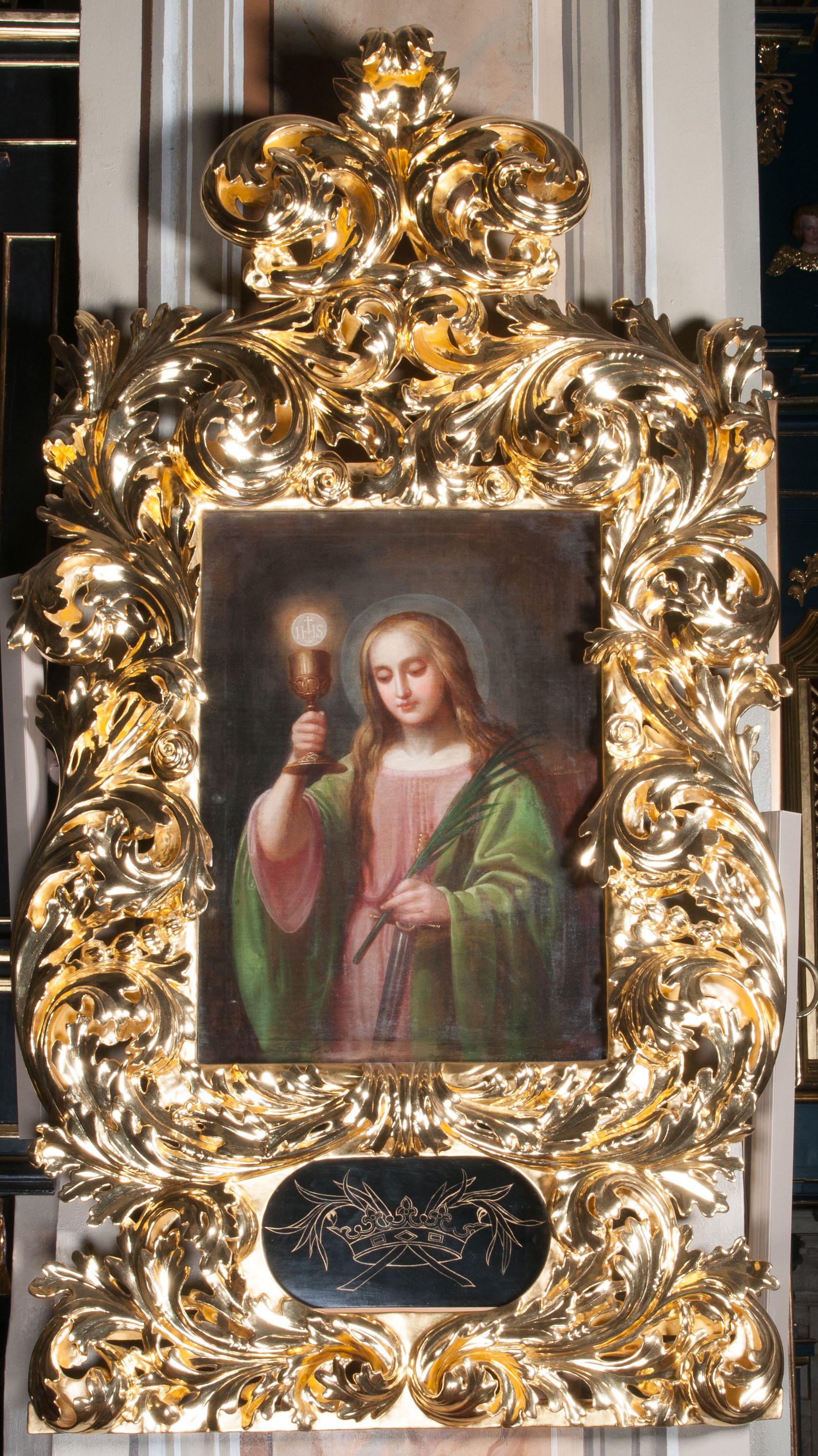 Dzieło, które obecnie można oglądać na filarze nawy głównej przeszło, od czasów powstania jego najstarszej części, szereg przemian. Uwagę przykuwa rozbudowana, ażurowa rama utworzona z bujnych, ułożonych symetrycznie liści akantu, która stanowiła prawdopodobnie dawniej zwieńczenie ołtarza. Świadczy o tym wykorzystany ornament oraz prosta dolna krawędź ramy przystosowana do scalenia jej ze strukturą nastawy. Ołtarz mógł pochodzić z kościoła św. Klemensa lub z innego kościoła w Wieliczce. Akantowa rama z początku XVIII wieku to przejaw powtórnej mody na użycie tego ornamentu, która rozpoczęła się w drugiej połowie XVII wieku. Z ażurowo rzeźbionych liści konstruowano przedmioty rzemiosła artystycznego, ramy obrazowe, a nawet całe ołtarze. Stanowiąc część zwieńczenia musiała zawierać przedstawienie o tematyce religijnej odpowiadające wezwaniu ołtarza. Obecnie został wtórnie użyta jako rama dla dziewiętnastowiecznego obrazu pędzla Wojciecha Eljasza (1814-1904), który pochodził z okolic Bochni i uczył się w krakowskiej Szkole Sztuk Pięknych. W latach sześćdziesiątych XIX wieku brał udział w restauracji ołtarza mariackiego Wita Stwosza. Malował niemal wyłącznie obrazy o tematyce religijnej do kościołów w okolicach Krakowa, np. obraz pod tytułem „Serce Pana Jezusa” do Tenczynka, czy „Śmierć św. Benedykta” do kościoła w Imbramowicach. Obraz wiszący w wielickim kościele cechuje dobry poziom artystyczny. Świeta Barbara odzwierciedla typ urody ceniony w XIX wieku – święta ma duże, okrągłe oczy, wąski nos oraz drobne usta, na ramiona, plecy i dekolt opadają jej długie włosy.