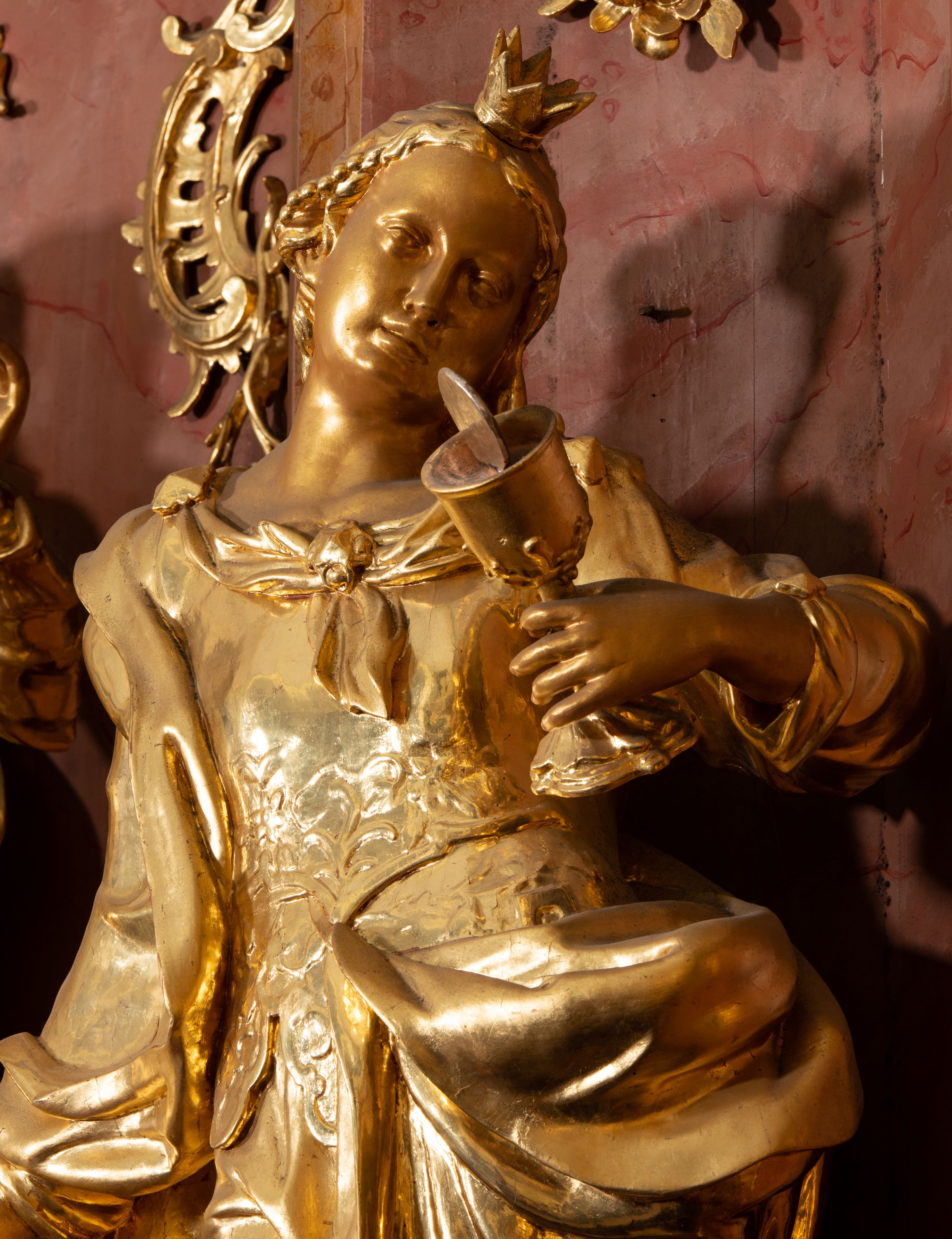 Figura św. Barbary powstała razem z ołtarzem głównym przed 1779 rokiem, a więc po pożarze kościoła (1752), ale przed jego ponowną konsekracją. Atrybutem św. Barbary jest kielich z hostią, gdyż przed śmiercią w zamknięciu anioł przyniósł jej Komunię Świętą oraz miecz, gdyż została ścięta.