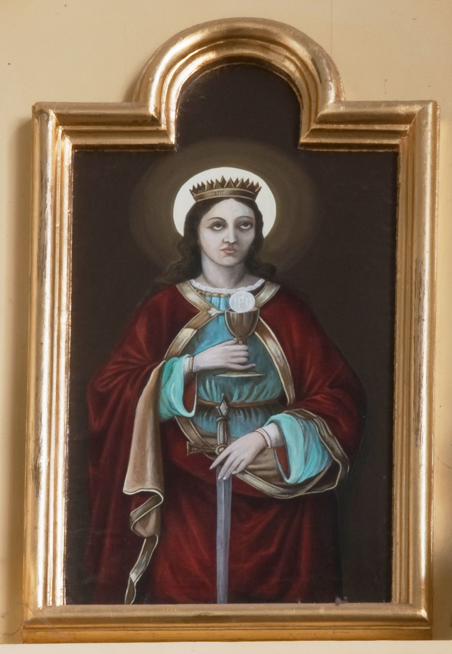 Obraz w kształcie stojącego prostokąta zamkniętego od góry łukiem wyniesionym. W centrum kompozycji, na jednolitym, ciemnym tle półpostaciowe, frontalne przedstawienie św. Barbary z głową zwróconą w trzech czwartych w lewo. Święta została ukazana jako młoda, ciemnowłosa kobieta o jasnej karnacji. Oczy skierowane ku górze, na głowie złota korona. Wokół niej świetlisty nimb. Postać w prawej ręce uniesionej na wysokość piersi trzyma kielich z hostią, lewą, ugięta w łokciu wspiera na głowicy miecza. Święta Barbara ubrana jest w jasnoniebieską suknię z długimi rękawami przewiązaną w pasie złotym sznurem oraz ciemnoczerwony płaszcz z szeroką, złotą lamówką. Podbicie płaszcza również w kolorze złotym.