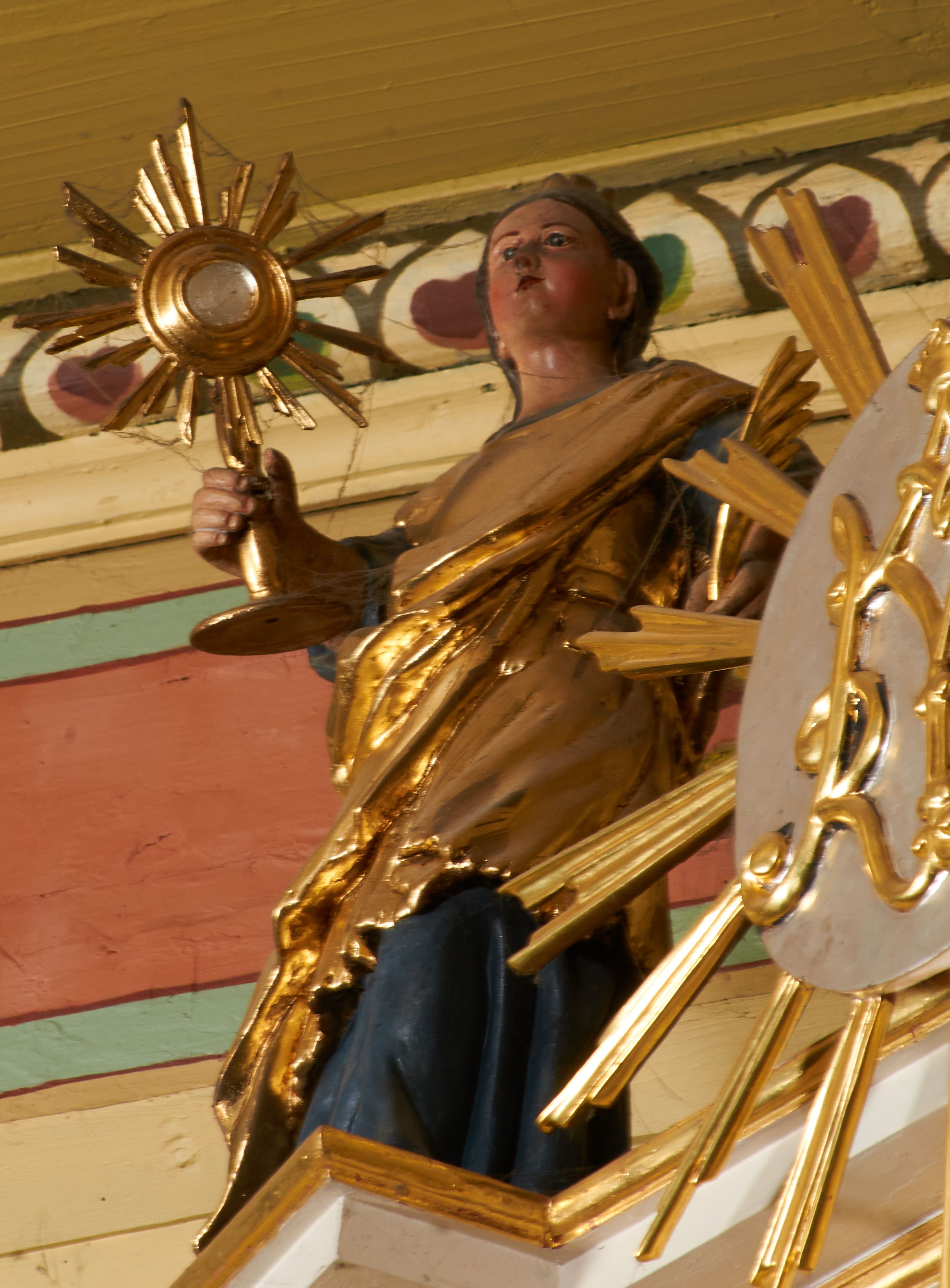 Postać ukazana jest frontalnie, z głową skierowaną delikatnie w lewo, w lewej ręce trzyma liść palmy, w prawej monstrancję. Święta ma okrągłą twarz o pełnych policzkach, okoloną długimi włosami spiętymi z tyłu głowy i opadającymi na plecy. Ubrana jest w długą, niebieską suknię spodnią, pozłacaną suknię wierzchnią sięgającą kolan, przepasaną w talii oraz pozłacany płaszcz przewiązany diagonalnie przez lewe ramię. Na głowie ma koronę. Polichromia naturalistyczna, część szat i atrybuty pozłacane.