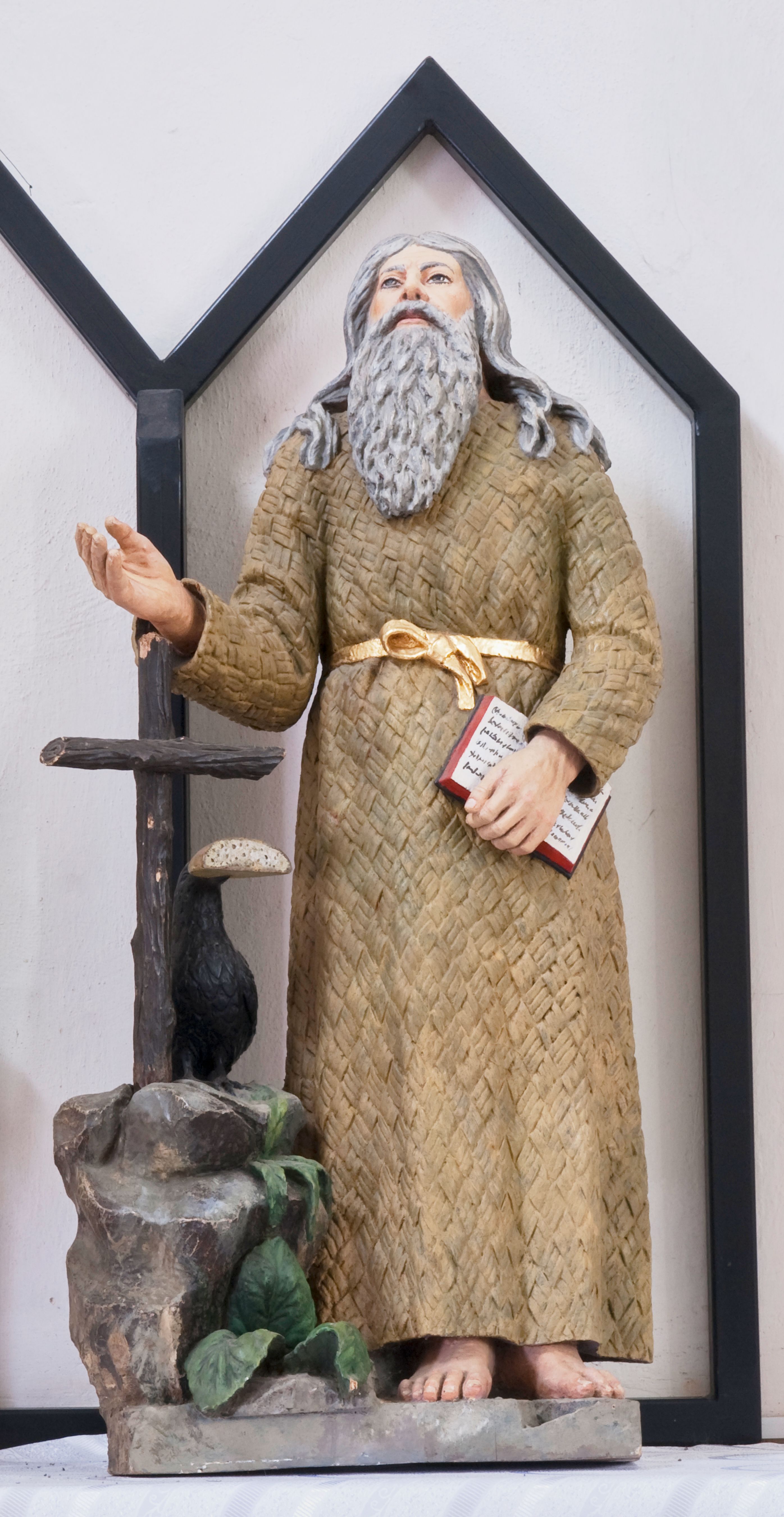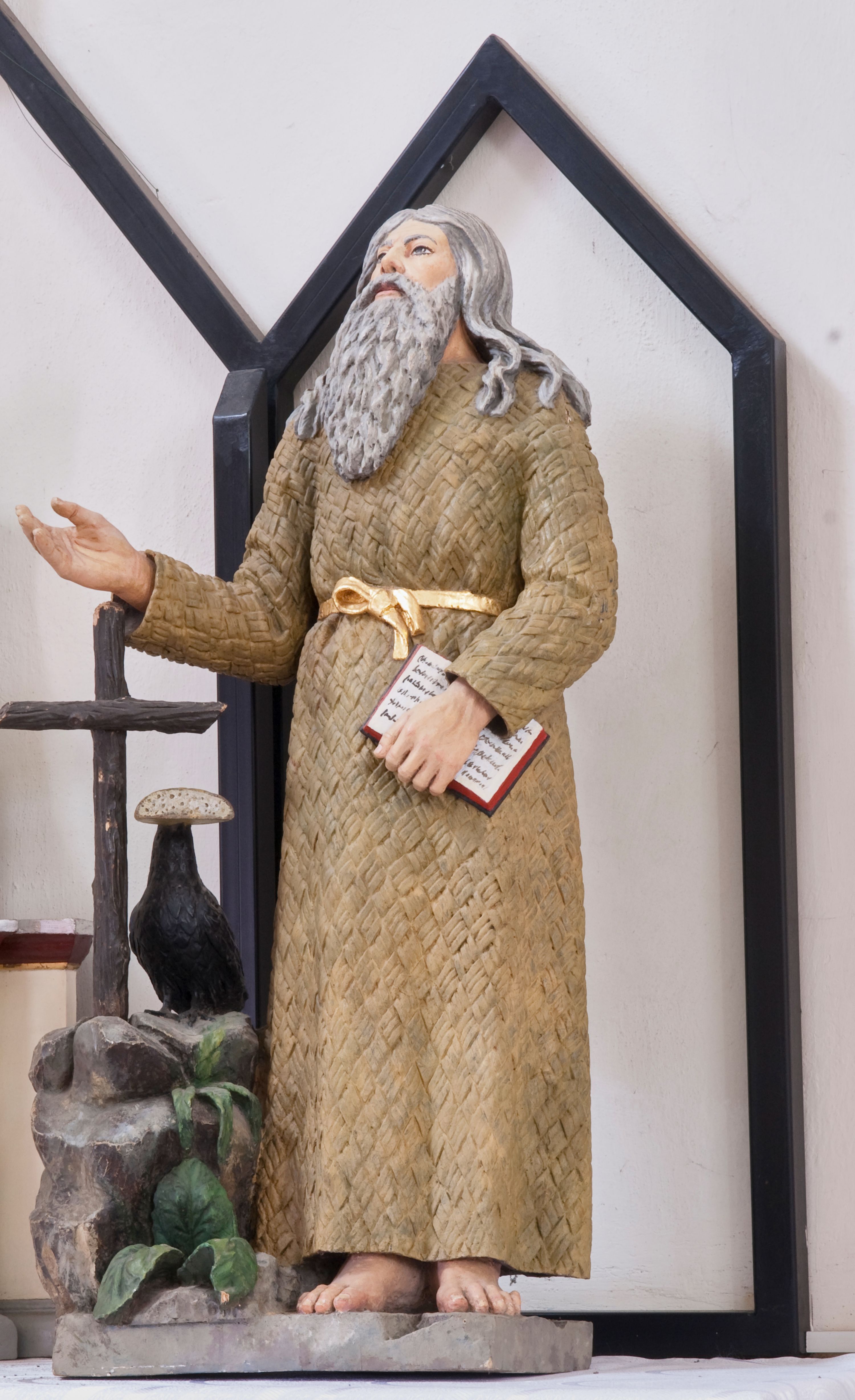 Św. Benedykt z Nursji żył na przełomie V i VI wieku. Był założycielem zakonu benedyktynów, autorem reguły benedyktyńskiej i pierwszym opatem klasztoru na Monte Cassino. W ikonografii chrześcijańskiej najczęściej bywa przedstawiany jako mężczyzna w czarnym habicie lub wierzchniej tunice z kapturem i szerokimi rękawami tzw. kukulli z brodą lub bez zarostu. Do jego atrybutów należą kielich z wężem, rozbity puchar, kruk z chlebem w dziobie, anioł z hostią i pastorał. Najczęściej bywa jednak przedstawiany z trzymaną w ręku księgą lub zwojem reguły benedyktyńskiej oraz mitrą opacką. Na omawianej rzeźbie ukazano go jako pustelnika, towarzyszy mu kruk z bochenkiem chleba w dziobie.