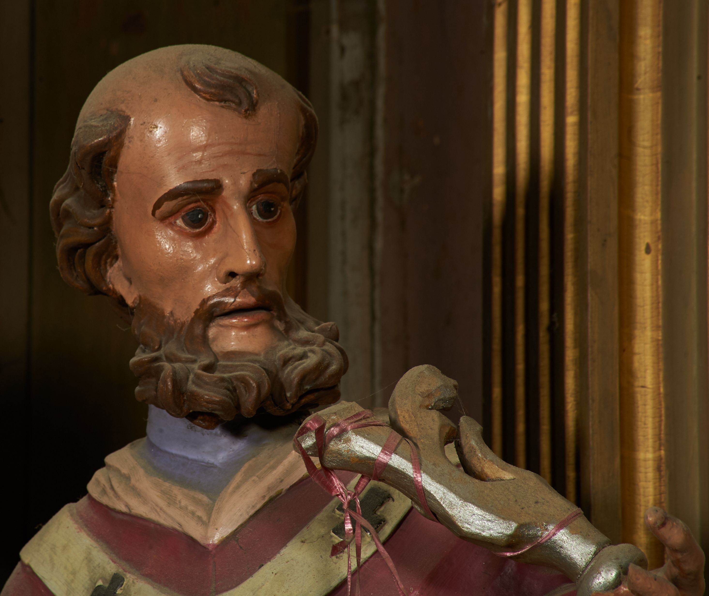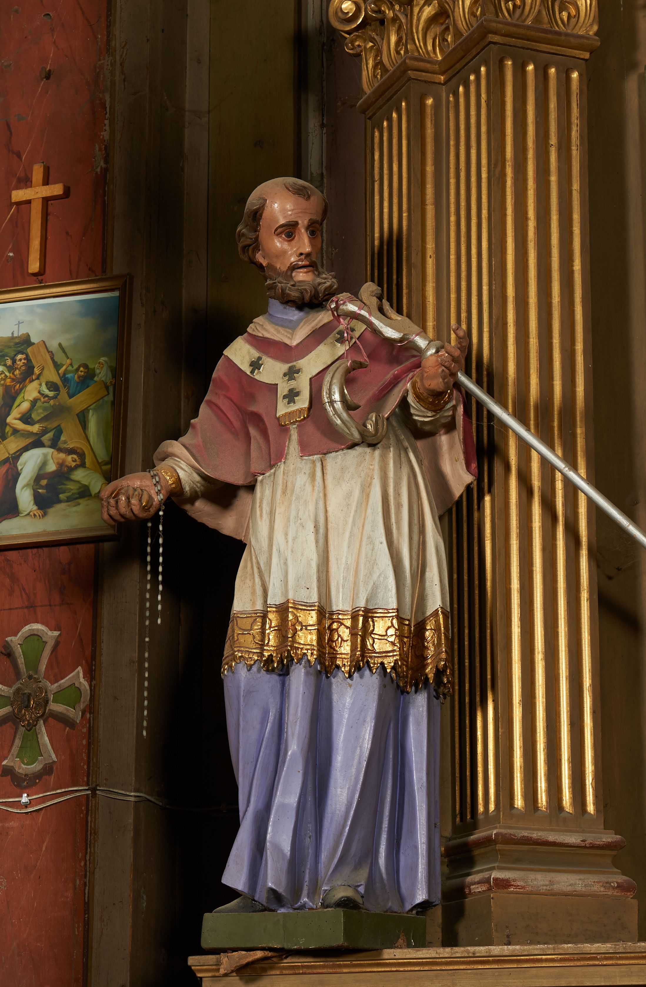 Silne zabrudzenia, przetarcia polichromii i złoceń. Ubytki mechaniczne – brak kciuka lewej dłoni.