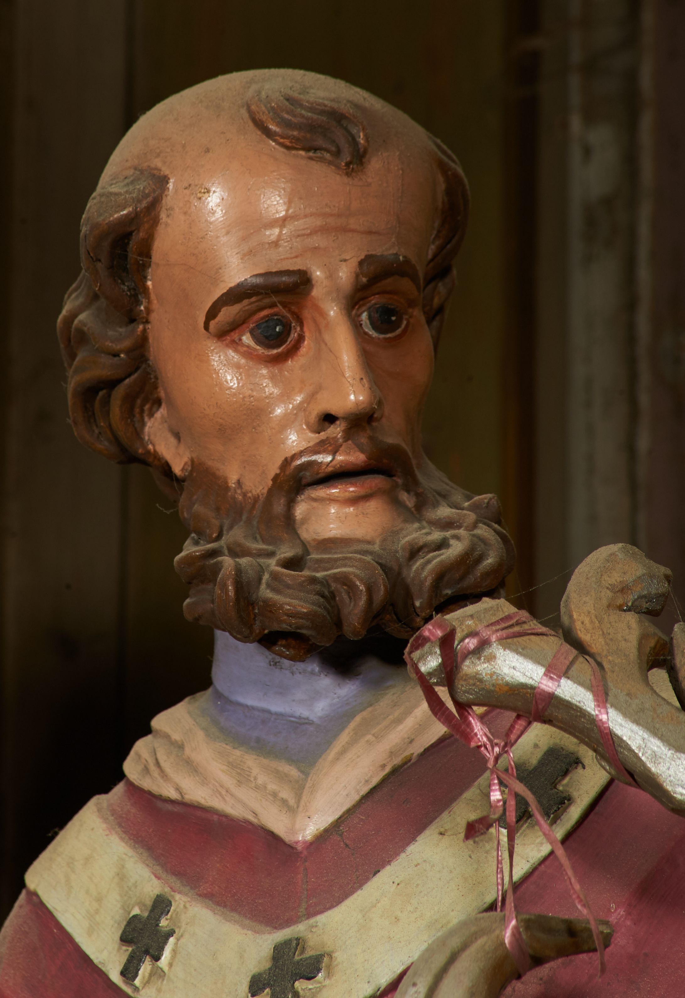 Figura drążona z tyłu, ustawiona na niewielkim prostopadłościennym postumencie. Święty ukazany jest frontalnie, lekko odchylony, z głową skierowaną w lewo, w kontrapoście. Obie ręce ma rozłożone na boki, w prawej dłoni trzyma kamień (?). Twarz ma szczupłą, wyciągniętą, o wysokim czole, silnie zaznaczonych kościach policzkowych; ma duże oczy, lekko garbaty nos oraz wąskie, rozchylone usta. Twarz okolona jest gęstą, brązową brodą, na głowie ma łysinę, po bokach głowy i nad czołem kręcone włosy. Święty ubrany jest w jasnofioletową sutannę, białą, złoconą przy brzegu komżę, czerwoną pelerynkę z różową podszewką oraz paliusz. Polichromia naturalistyczna w partiach ciała.