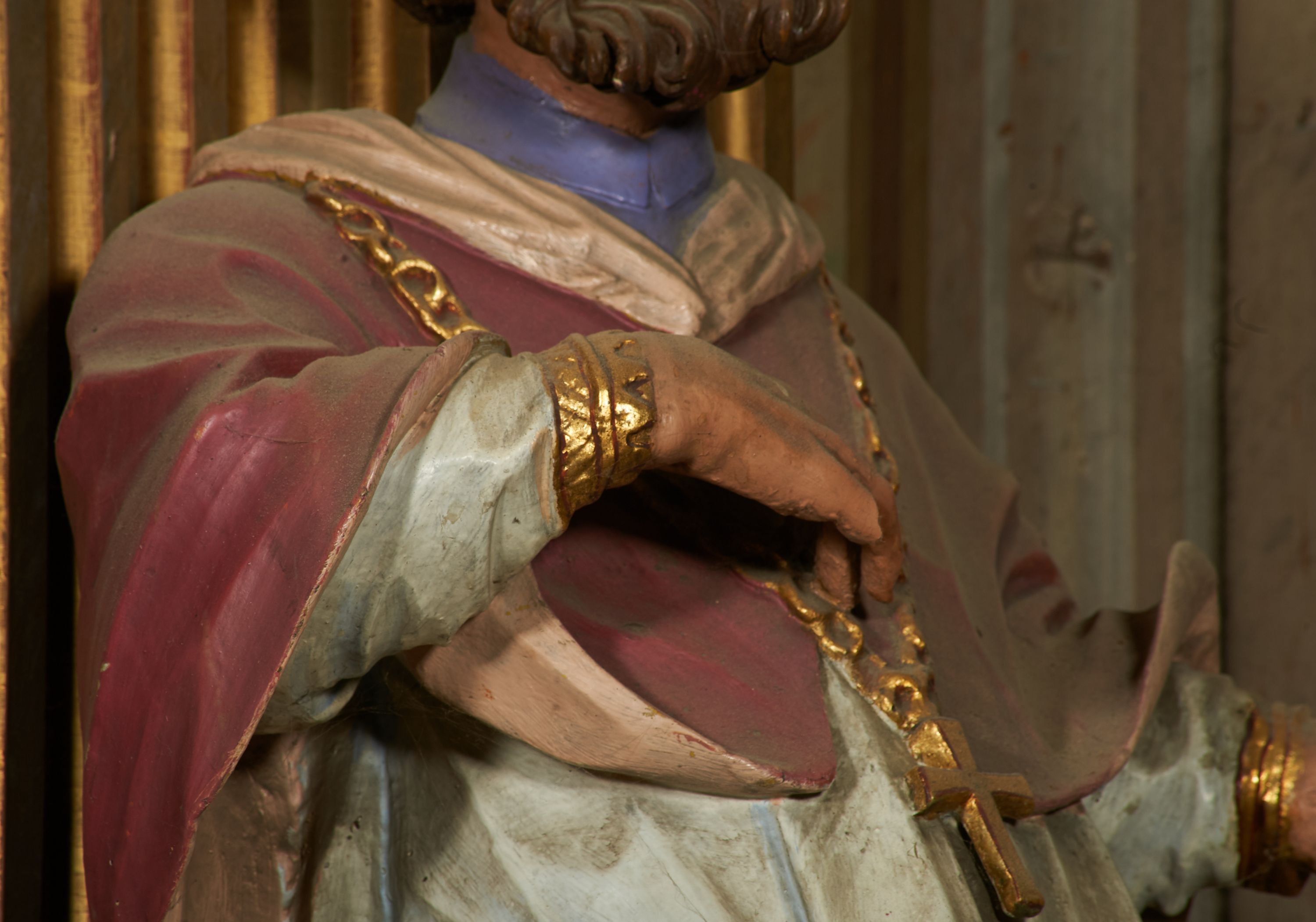 Figura drążona od tyłu, ustawiona na niewielkim prostopadłościennym postumencie. Święty ukazany jest frontalnie, w kontrapoście, o odchylonej sylwetce, z głową skierowaną w prawo. W lewej, ugiętej i odchylonej ręce trzyma laskę, prawą kładzie na piersi. Twarz ma szczupłą, podłużną o silnie zaznaczonych kościach policzkowych, dużych, migdałowatych oczach, lekko garbatym nosie i długich, wąskich, rozchylonych ustach, okoloną gęstą, brązową, kręconą brodą i kręconymi włosami. Święty ubrany jest w jasnofioletową sutannę, białą, złoconą przy brzegu komżę, czerwoną pelerynkę o różowej podszewce. Na piersi ma zawieszony pektorał. Przy lewej nodze biała, lamowana infuła ze złoconym krzyżem. Polichromia ciała naturalistyczna.