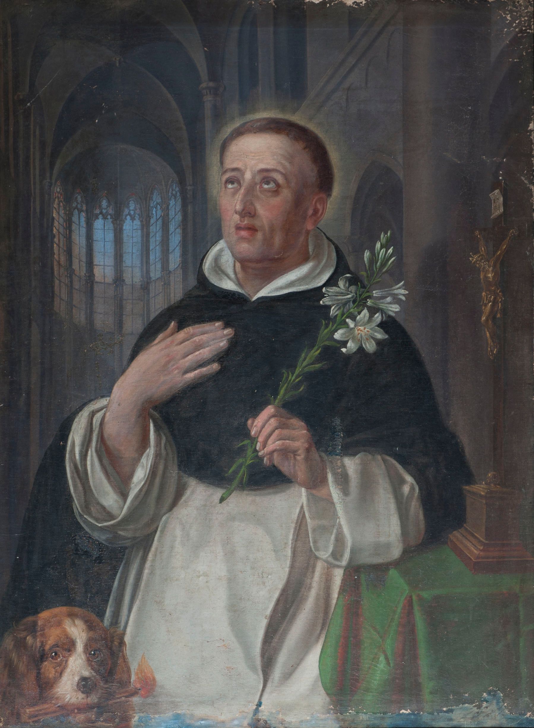 Święty Dominik urodził się w drugiej połowie XII wieku w Kastylii. Był kapłanem i kanonikiem oraz wędrownym kaznodzieją. Założył zakon dominikanów. Najczęściej jest przedstawiany w habicie dominikańskim z psem, który zwykle trzyma zapaloną pochodnię. Pies symbolizuje wierność oraz nawiązuje do nazwy założonego przez Dominika zakonu na zasadzie gry słów – „Domini canes” znaczy w tłumaczeniu tyle co „psy Pańskie”. Sposób malowana zdradza wpływy malarstwa przełomu XIX i XX wieku. Twarz świętego została zindywidualizowana, mimo iż w sposobie ukazania sceny przeważa rysunkowość, pewne fragmenty zostały potraktowane impresyjnie. Prawidłowo oddane proporcje świętego oraz rozległa przestrzeń, w której został ukazany, świadczą o wysokich umiejętnościach autora dzieła.