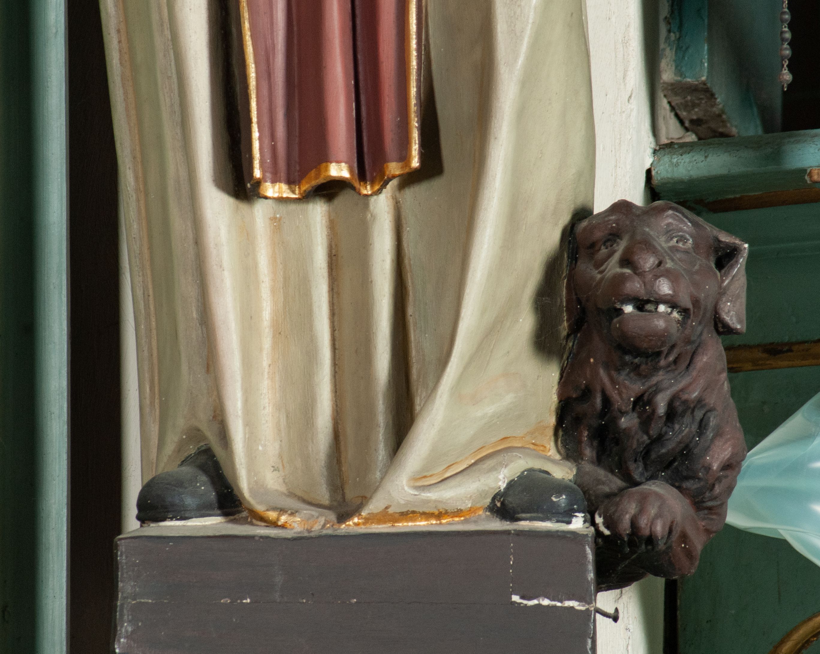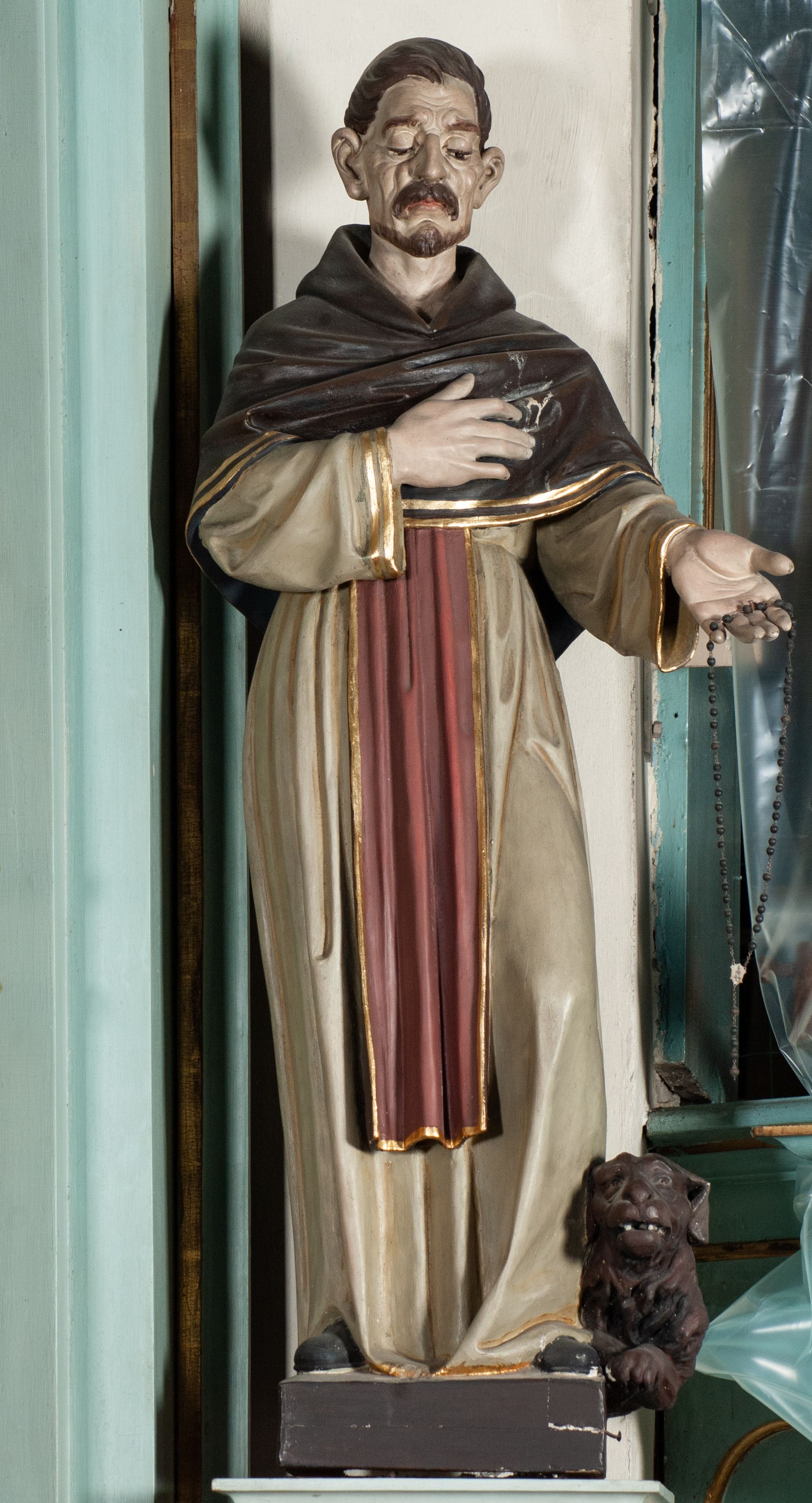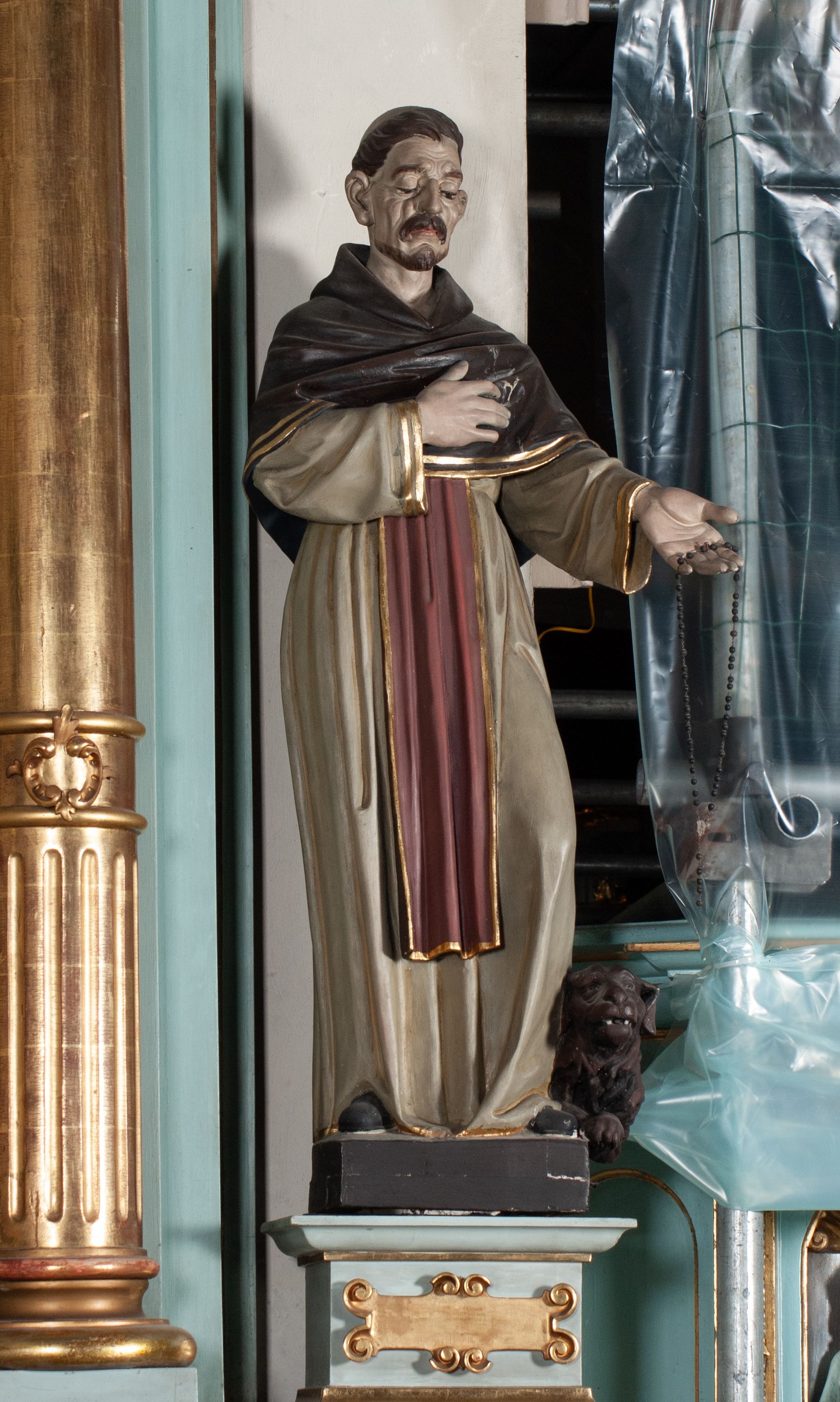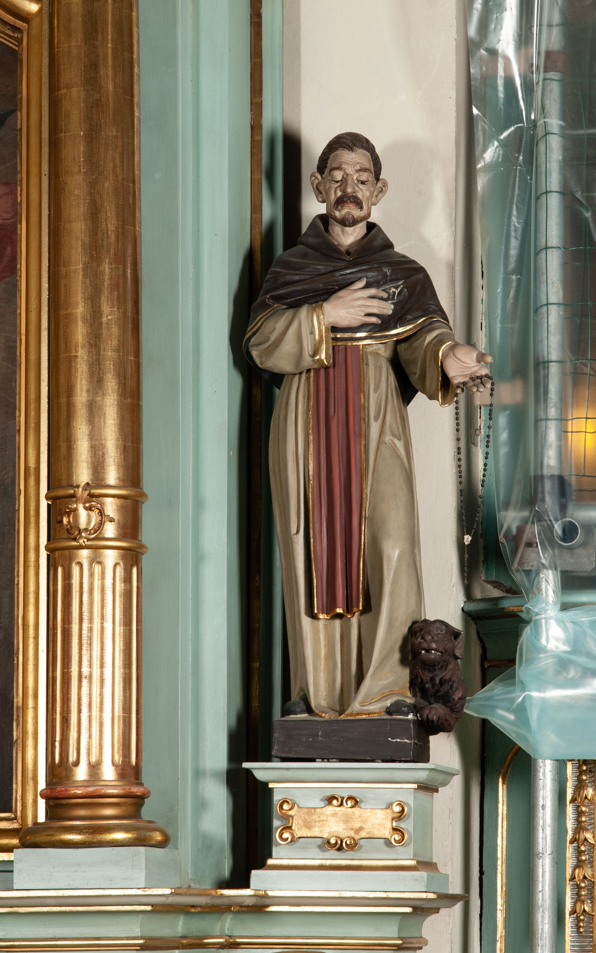 Oba ołtarze boczne razem z ich dekoracją figuralną zostały najpewniej wykonane w pierwszej połowie XIX wieku. Figura przedstawia św. Dominika, który szczególnie związany jest z kultem różańca, gdyż uznawano go za pierwszego propagatora modlitwy różańcowej. Postać psa ma symboliczne znaczenie związane z legendą o śnie Joanna z Azy – matki św. Dominika.