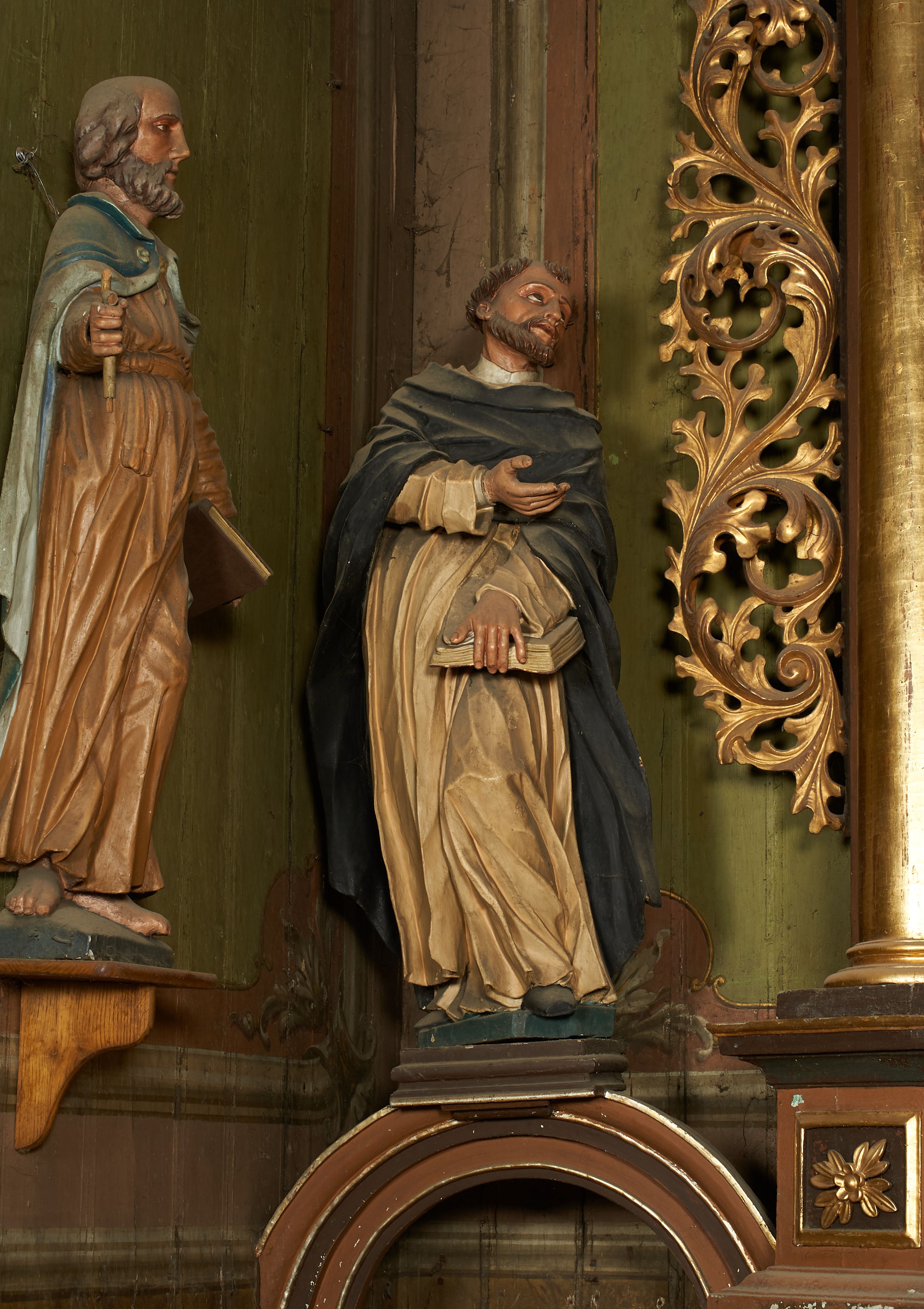 Figura drążona z tyłu, ustawiona na niewielkim postumencie. Święty ukazany frontalnie, pochylony w lewo, z uniesioną głową, w silnym kontrapoście. Lewą ręką przytrzymuje z przodu, na udzie księgę, prawą ugiętą, kieruje w lewo. Twarz ma szczupłą, o głęboko osadzonych, dużych oczach, skierowanych w górę, dużym nosie oraz wąskich, rozchylonych ustach. Twarz okolona jest krótką brodą oraz krótkimi włosami, na głowie tonsura. Święty ubrany w obficie fałdowany, biały habit dominikański oraz czarny płaszcz z kapturem. Polichromia ciała naturalistyczna.
