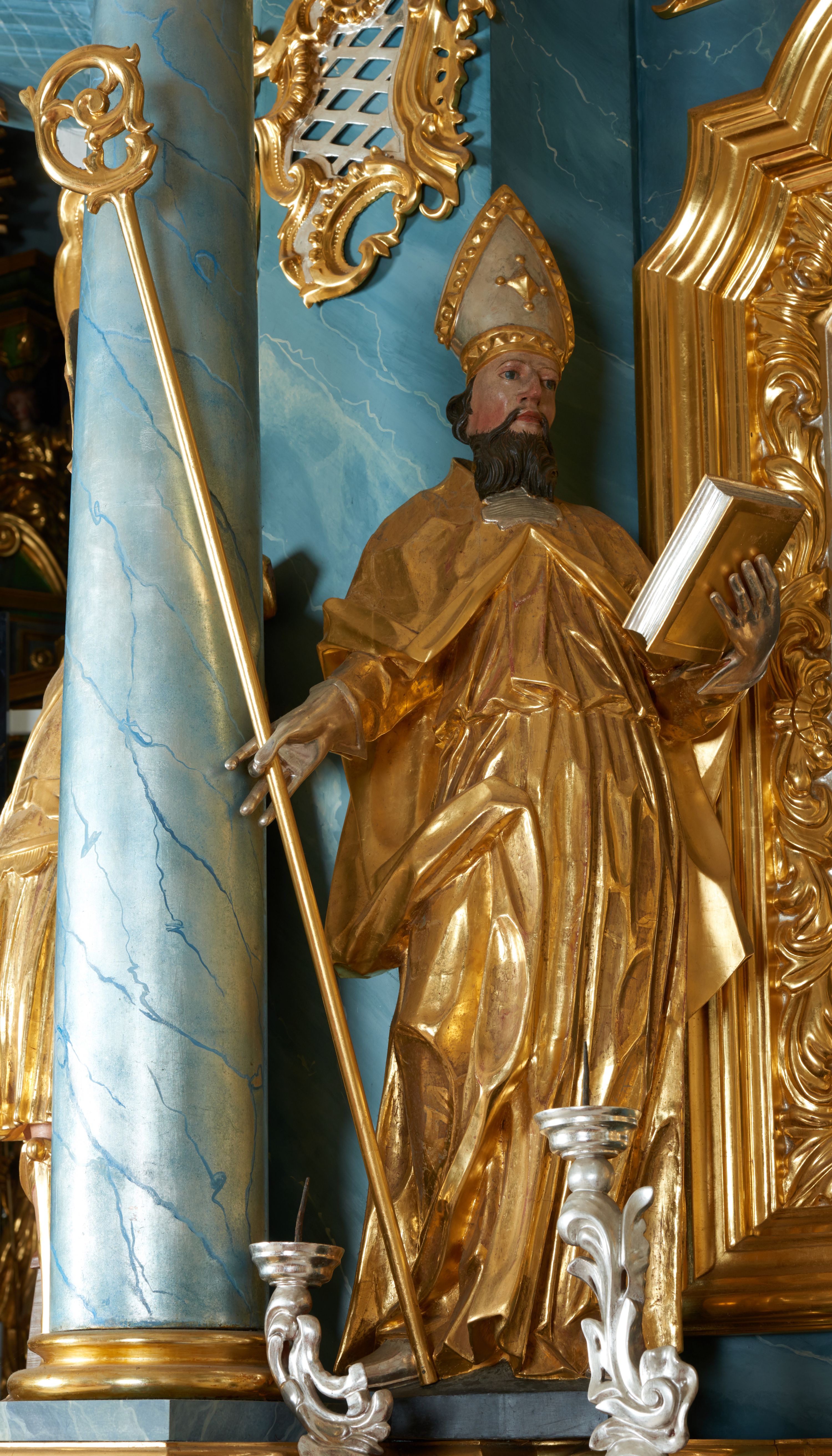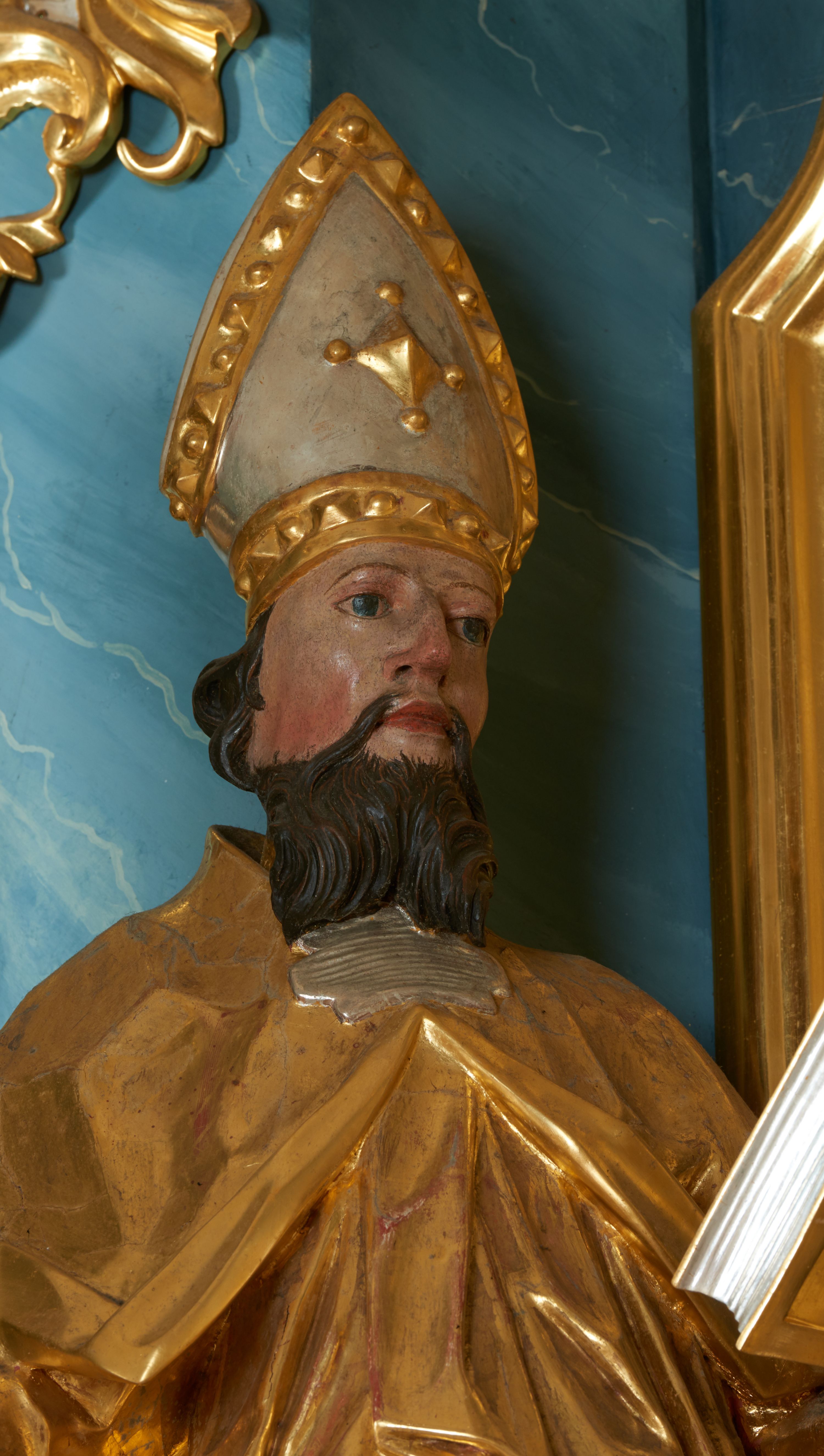 Rzeźba ścięta z tyłu, drążona, zwrócona frontalnie, w kontrapoście, lekko przechylona w tył. Święty w lewej ręce podtrzymuje zamkniętą księgę, w prawej trzyma pastorał. Twarz ma pociągłą o migdałowatych oczach, lekko garbatym nosie, pełnych ustach, okoloną wąsami i falistą brodą oraz krótkimi, kręconymi włosami. Postać ubrana jest w albę przewiązaną w pasie oraz kapę zapiętą na piersi, z połą tkaniny zawiniętą na prawej nodze, na głowie ma infułę, na dłoniach rękawiczki. Ciało polichromowane naturalistycznie, szaty oraz atrybuty złocone i srebrzone.