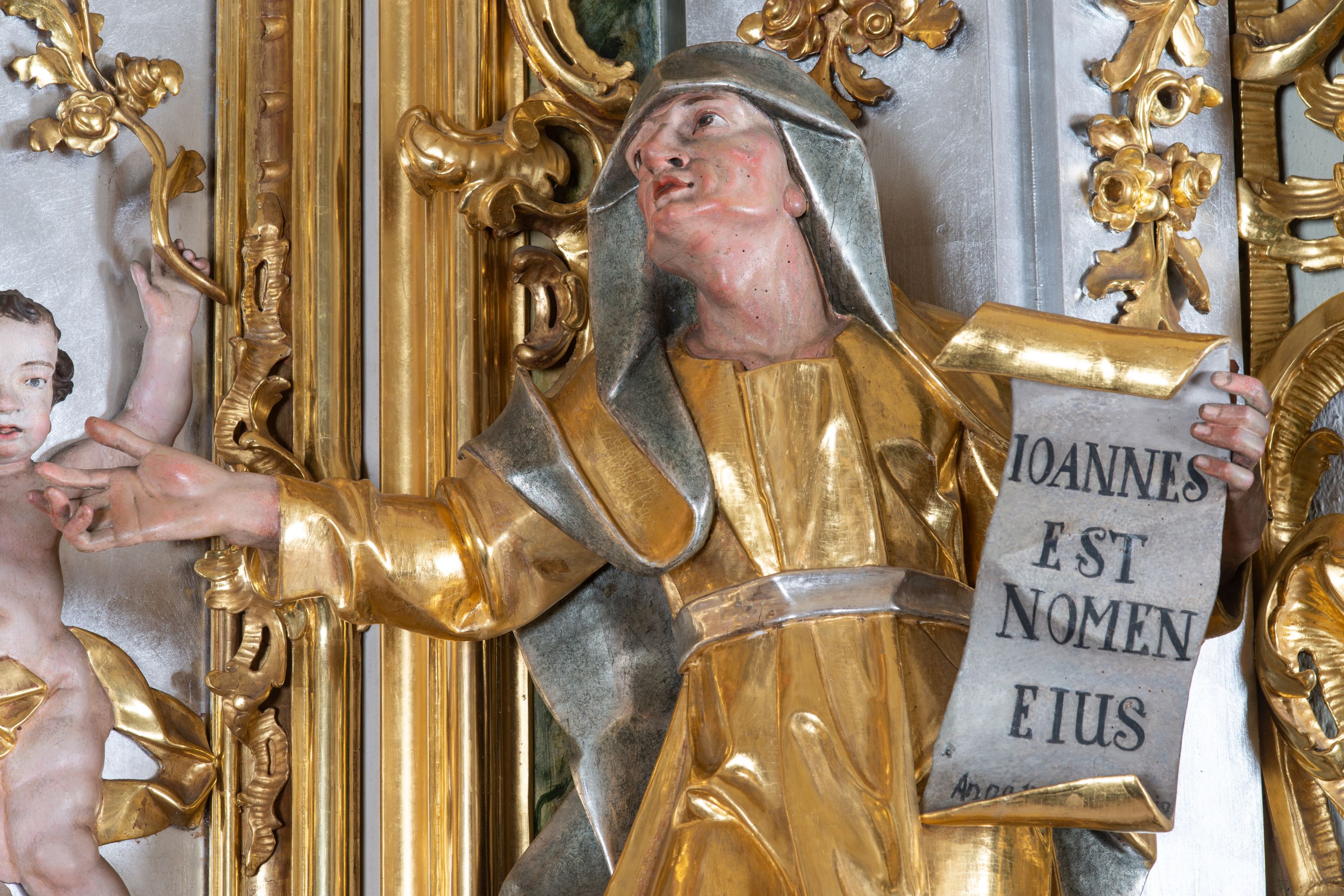 Rzeźba umieszczona jest w ołtarzu bocznym, wykonanym w latach 1777-1782. Po raz pierwszy został odnotowany w księdze rachunkowej kościoła „Rationes Ecclesiae Felso Lapsensis” w latch 1777-1778, w której zapisano zakup obrazów przedstawiających Najświętszą Marię Pannę, św. Jana Chrzciciela, św. Walentego oraz św. Sebastiana: „Pro imaginibus B.M.V. et Joanni Baptista, S. Valenti Ep. Mart et S. Sebastiani Mart. 24 Rfl”. Obecnie obraz św. Jana Chrzciciela znajduje się w zwieńczeniu tego ołtarza. Z kolei obraz św. Walentego przewidziany był do ołtarza głównego (obecnie wisi nad zakrystią), a obraz św. Sebastiana do drugiego ołtarza bocznego. Nie wiadomo gdzie znajdował się i gdzie obecnie przechowywany jest wizerunek Najświętszej Marii Panny. Pod kolejną datą wydatków zapisanych w księdze rachunków kościoła odnotowano twórcę rzeźb umieszczonych na ołtarzu – Johanna Feega.