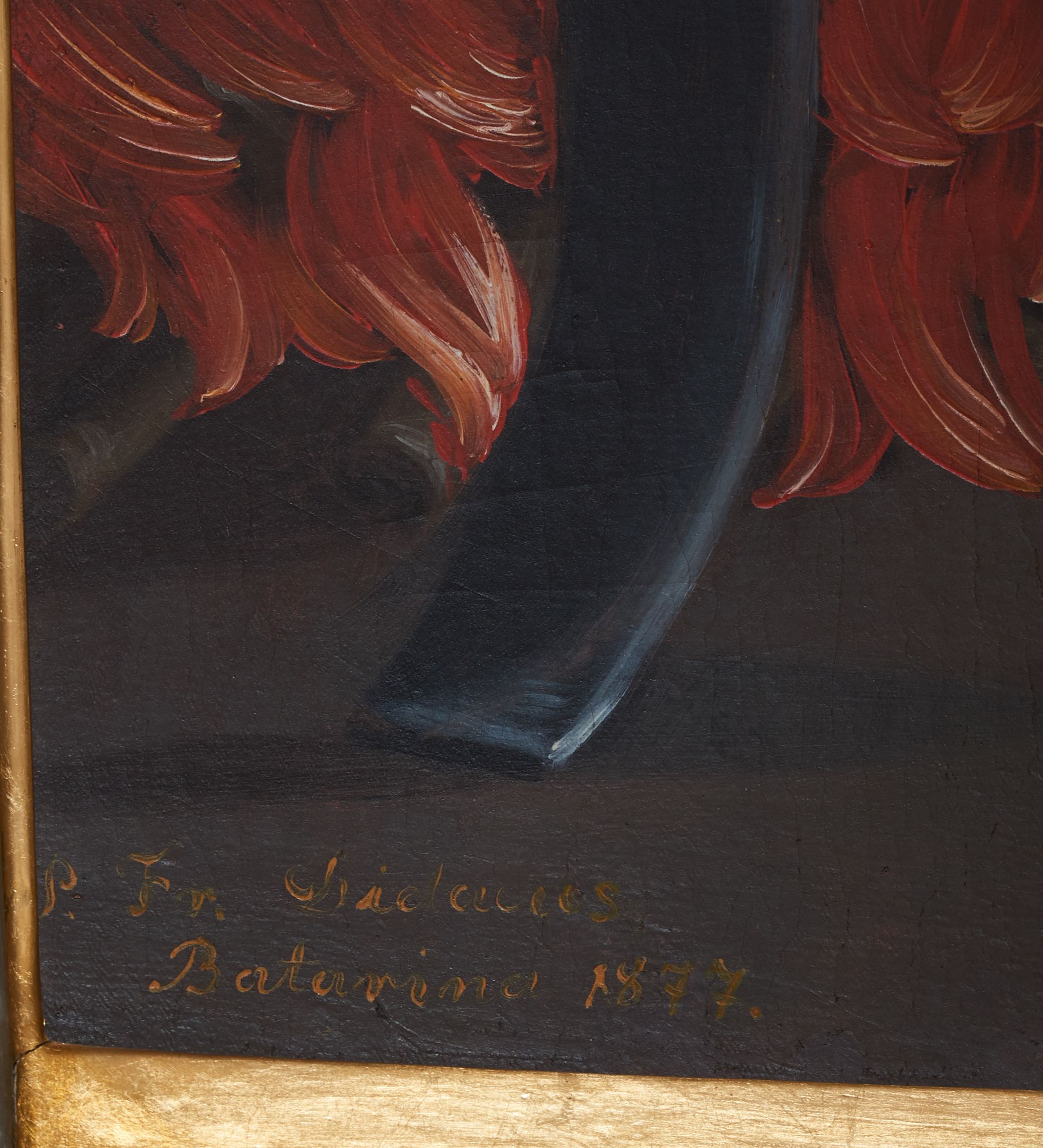 Kolorystyka obrazu jasna, intensywna, głębia wydobyta światłocieniem. Rama profilowana, zamknięta łukiem nadwieszonym, zdobiona w narożach i w połowie wysokości boków palmetami. W polu łuku korona i dwa skrzyżowane pióra.