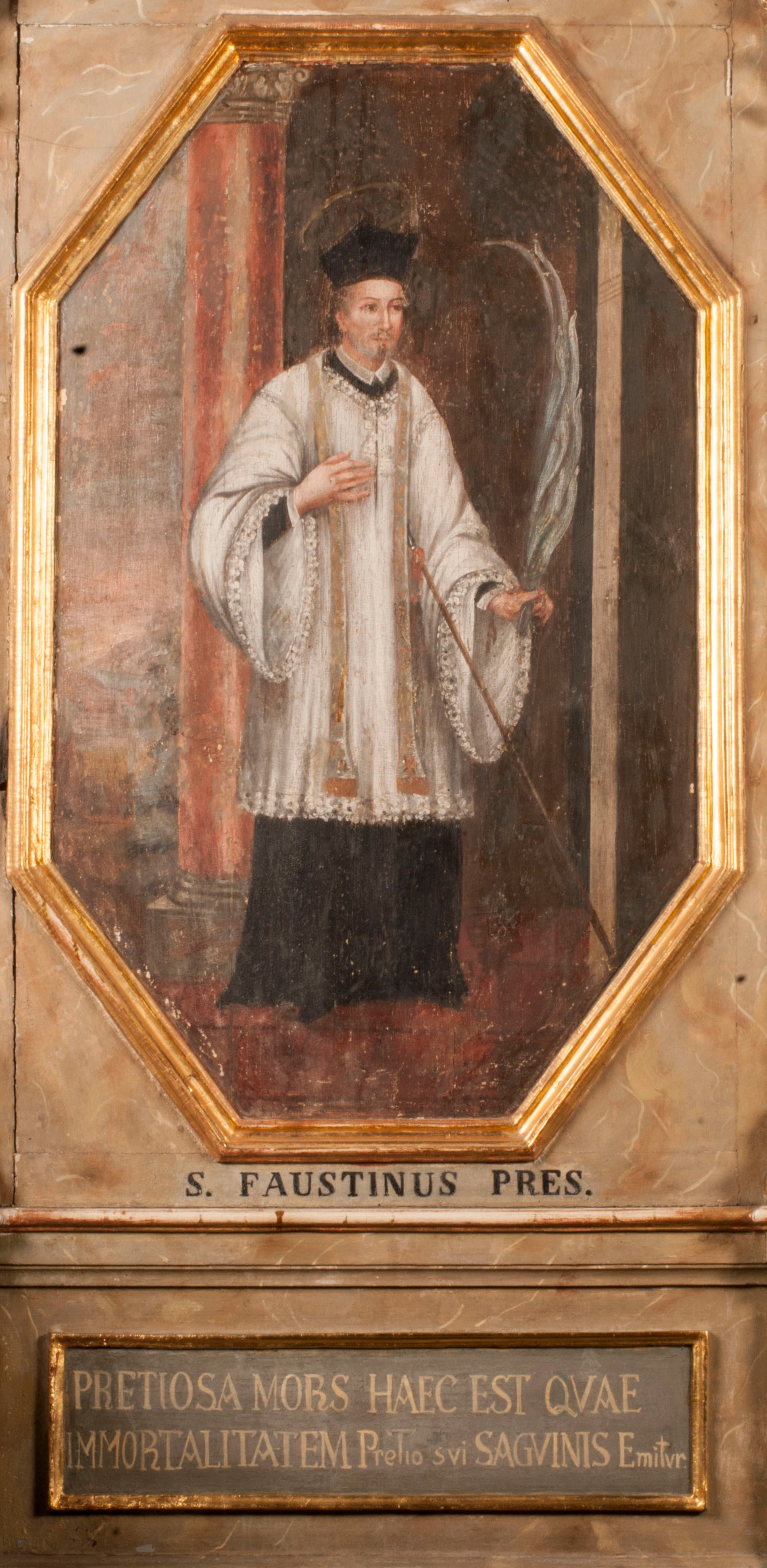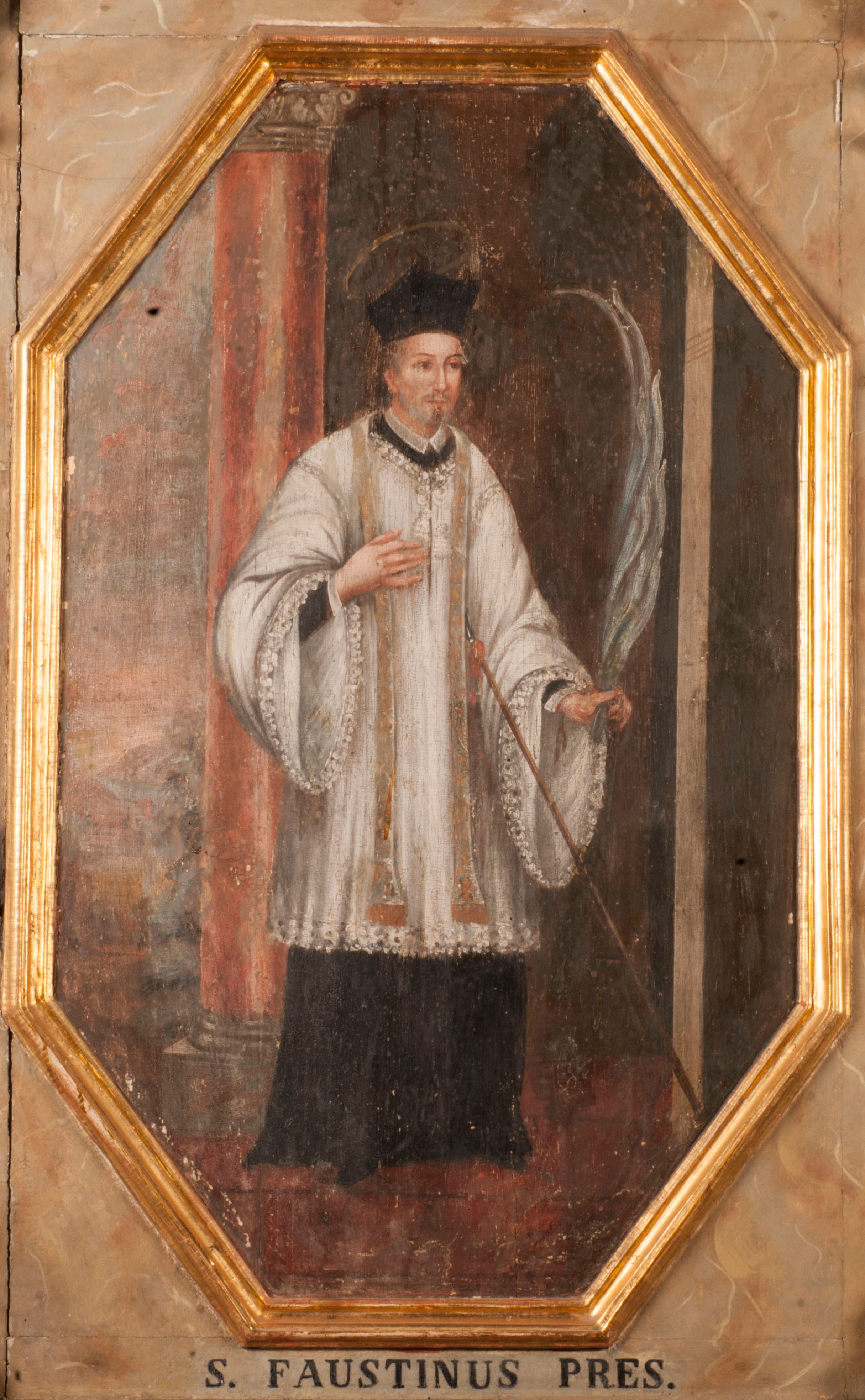 Kompozycja obrazu została ujęta w profilowaną, złoconą ramę w kształcie prostokąta o ściętych narożnikach. Święty Faustyn został ukazany we wnętrzu architektonicznym z brunatną posadzką na tle czerwonej kolumny z korynckim kapitelem, wspartej na niskim postumencie. Z lewej strony widoczny jest prześwit z rozległym krajobrazem utrzymanym w tonacji brunatnoczerwonej z zamglonym błękitnoszarym niebem. Świętego przedstawiono frontalnie w całej postaci. Jego głowa ujęta została w trzech czwartych w lewo. W lewej, opuszczonej ręce trzyma srebrnobiałą palmę męczeństwa, a prawą przyciska do piersi. Jest to mężczyzna w średnim wieku o owalnej twarzy, dużych oczach i wydatnym nosie oraz nieznacznym zaroście uformowanym w hiszpańską bródkę. Krótkie włosy wysuwające się spod biretu ma zaczesane do tyłu. Ubrany jest w czarną sutannę z koloratką w formie kołnierzyka, odsłaniającą czubki butów, sięgającą kolan komżę z szerokimi rękawami wiązaną pod szyją i obszytą koronką. Na ramionach ma złotą stułę, a na głowie kapłański biret. Nad głową widoczny jest nimb talerzowy zaznaczony jasną kreską. O pierś świętego wsparta jest pod skosem włócznia skierowana grotem w serce. Pod obrazem widnieje czarny podpis „S(ANCTUS) FAUSTINUS PRES(BYTER)”. Poniżej, na płycinie stalli w prostokątnym, złoconym i profilowanym obramieniu inna inskrypcja „PRETIOSA MORS HAEC EST QUAE/ IMMORTALITATEM Pretio Svi SAGVINIS Emitur”.