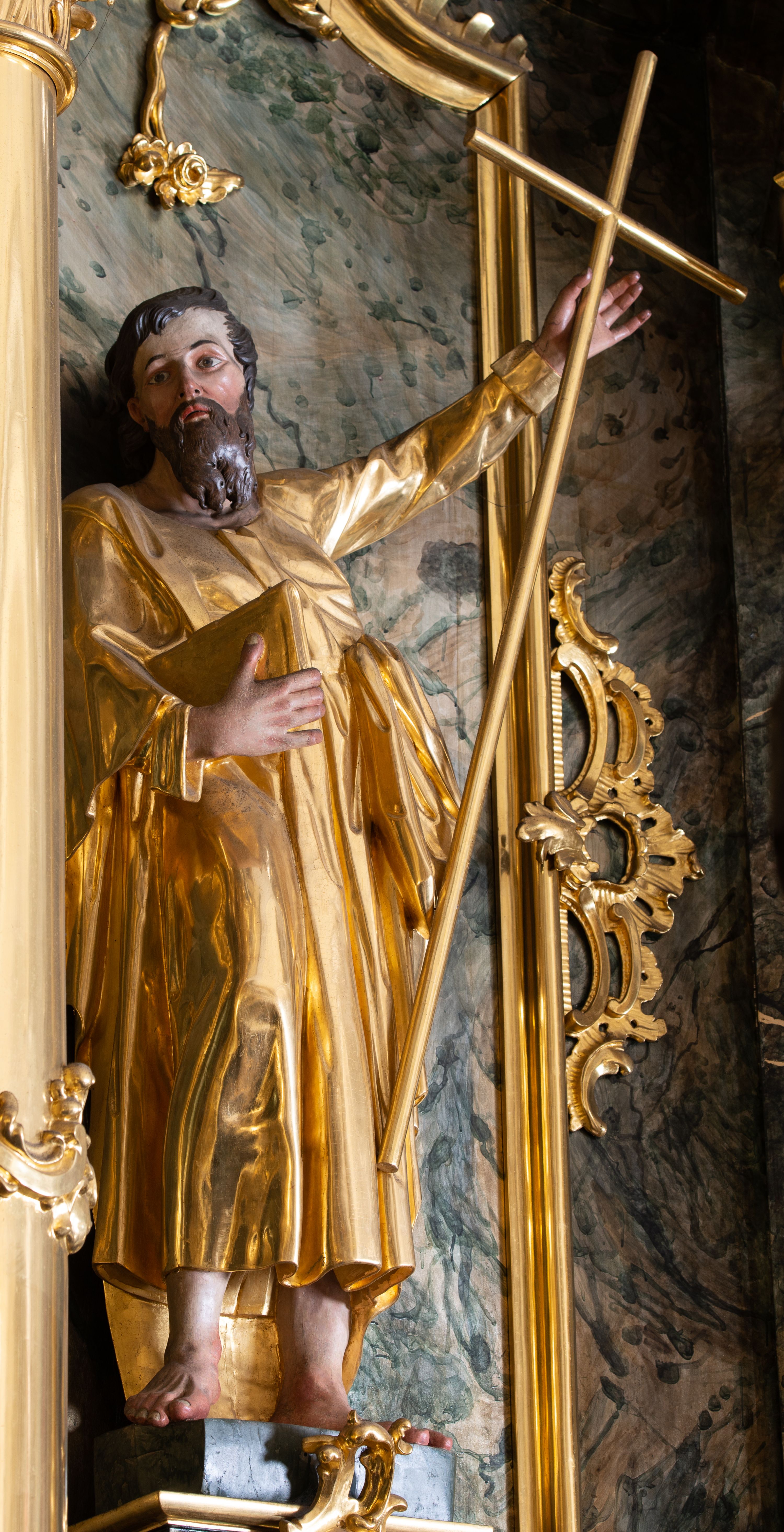 Rzeźba umieszczona jest na ołtarzu głównym, który po raz pierwszy został odnotowany w księdze rachunkowej kościoła „Rationes Ecclesiae Felso Lapsensis” w latch 1771-1772. W kolejnym roku zapisano w niej, iż w zwieńczeniu nastawy znajduje się grupa przedstawiająca Trójcę Świętą. W 1776 roku umieszczono informację o Janie Joanellim z Tolvano – fundatorze, który sprawił zdobienie ołtarza oraz zatrudnił czterech malarzy pracujących w kościele przez pięć tygodni. W latach 1777-1778, odnotowano zakup obrazów przedstawiających Najświętszą Marię Pannę, św. Jana Chrzciciela, św. Walentego oraz św. Sebastiana: „Pro imaginibus B.M.V. et Joanni Baptista, S. Valenti Ep. Mart et S. Sebastiani Mart. 24 Rfl”. Obraz św. Walentego znajdował się pierwotnie w polu głównym ołtarza, obecnie wisi na jednej ze ścian kościoła. Pod kolejną datą wydatków zapisanych w księdze rachunków świątyni odnotowano nazwisko twórcy rzeźb umieszczonych na ołtarzu – Johanna Feega. Jednakże analiza stylistyczna dzieł pozwala wyodrębnić dwóch twórców: Johanna Feega oraz jego brata Franciszka, twórcę rzeźby św. Filipa.