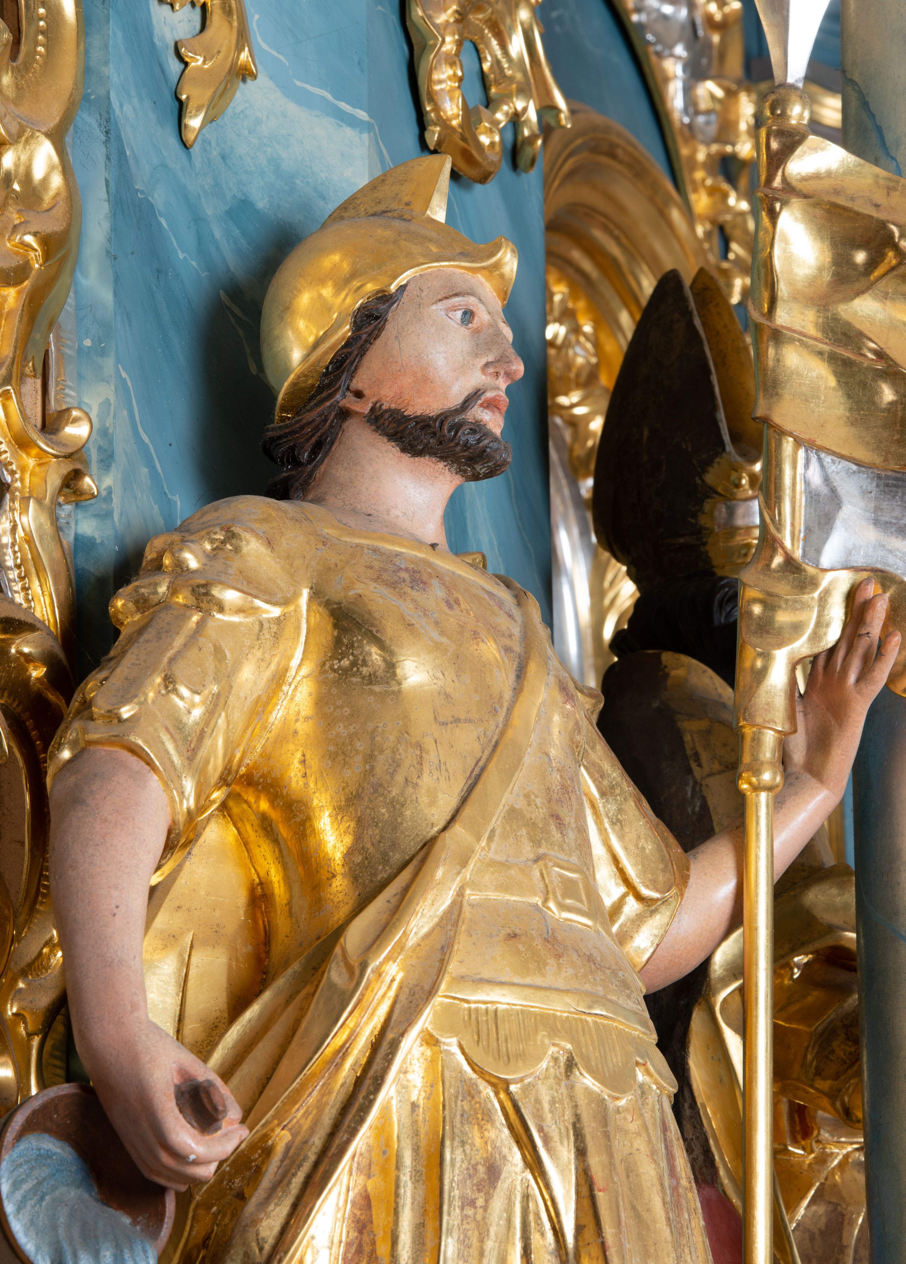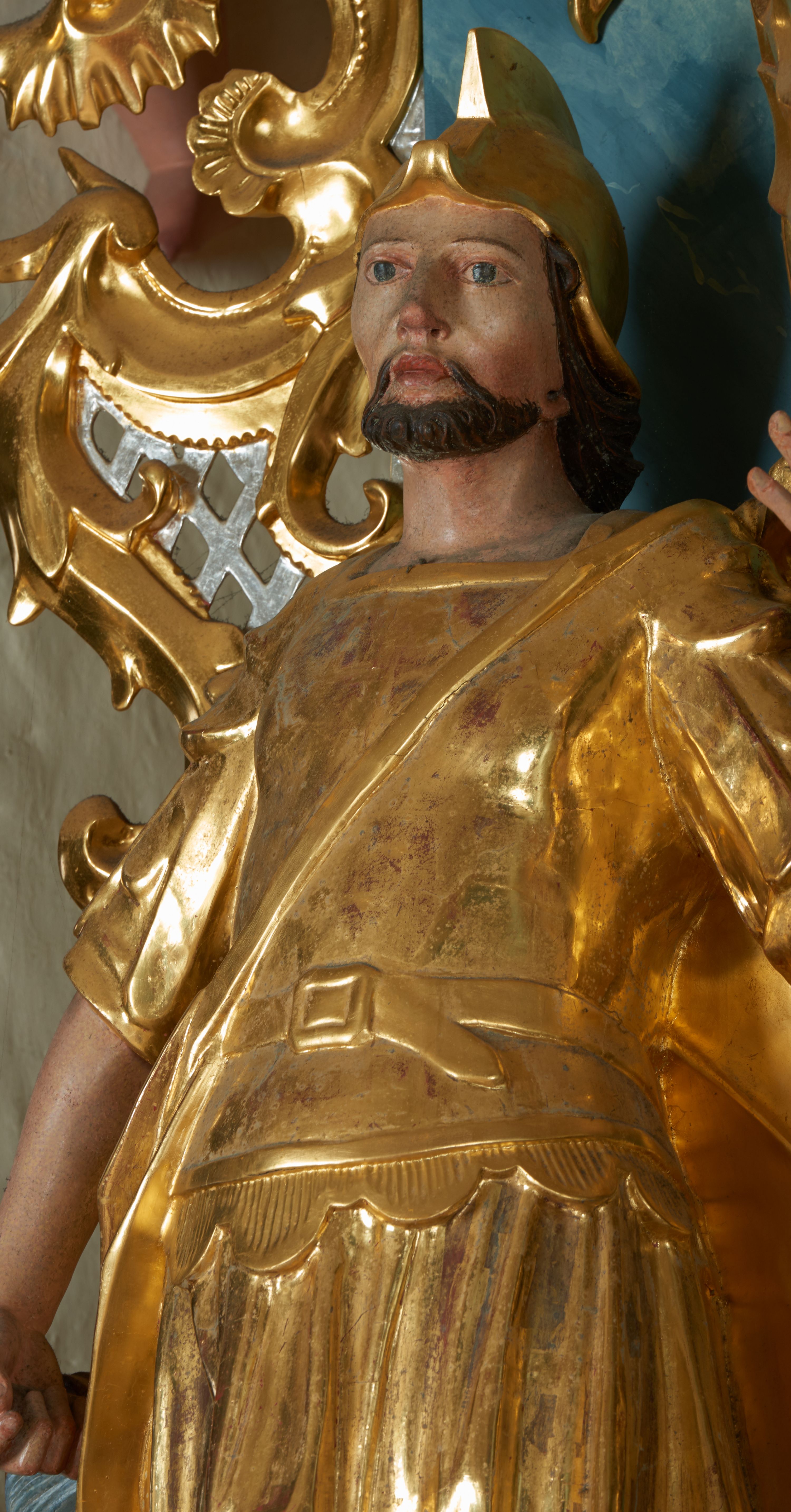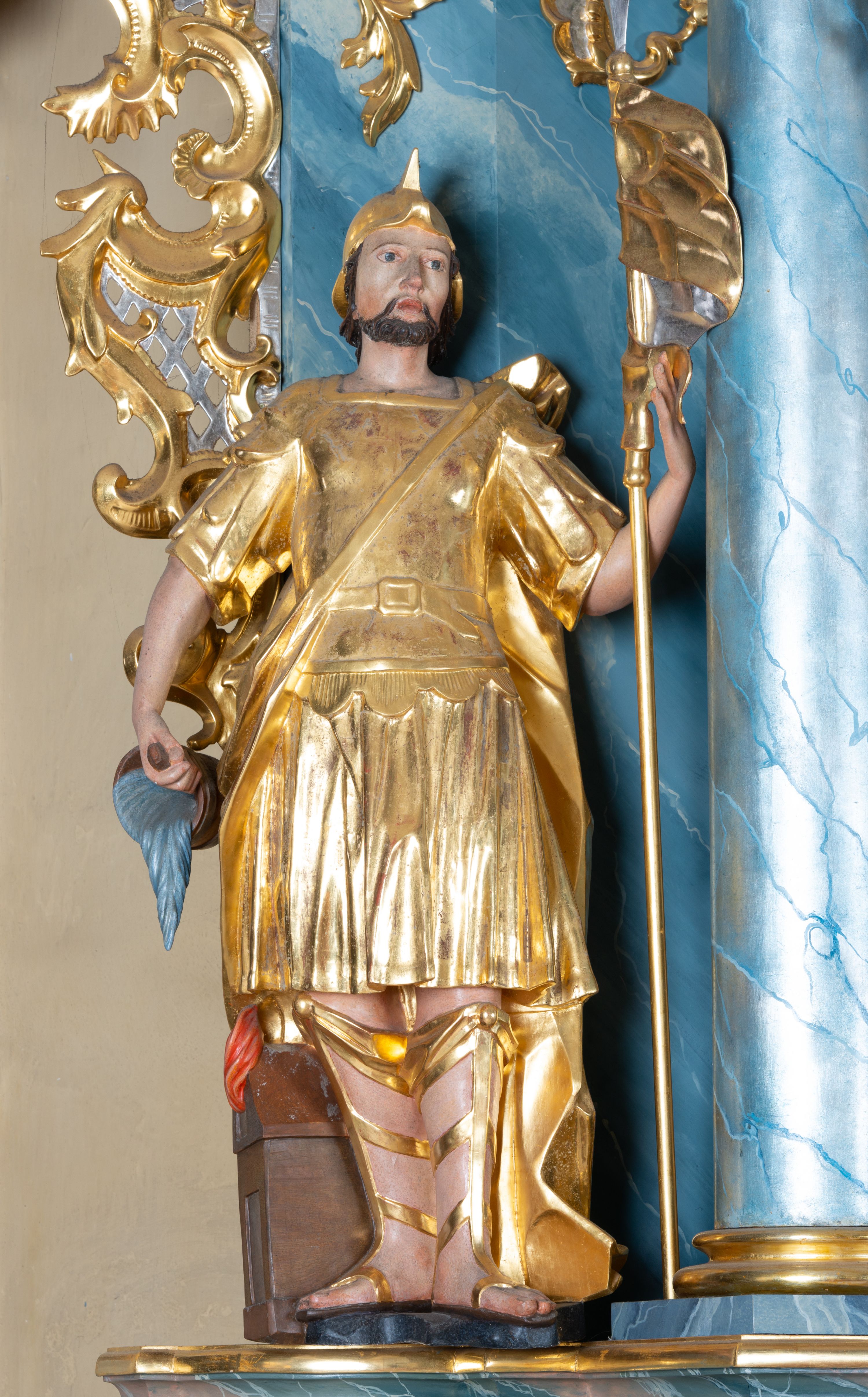 Rzeźba ścięta z tyłu, drążona, zwrócona frontalnie, w wykroku. Święty w lewej ręce trzyma chorągiew zakończoną ostrzem włóczni, w prawej naczynie z wodą, którą polewa niewielki, palący się dom znajdujący się przy jego prawej nodze. Twarz ma pociągłą, o zapadniętych policzkach, migdałowatych oczach, lekko garbatym nosie i pełnych ustach, okoloną wąsami, krótką brodą i włosami do ramion. Ubrany jest w strój rzymskiego żołnierza: tunikę sięgającą kolan, rzymską zbroję z piórami, płaszcz narzucony na plecy, podtrzymywany na taśmie przeciągniętej przez tors, na głowie nosi hełm, na nogach wysokie sandały. Ciało polichromowane naturalistycznie, szaty złocone.