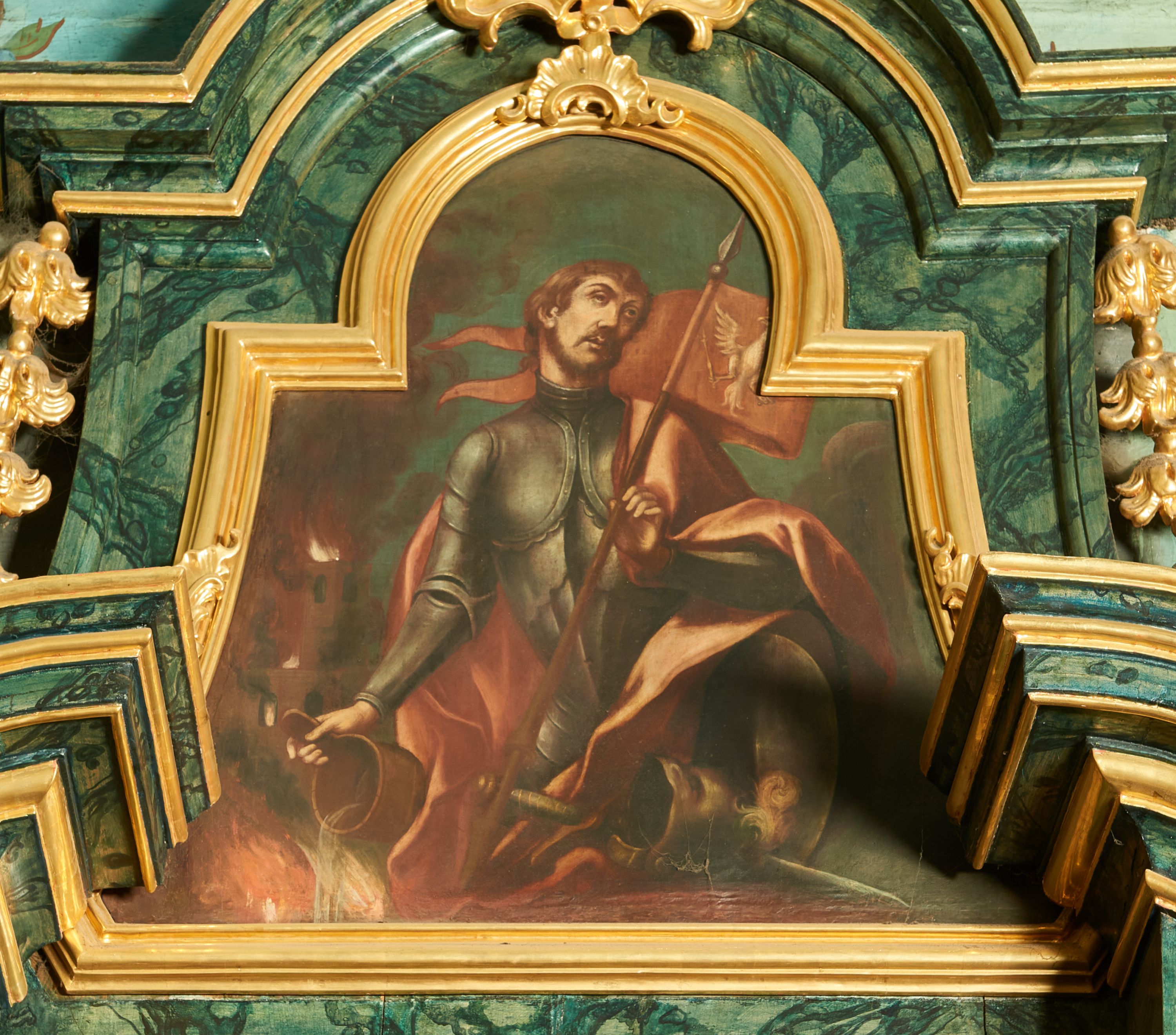 Obraz w formie zbliżonej do trapezu zamkniętego łukiem półkolistym nadwieszonym, o wklęsłych bokach. W centrum św. Florian ukazany w półpostaci, zwrócony w trzech czwartych w prawo, z głową skierowaną w przeciwną stronę. W lewej, ugiętej ręce trzyma drzewce czerwonego sztandaru z wizerunkiem białego orła, w prawej, wyciągniętej w bok trzyma cebrzyk, z którego wylewa wodę na płomienie. Twarz ma owalną, o niskim czole, małych okrągłych oczach, uniesionych brwiach, wąskim nosie i pełnych ustach; okoloną krótkimi, brązowymi włosami i brodą. Ubrany jest w metalową zbroję płytową, na lewy bok ma zarzucony czerwony, rozwiany płaszcz. Przed świętym, w prawym dolnym rogu obrazu leżą tarcza, miecz i hełm z pióropuszem. W lewej części obrazu, w tle ukazany płonący budynek. Święty przedstawiony na tle niebieskiego nieba z szarymi obłokami.