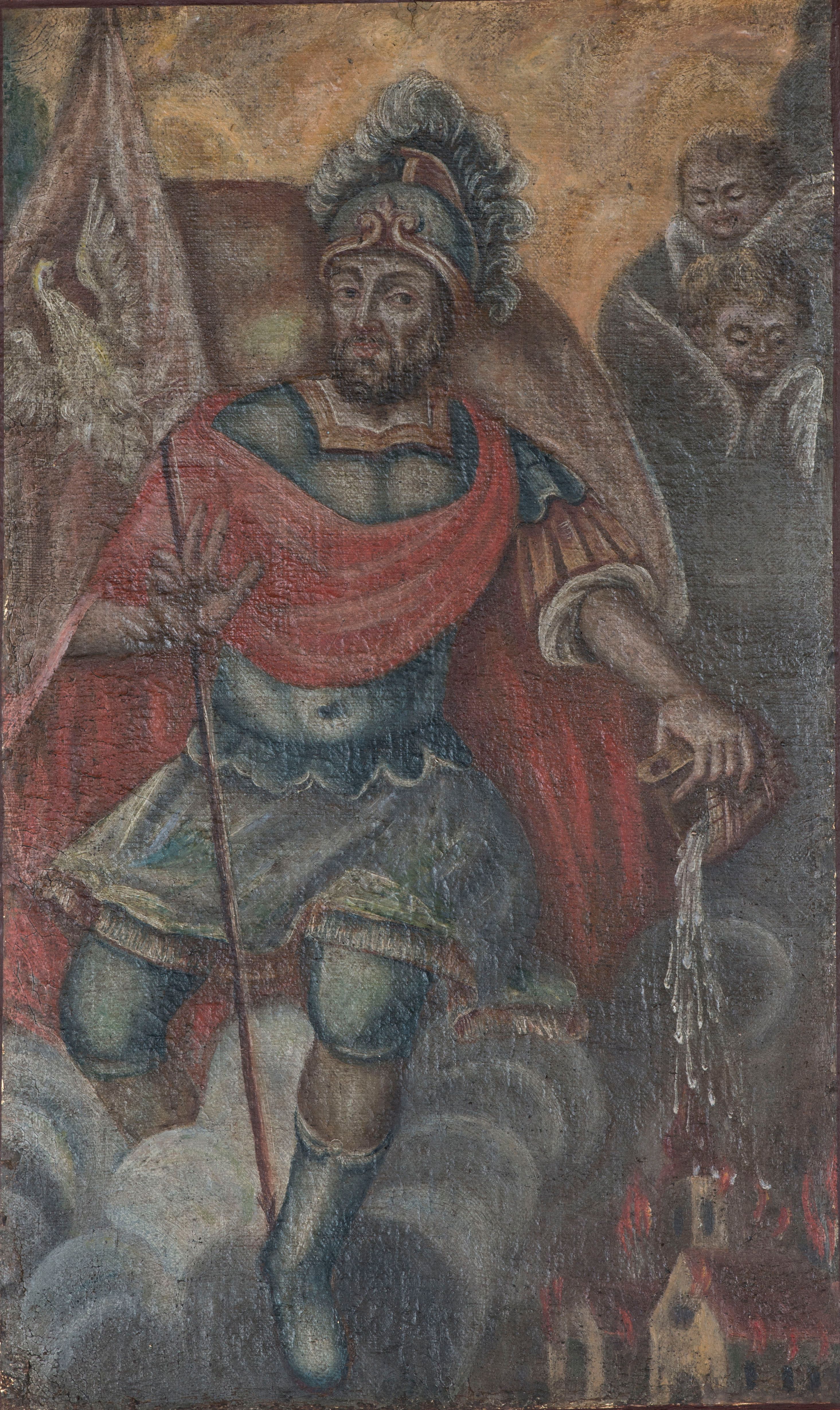 Święty Florian był rzymskim żołnierzem. W czasie prześladowań chrześcijan, za rządów cesarza Dioklecjana, został aresztowany, a gdy odmówił złożenia ofiary bóstwom pogańskim poddano go torturom, po czym przywiązano kamień młyński do szyi i utopiono. W 1184 roku dzięki staraniom Kazimierza Sprawiedliwego sprowadzono relikwie św. Floriana. We wsi Kleparz, nieopodal Krakowa (dziś jego dzielnicy) wybudowano świątynię, w której złożono szczątki świętego. W 1528 roku pożar strawił cały Kleparz oprócz kościoła św. Floriana. To cudowne wydarzenie rozpowszechniło w Polsce jego kult jako patrona chroniącego przed ogniem. Dlatego w ikonografii św. Florian przedstawiany jest w stroju rzymskiego żołnierza, najczęściej z naczyniem z wodą (cebrzyk) w momencie, gdy gasi pożar. W 1436 roku święty został ustanowiony przez biskupa Zbigniewa Oleśnickiego jednym z czterech patronów Królestwa Polskiego, dlatego na obrazie przedstawiony jest z chorągwią z wizerunkiem Orła Białego.