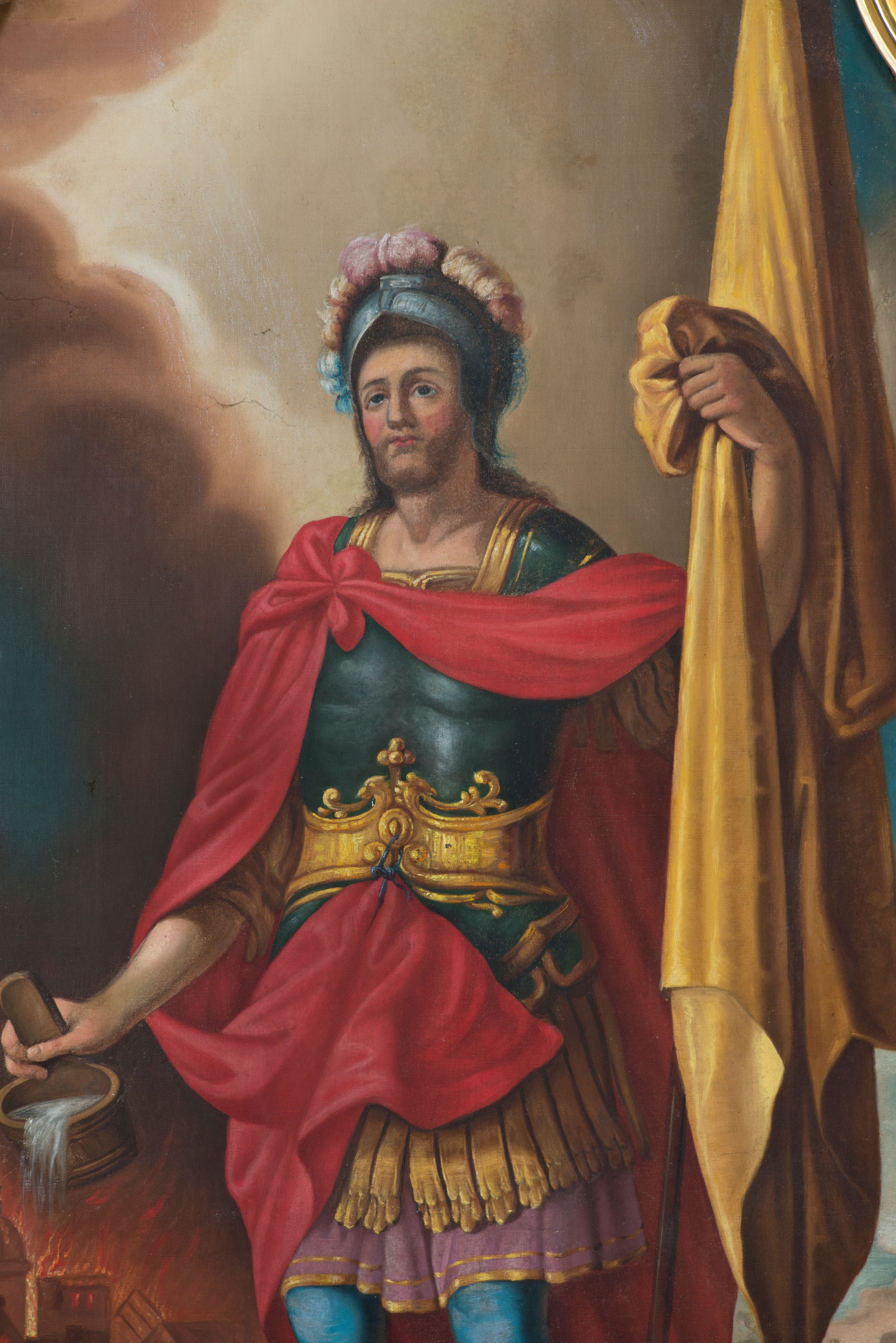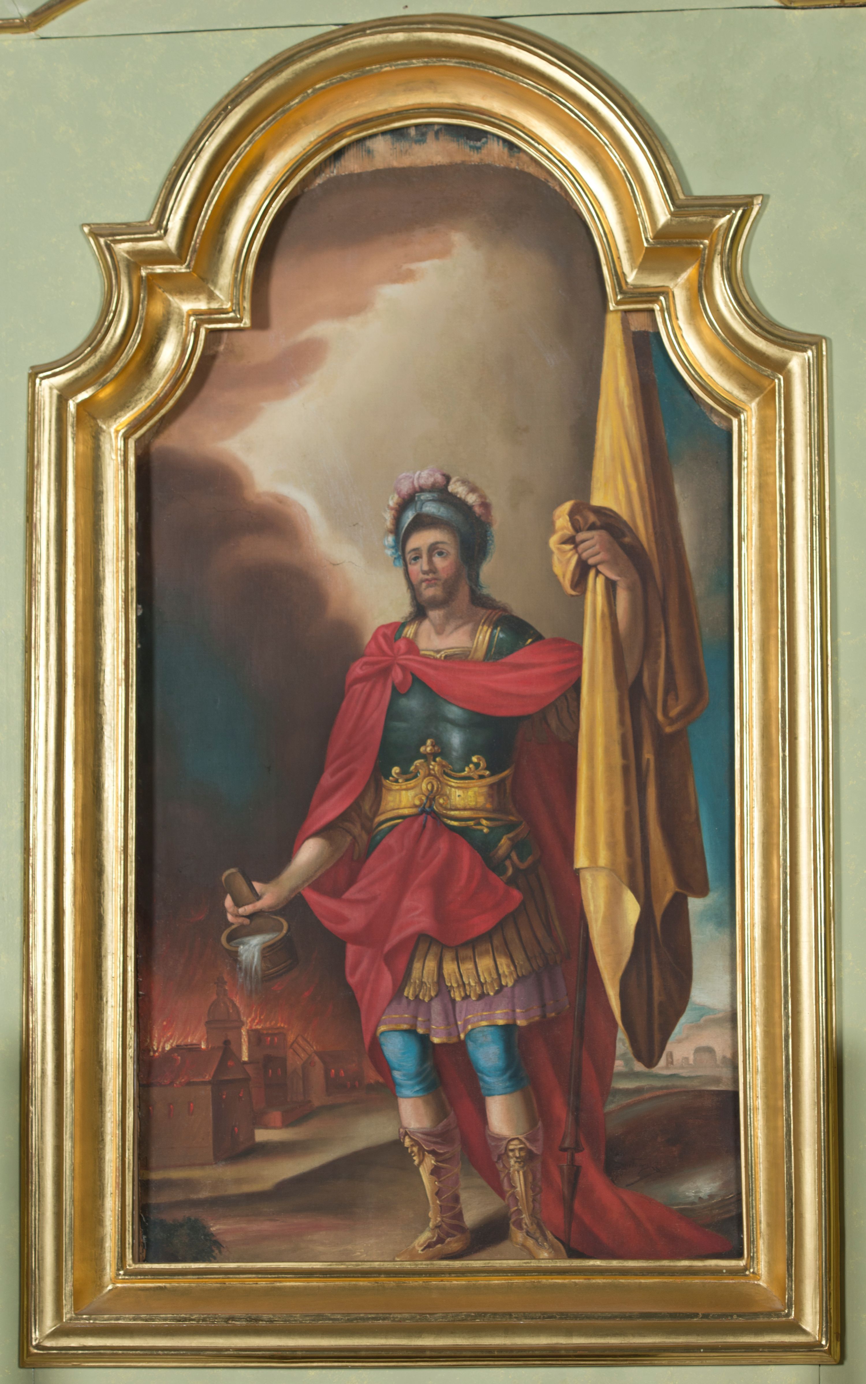 Święty Florian żył na przełomie III i IV wieku w Ceti (obecnie Dolna Austria). Jako młodzieniec został powołany do rzymskiej armii dowodzonej przez cesarza Dioklecjana, wielkiego prześladowcę chrześcijan. W 304 roku Florian miał wstawić się za ciemiężonych legionistów chrześcijańskich za co poniósł męczeńską śmierć utopiony w rzece Enns. Ukazany w zbroi rzymskiego legionisty święty w prawej dłoni trzyma niewielki cebrzyk z wodą odnoszący się do legendy, wedle której miał jednym wiadrem ugasić pożar płonącej wsi. Św. Florian patronuje zawodom związanym z ogniem, jak strażacy, hutnicy, kominiarze, piekarze czy garncarze. W 1436 roku ustanowiono go jednym czterech głównych patronów Królestwa Polskiego.