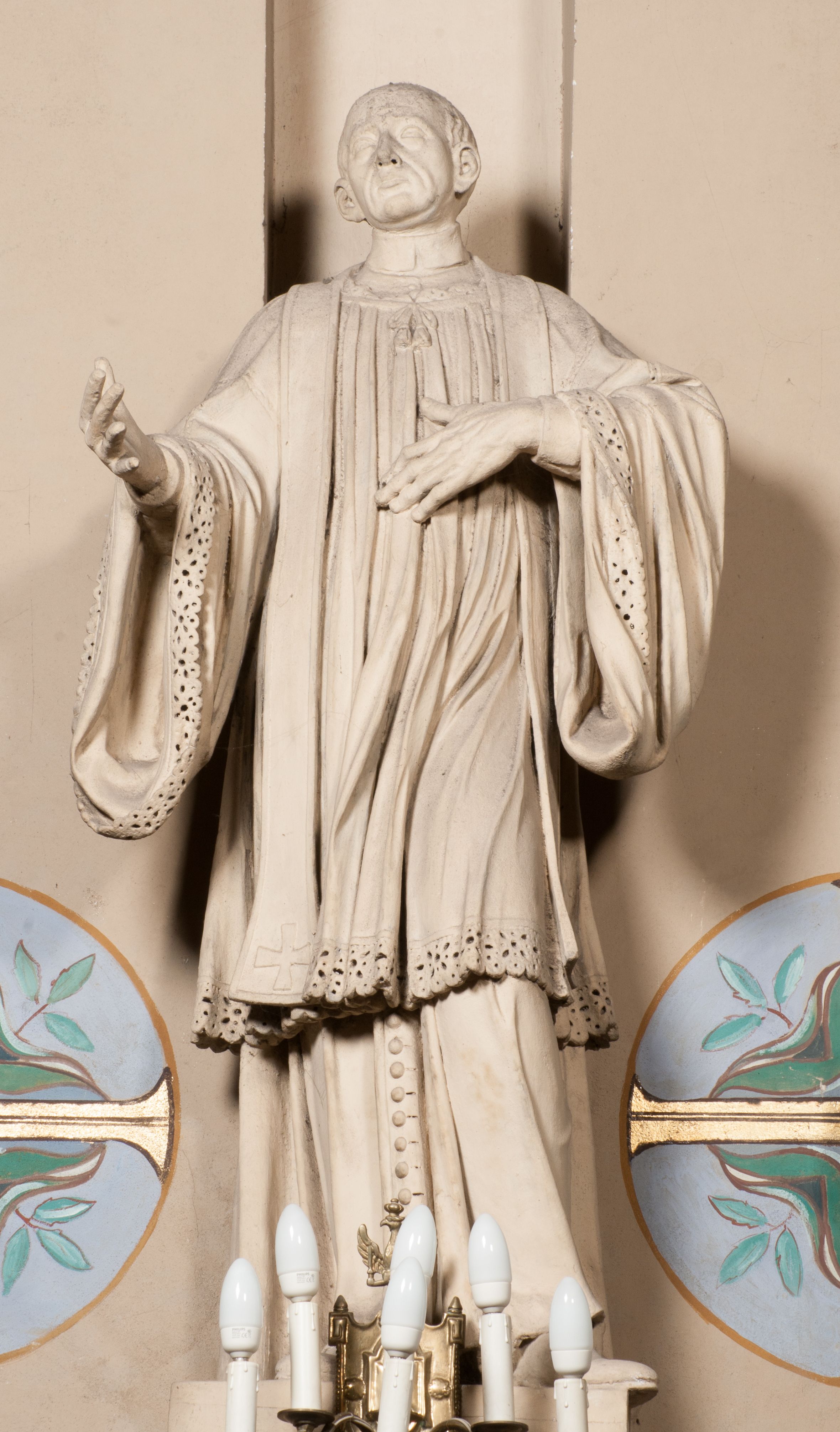Stiukowa figura umieszczona na przyściennej konsoli z wyrytą na postumencie datą 1797 stanowi parę z drugą, podobną rzeźbą. Zarówno styl, jak i data wskazują, iż mamy tu dwie późnobarokowe rzeźby, najprawdopodobniej ukazujące dwóch jezuickich świętych – św. Franciszka Ksawerego i być może św. Franciszka Borgiasza. Jednak brak atrybutów nie pozwala na jednoznaczne określenie postaci.
