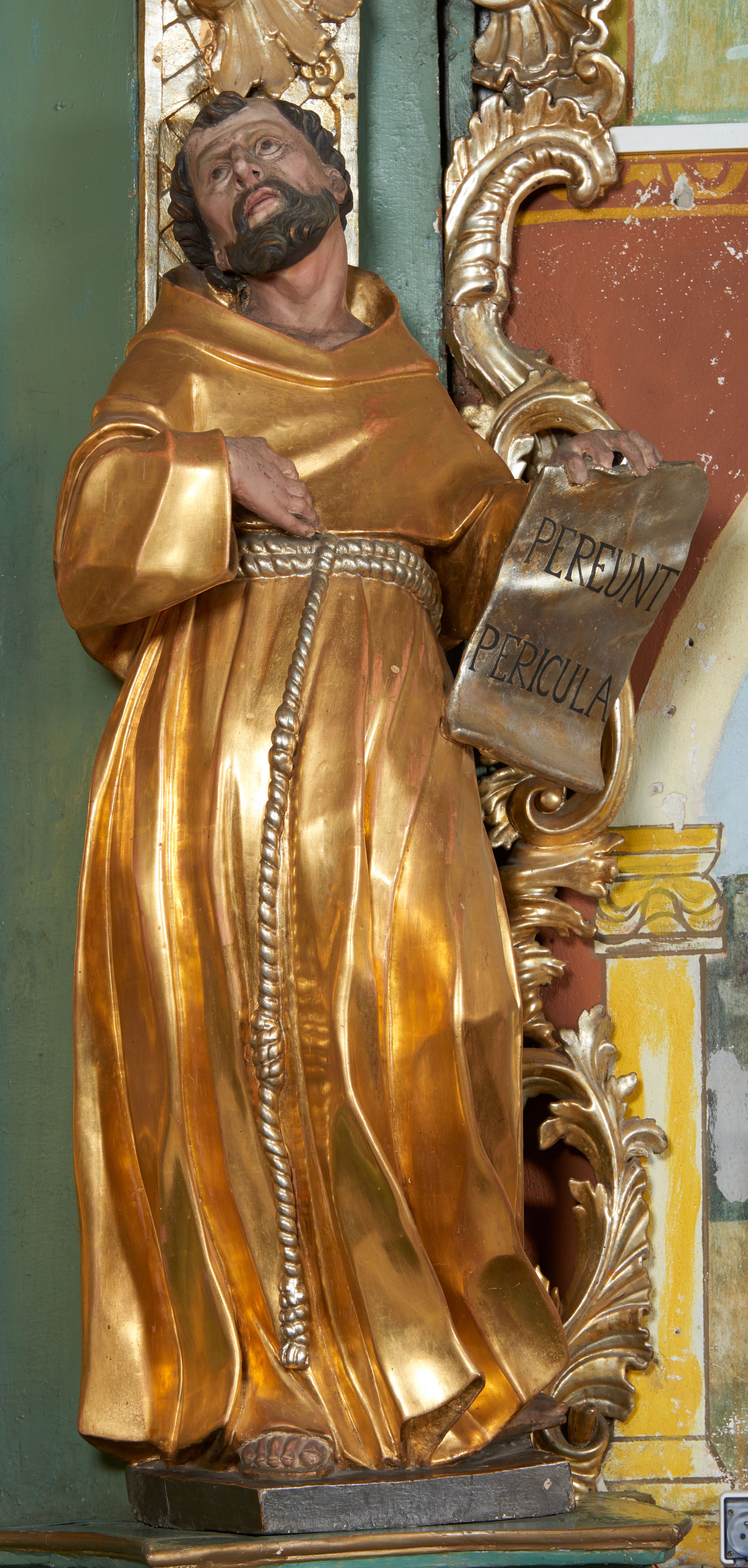 Święty Franciszek w ikonografii przedstawiany jest w habicie franciszkańskim, z tonsurą na głowie. Figura trzyma w dłoni kartę z napisem „PEREUNT PERICULA” (niebezpieczeństwa znikną) pochodzącym z pieśni „Si quaeris miracula” śpiewanej ku czci św. Antoniego Padewskiego, pod którego wezwaniem był pierwotnie ołtarz i do którego postaci odnosi się cała jego ikonografia. Święty Franciszek był założycielem nowej wspólnoty zakonnej – Braci Mniejszych i autorem jej reguły, zatwierdzonej w 1209 roku. Prowadził bardzo surowy tryb życia, z którym związanych było wiele cudów. Pierwszy w historii Kościoła otrzymał stygmaty. Pozostawił po sobie pisma, listy i utwory poetyckie.