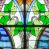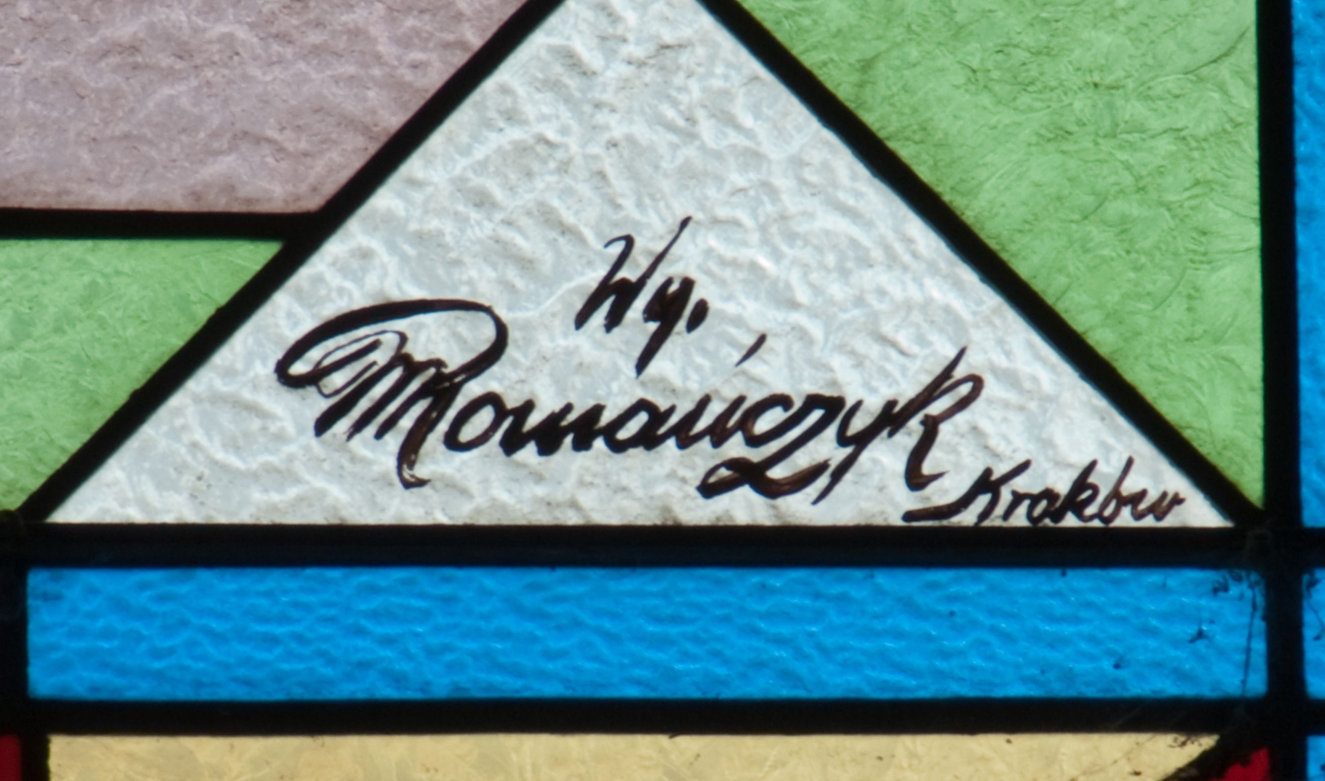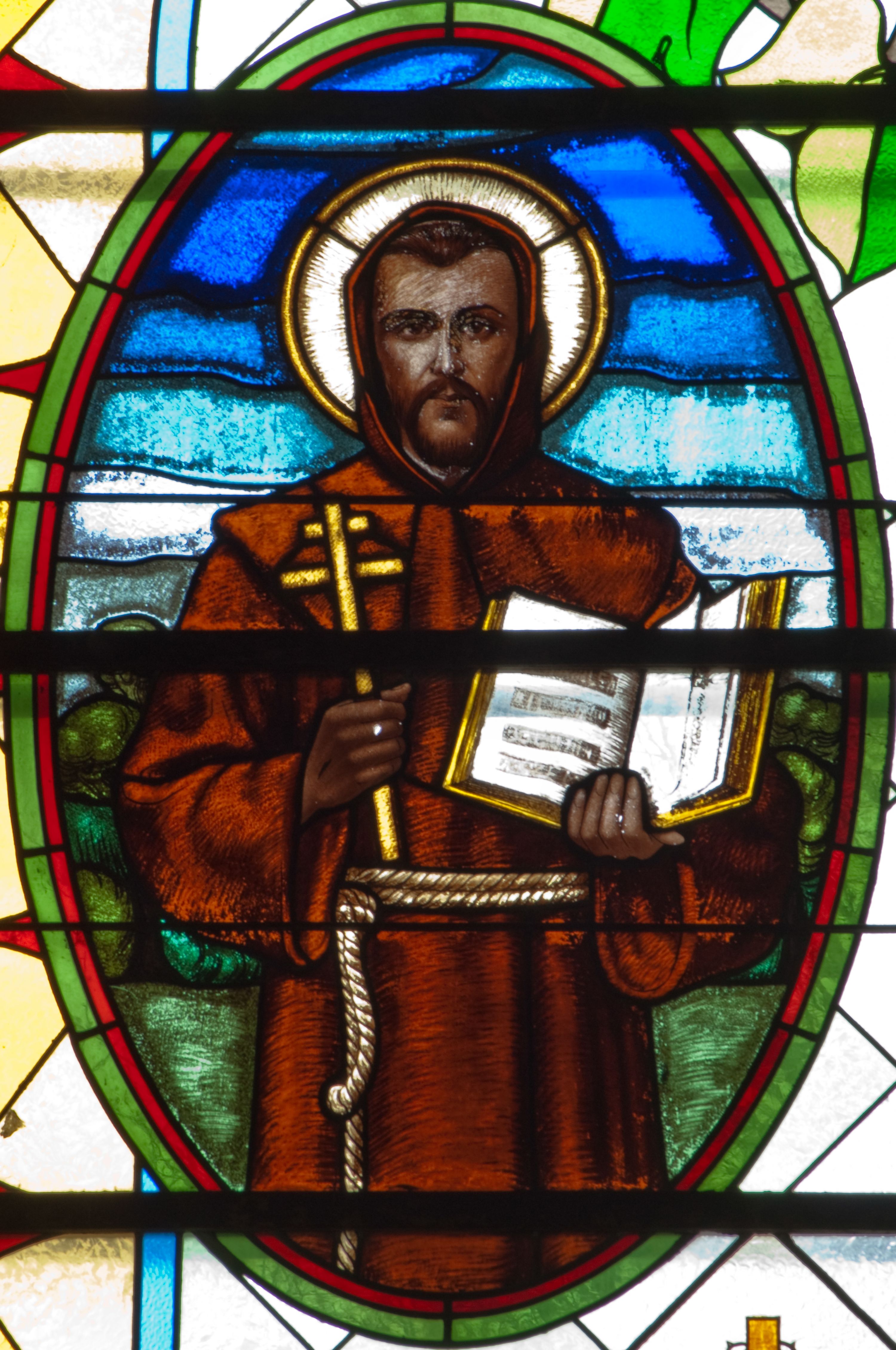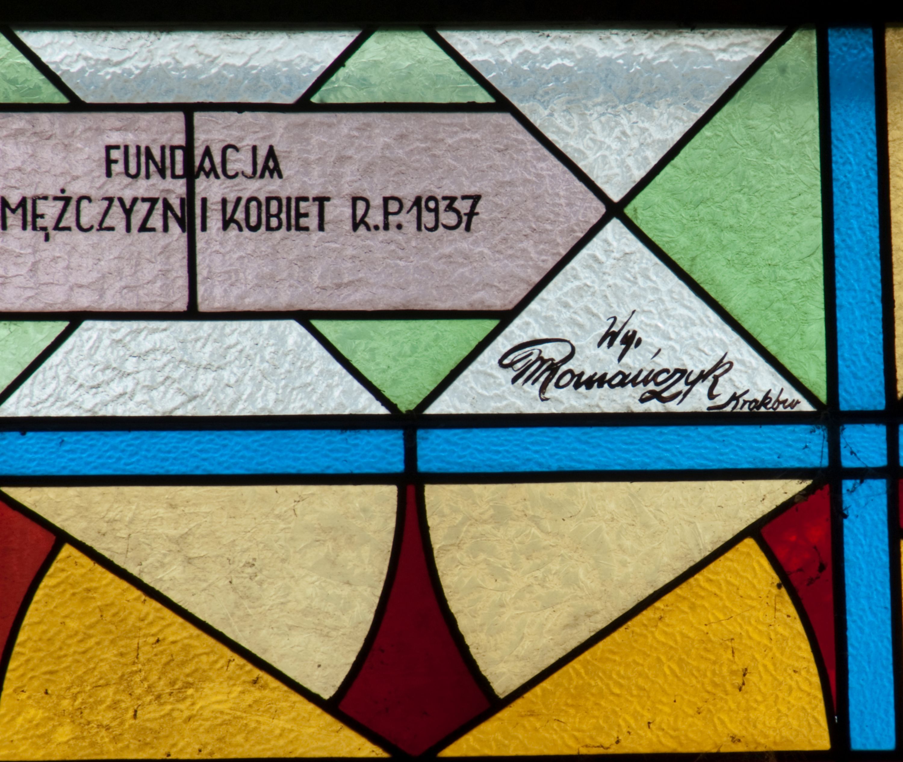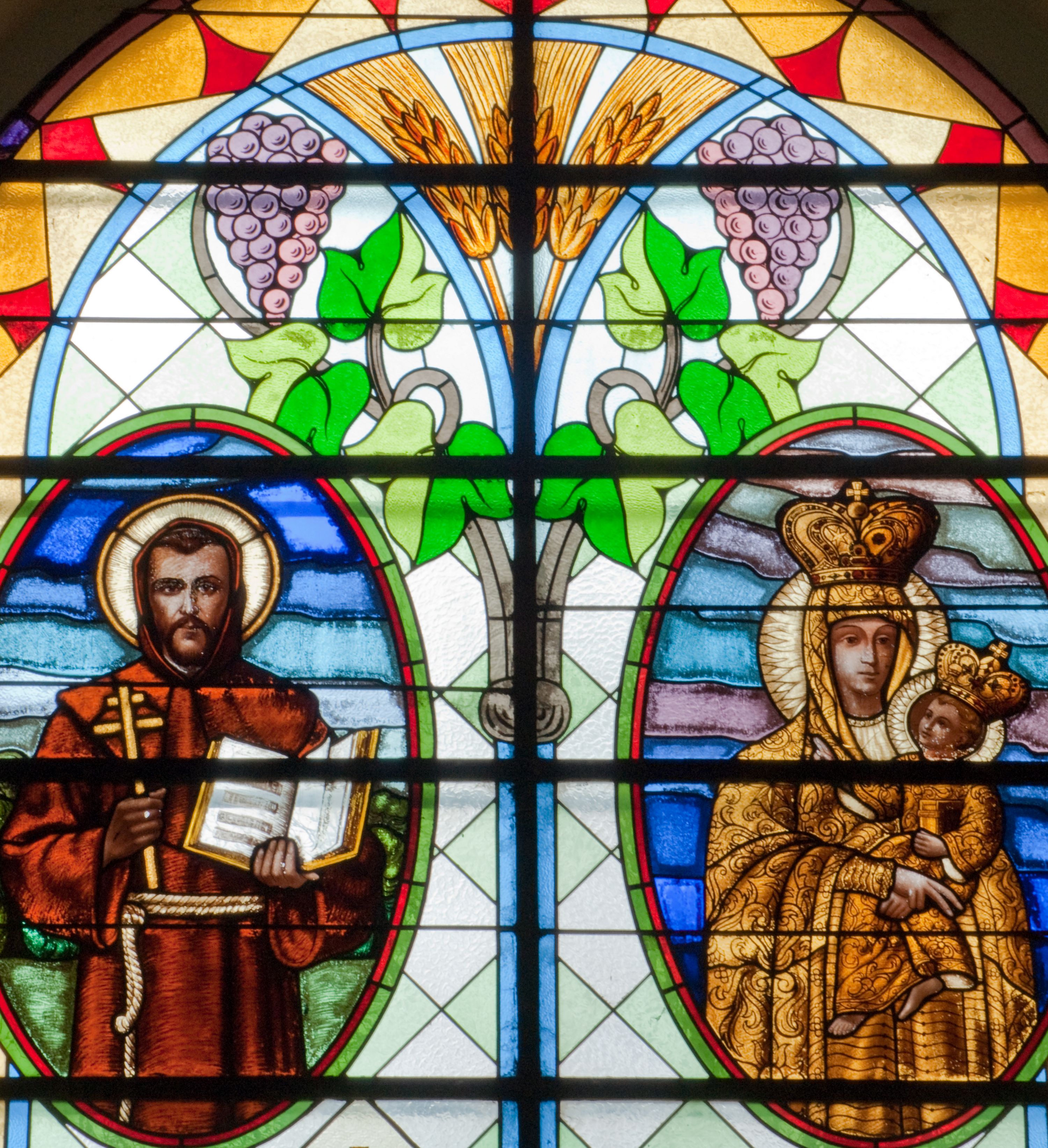 Witraż w kształcie stojącego prostokąta zamkniętego łukiem półkolistym. Kompozycja ujęta geometryczną bordiurą w kolorach czerwonym oraz jasno- i ciemnożółtym. Wewnątrz pole w kształcie stojącego prostokąta zamkniętego łukiem półkolistym z wpisanymi dwoma ostrołukami tworzącymi rodzaj gotyckiego biforium. W jego górnej części motyw kłosów oraz winnych gron. W polu z lewej strony kompozycji owalny medalion mieszczący przedstawienie św. Franciszka z Asyżu ubranego w brązowy habit przepasany sznurem, z kapturem na głowie, umieszczone na tle pejzażu. Święty ukazany frontalnie w tzw. długim popiersiu. W prawej ręce trzyma podwójny krzyż, w lewej otwartą księgę. Wokół głowy nimb. Poniżej medalionu godło tercjarzy (skrzyżowane ręce Chrystusa i św. Franciszka ze śladami po gwoździach w dłoniach, między którymi złoty krzyż na przecięciu ramion z koroną cierniową, u dołu błękitna wstęga) w jasnozielonym polu w kształcie rombu oraz inskrypcja „FUNDACJA / III ZAKON TERCJARZY R(OKU) P(AŃSKIEGO) 1937”. W polu z prawej strony kompozycji owalny medalion mieszczący wizerunek Matki Boskiej Śnieżnej na tle błękitnego nieba. Maria ukazana frontalnie, w tzw. długim popiersiu z głową zwróconą w trzech czwartych w lewo. Lewą ręką podtrzymuje Dzieciątko, prawa dłoń na tej samej wysokości z wyprostowanym palcem wskazującym i środkowym. Maria przedstawiona jako kobieta o owalnej twarzy z dużymi szeroko otwartymi oczami, prostym nosem i niewielkich, wąskich ustach. Jest ubrana w złote szaty – suknię z długimi rękawami oraz bogato zdobiony ornamentem roślinnym płaszcz. Na głowie złota chusta zdobiona ornamentem roślinnym oraz rozbudowana korona w typie zamkniętym zwieńczona krzyżem. Wokół głowy promienisty nimb. Dzieciątko przedstawione w pozycji siedzącej z ciałem zwróconym w trzech czwartych w kierunku Marii. Głowa uniesiona lekko do góry, prawa dłoń wyciągnięta do przodu wykonuje gest błogosławieństwa. W lewej dłoni Dzieciątko trzyma zamkniętą księgę. Postać jest ubrana w złotą tunikę z długimi rękawami zdobioną ornamentem roślinnym. Spod szat widoczne bose stopy. Na głowie Dzieciątka korona w typie zamkniętym zwieńczona krzyżem. Poniżej inskrypcja „FUNDACJA / RÓŻE MĘŻCZYZN I KOBIET R(OKU) P(AŃSKIEGO) 1937” oraz w prawym, dolnym rogu kompozycji sygnatura „Wy[konał] M[aksymilian] Romańczyk / Kraków”. Tło witraża wypełnia ukośna kratownica w kolorach jasnozielonym i białym (szkło bezbarwne).