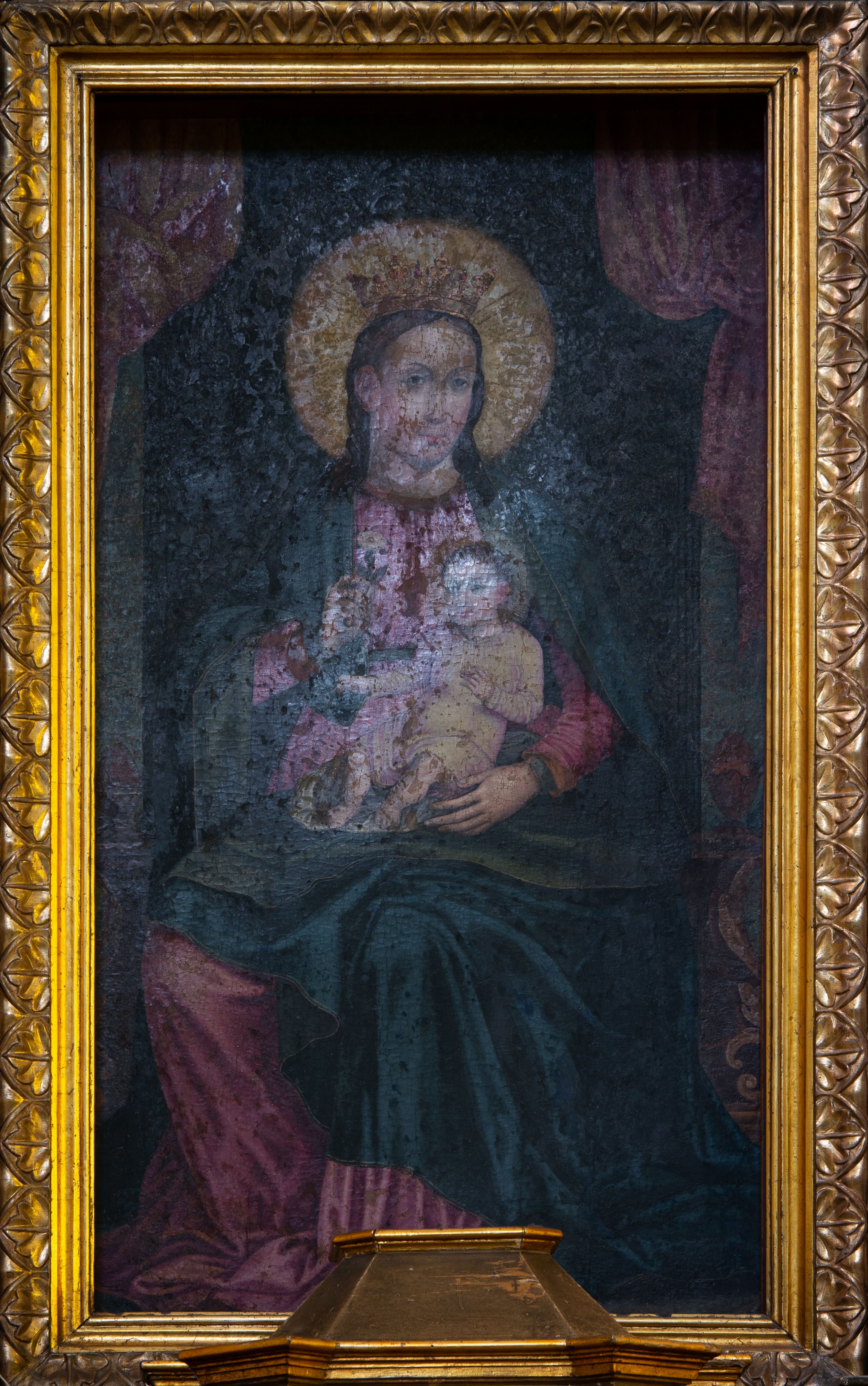 Widoczne są zabrudzenia, ubytki polichromii, przetarcia złoceń oraz uszkodzenia spowodowane przez drewnojady.