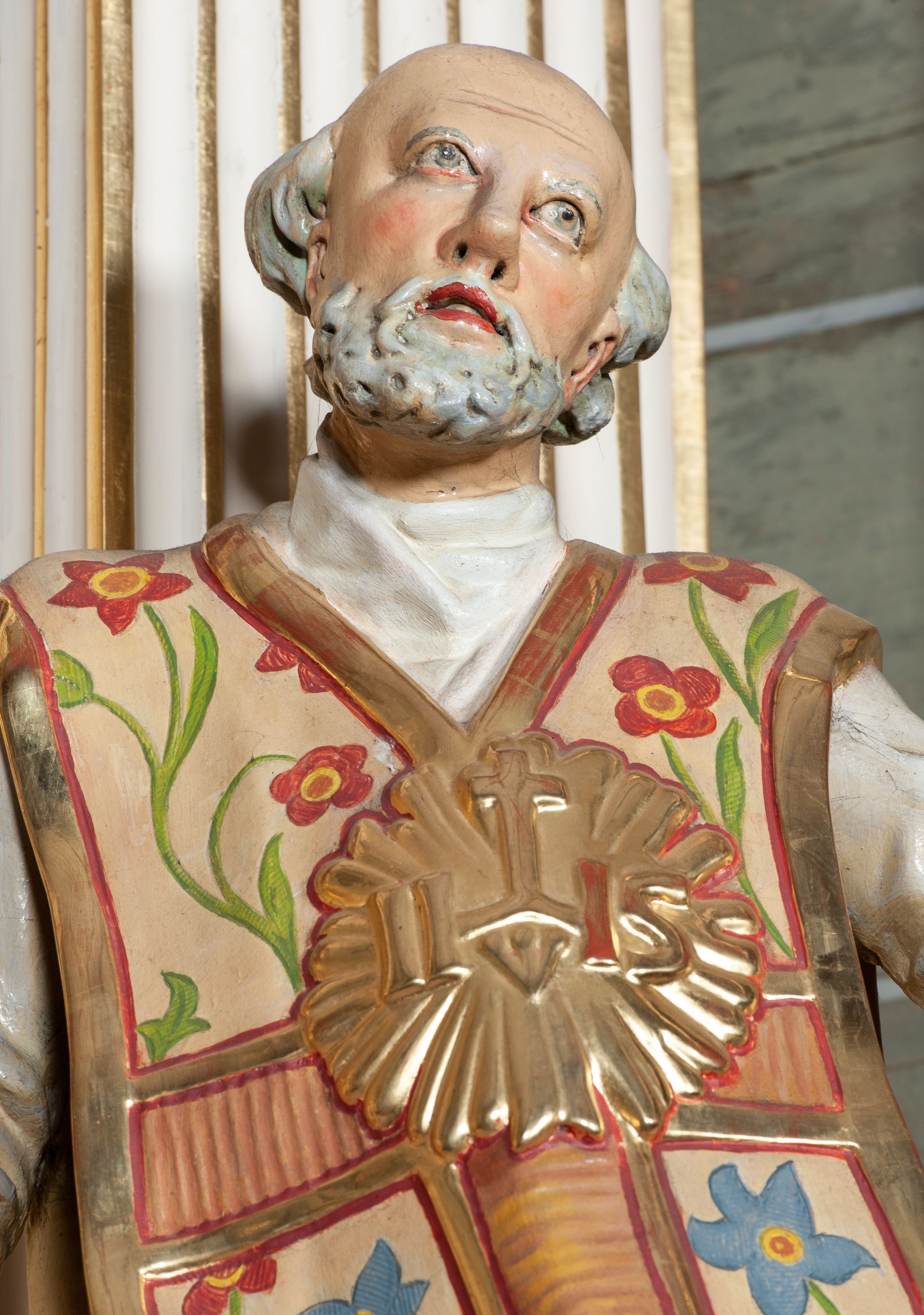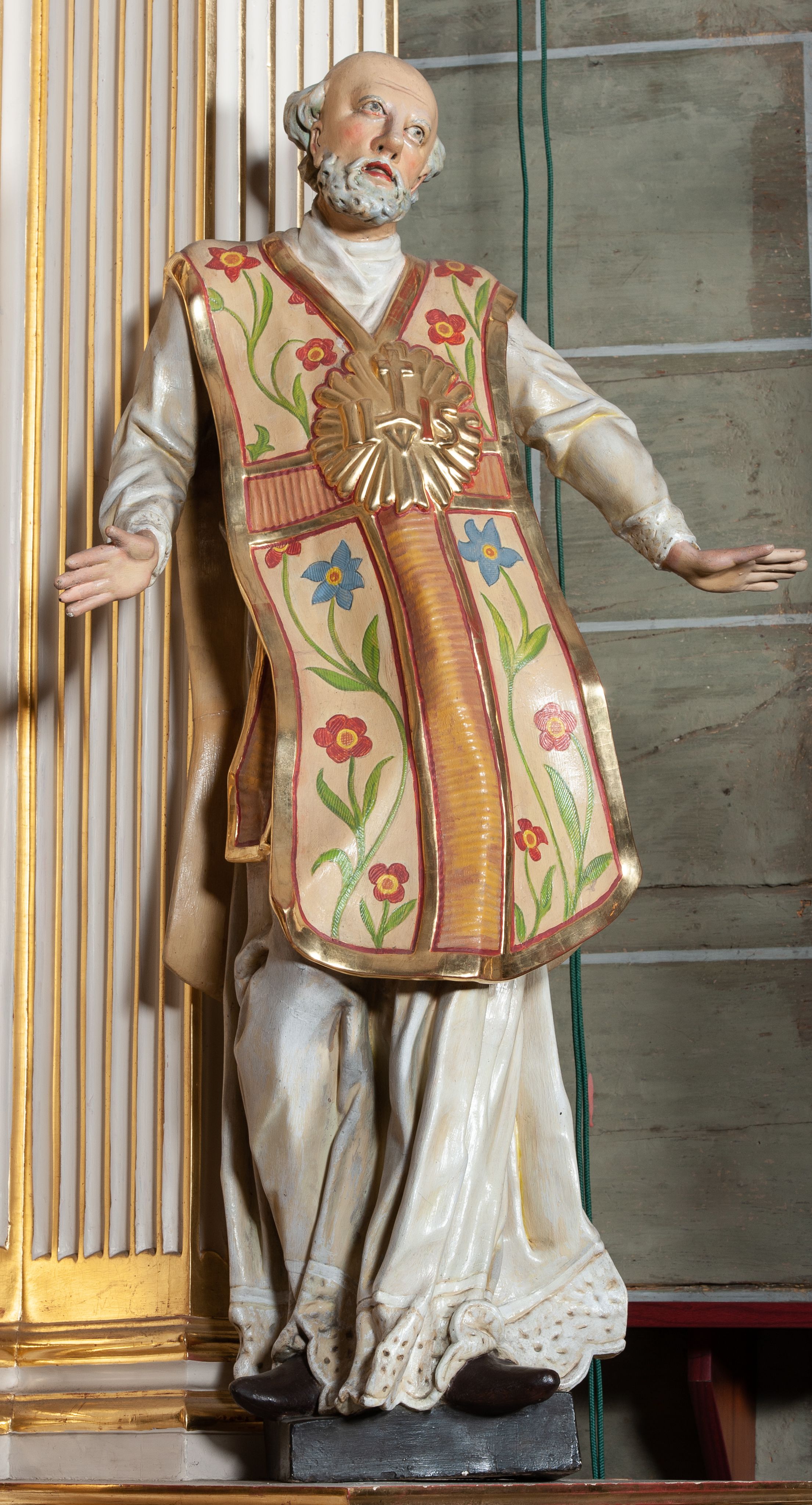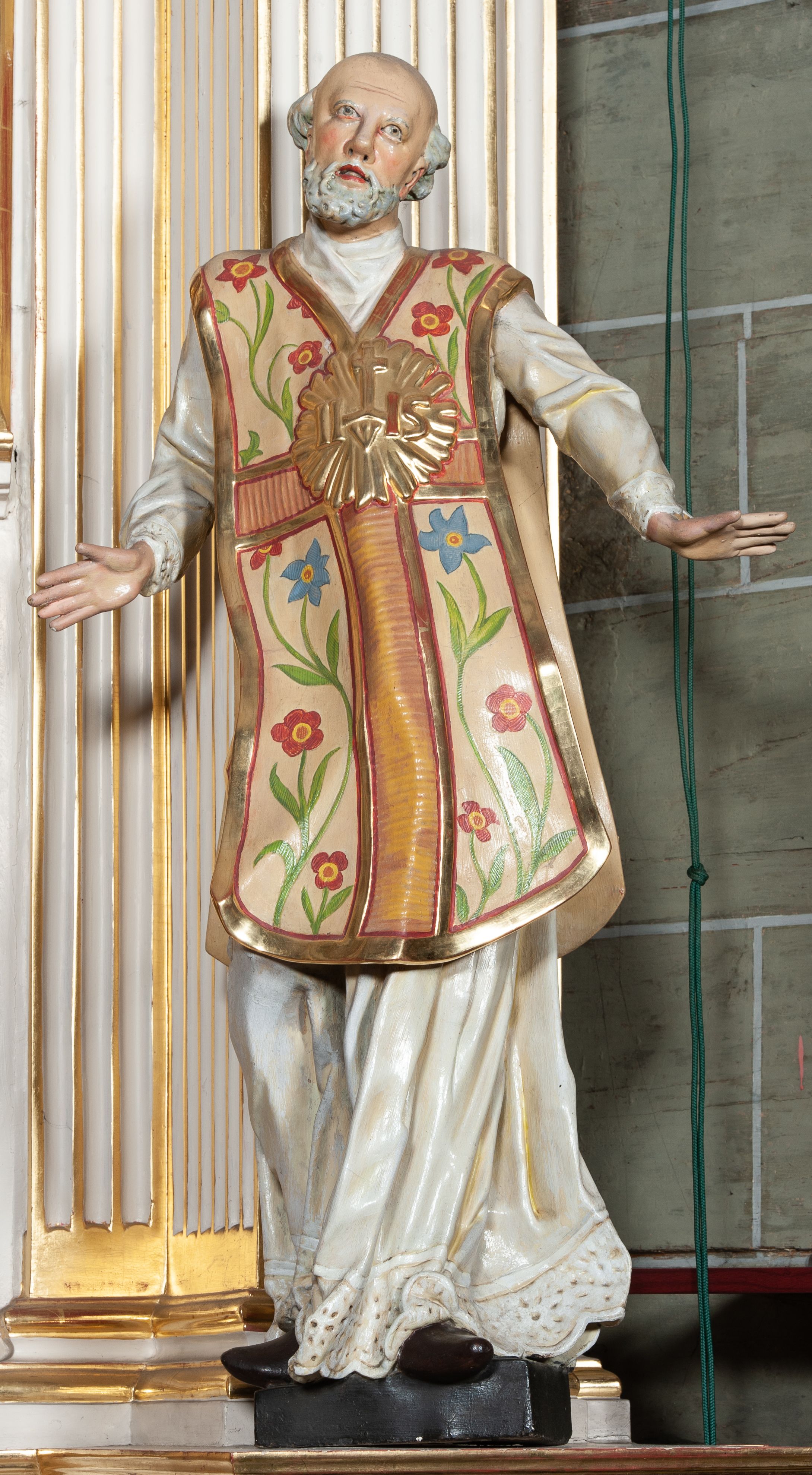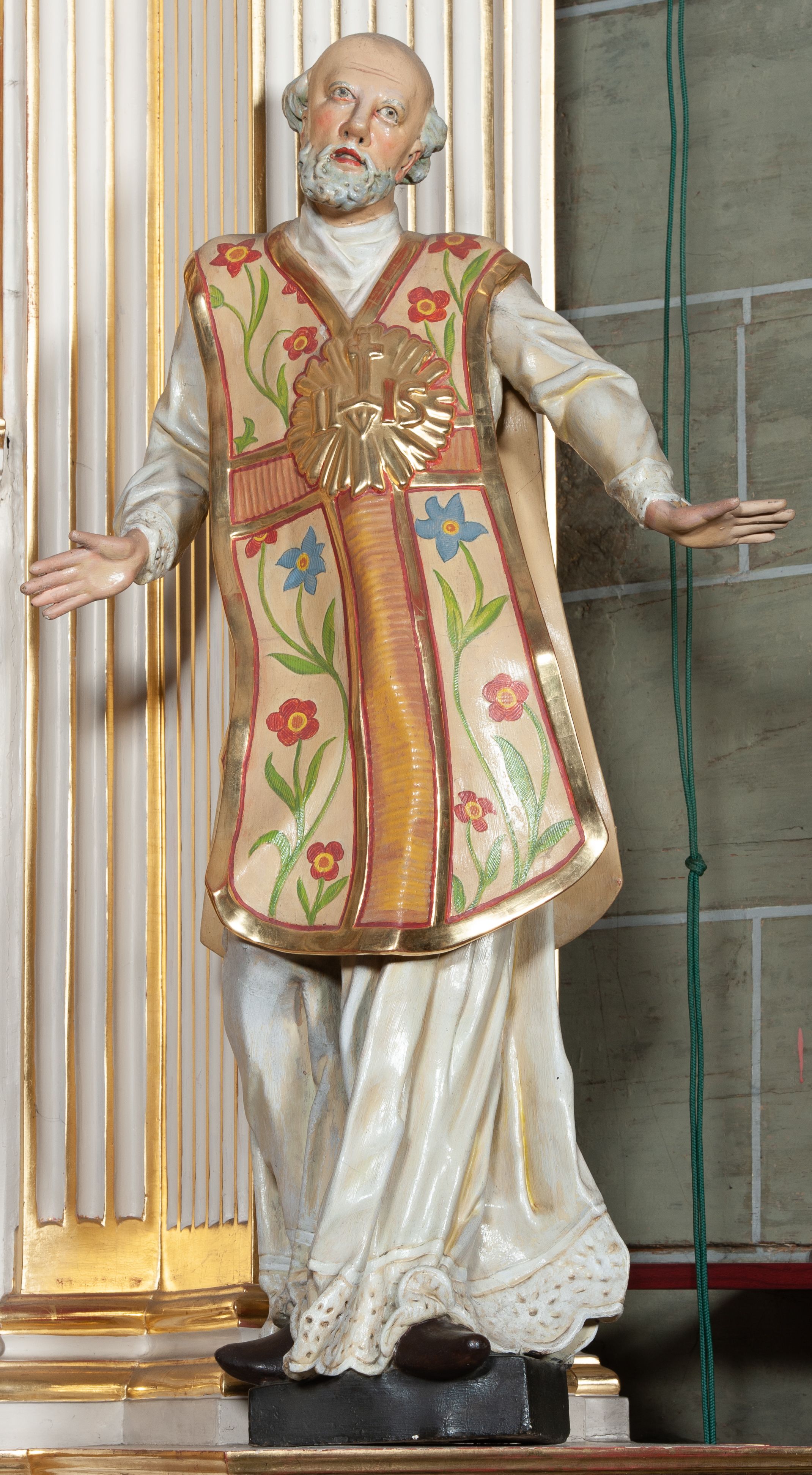 Rzeźba pełnoplastyczna, przyścienna; całopostaciowe przedstawienie św. Ignacego Loyoli, ukazanego frontalnie, stojącego w dynamicznej pozie, z esowato wygiętym ciałem, z prawą stopą wysuniętą do przodu, z rękami odwiedzionymi od ciała na boki, z głową przechyloną na lewy bark. Głowa starszego mężczyzny, z łysą czaszką, okolona wianuszkiem siwych włosów; twarz pociągła o jasnej karnacji, z zaróżowionymi policzkami, długim nosem i oczami skierowanymi ku górze, okolona obfitym siwym zarostem. Święty ubrany w długą albę ozdobioną u dołu koronką oraz ornat ozdobiony złotym galonem, bokami z motywem wici z barwnych kwiatów na białym tle i pretekstą w kształcie litery tau. Na piersiach okazały płaskorzeźbiony, kolisty złoty medalion z literami IHS w glorii promienistej.