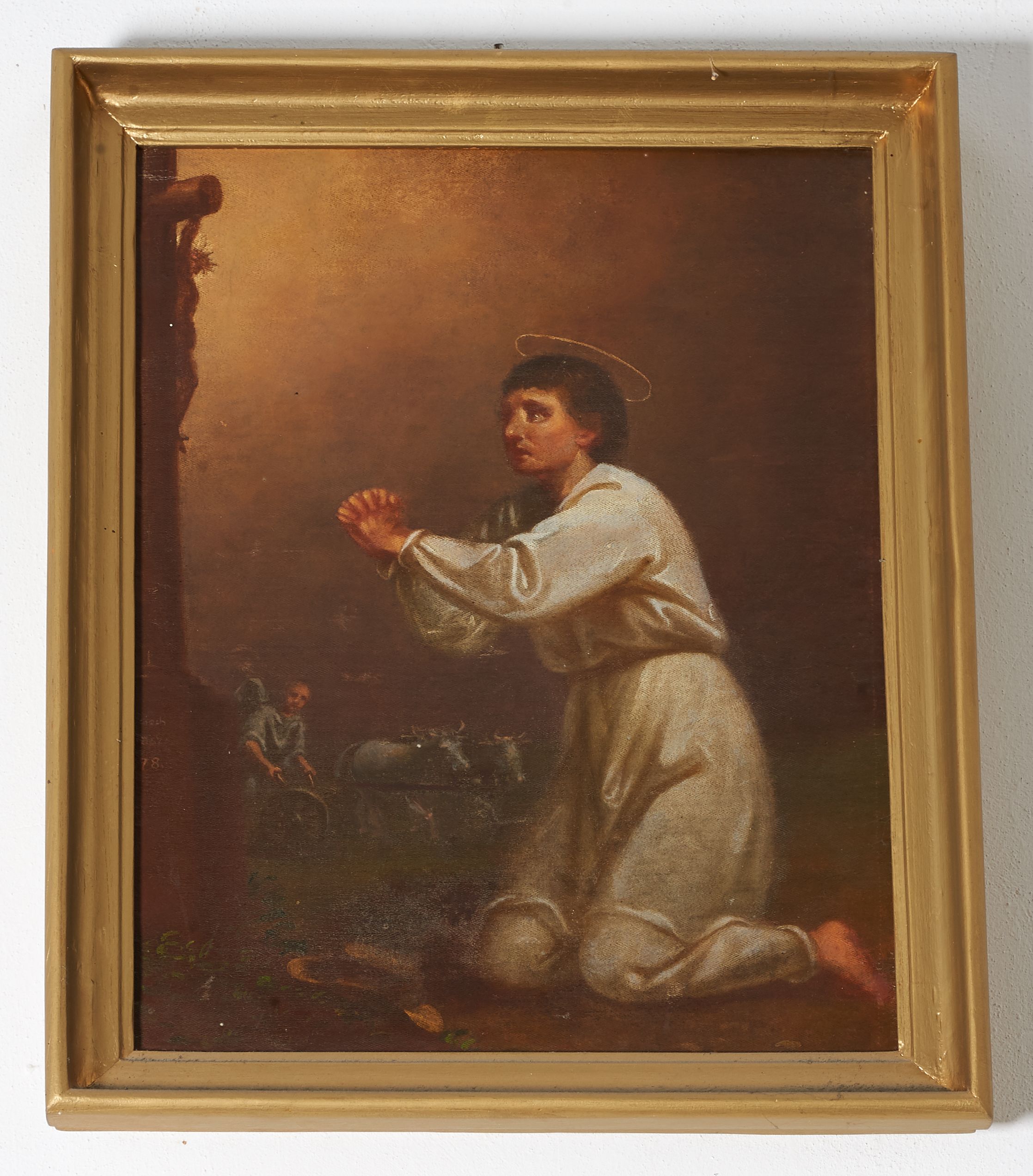 Obraz w formie stojącego prostokąta w profilowanej, złoconej ramie. W centrum znajduje się postać klęczącego św. Izydora modlącego się przed kapliczką. Święty zwrócony jest w trzech czwartych w lewo, z wyciągniętymi do przodu rękoma splecionymi w geście modlitwy. Jego twarz jest okrągła, o dużych, szeroko otwartych oczach, małym nosie i niewielkich ustach, okolona jest krótkimi, ciemnymi włosami, a nad głową ma nimb. Święty ubrany jest w białą tunikę, z wąskimi rękawami, przepasaną w talii, przed nim zaś leży słomkowy kapelusz. Przy lewej krawędzi obrazu znajduje się kapliczka z krucyfiksem na cokole, gdzie znajduje się sygnatura: „Wojciech / Eljasz / 1878”. Na drugim planie, w lewej części obrazu ukazany jest orzący pole anioł. Tło w postaci pejzażu z ciemnobrązowym niebem, rozświetlonym wokół krucyfiksu. Kolorystyka ciepła, w tonacjach brunatnych, laserunki.