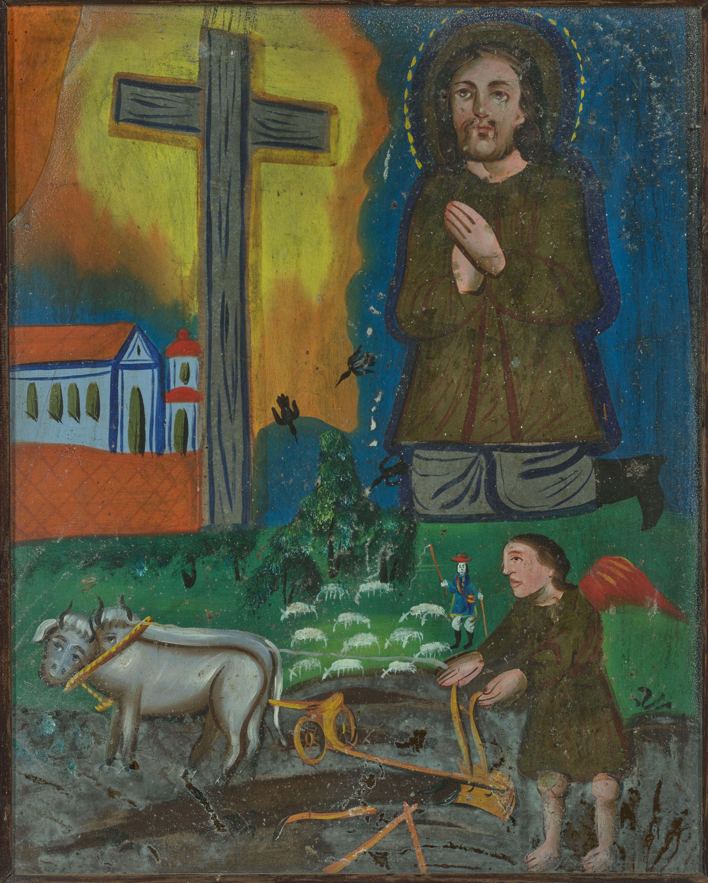Obraz przedstawiający św. Izydora Oracza w kształcie stojącego prostokąta, podzielony na dwie strefy. W dolnej strefie został ukazany anioł orzący pole za pomocą pary wołów i pługa. Anioł ubrany jest ciemnozieloną tunikę, ma również czerwone skrzydła. Powyżej ukazana jest niewielka scenka rodzajowa przedstawiająca pasterza, ubranego w strój krakowski: niebieską sukmanę i czerwony kapelusz, stado białych owieczek oraz latające wrony. W górnej strefie obrazu, po prawej stronie został ukazany św. Izydor, który klęczy przed przydrożnym krzyżem ze złożonymi w geście modlitwy rękami. Święty ubrany jest w brunatno-zieloną sukmanę, szare spodnie i czarne buty z wysokimi cholewami. Twarz z dużymi oczami, krótkim zarostem okolona długimi i brązowymi włosami. Wokół głowy ma trójstrefowy nimb: brązowy kolisty, niebieski okrągły i żółty utworzony z przerywanej kreski. Sylwetki postaci, draperie oraz brzegi szat oddane są konturem i wypełnione płaską plamą barwną. Po lewej stronie obrazu widoczne murowane zabudowania z jasnobrązowymi dachami. Krzyż prosty, a wokół jego ramion jest namalowana żółto-pomarańczowa poświata. Tło obrazu jednolite, niebieskie. Rama drewniana, prosta, pokryta bejcą.