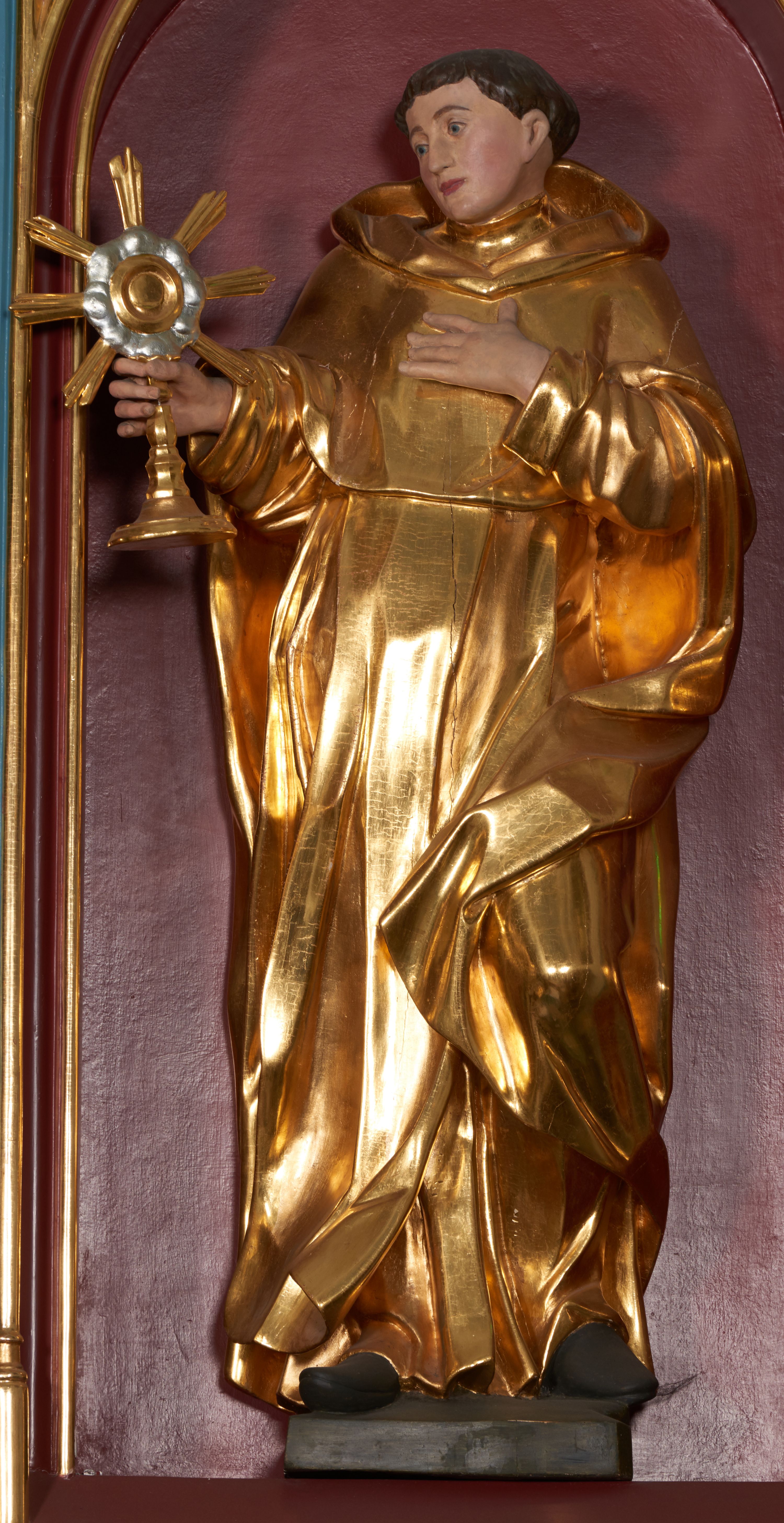Rzeźba przyścienna, całopostaciowa, zapewne drążona od tyłu. Święty jest ujęty w lekkim kontrapoście, z ugiętą lewą nogą. Jego lewa ręka jest zgięta w łokciu i złożona na piersi, w prawej trzyma monstrancję. Głowa jest zwrócona w prawo i lekko pochylona, twarz o ostrych rysach, prostym nosie, małych oczach. Na głowie tonsura i brązowe, krótkie włosy. Święty jest ubrany w habit dominikański i płaszcz z kapturem zarzucony na lewe kolano, spod habitu wystają brązowe buty. Figura polichromowana naturalistycznie w partiach ciała ze złoconym strojem oraz złoconą i srebrzoną monstrancją.