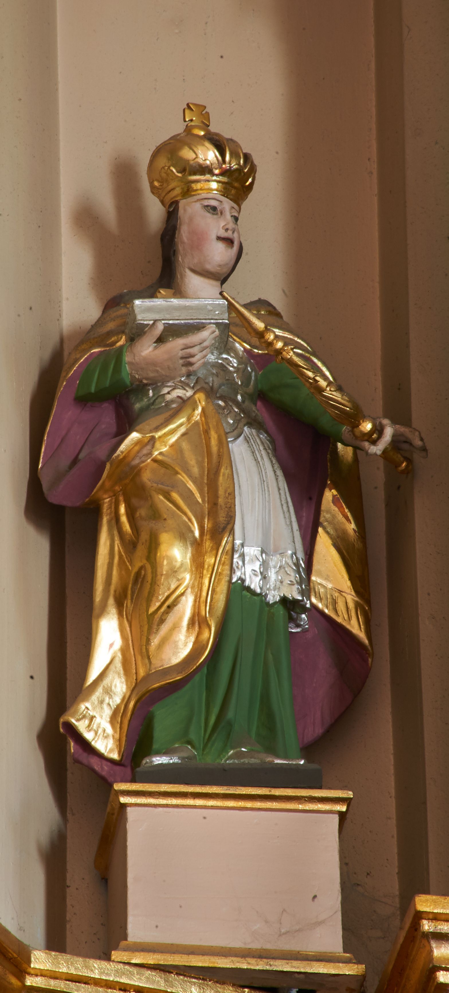 Rzeźba pełna, ustawiona na podstawie na planie kwadratu. Święta ukazana frontalnie, z głową skierowaną w lewo, w kontrapoście. Prawą, ugiętą ręką podtrzymuje zamkniętą księgę, w lewej, wyciągniętej w bok ma berło. Jej twarz jest pociągła, o pełnych policzkach, migdałowatych oczach, prostym nosie i rozchylonych ustach, okolona długimi włosami. Ubrana jest w zieloną suknię spodnią, białą szatę wierzchnią dekorowaną przy brzegu srebrzoną koronką, srebrzony gorset zdobiony płaskorzeźbionym ornamentem roślinnym. Na ramiona ma narzucony złocony płaszcz z fioletową podszewką, zapięty na piersi i zawinięty na lewym boku postaci. Polichromia naturalistyczna w partiach ciała.