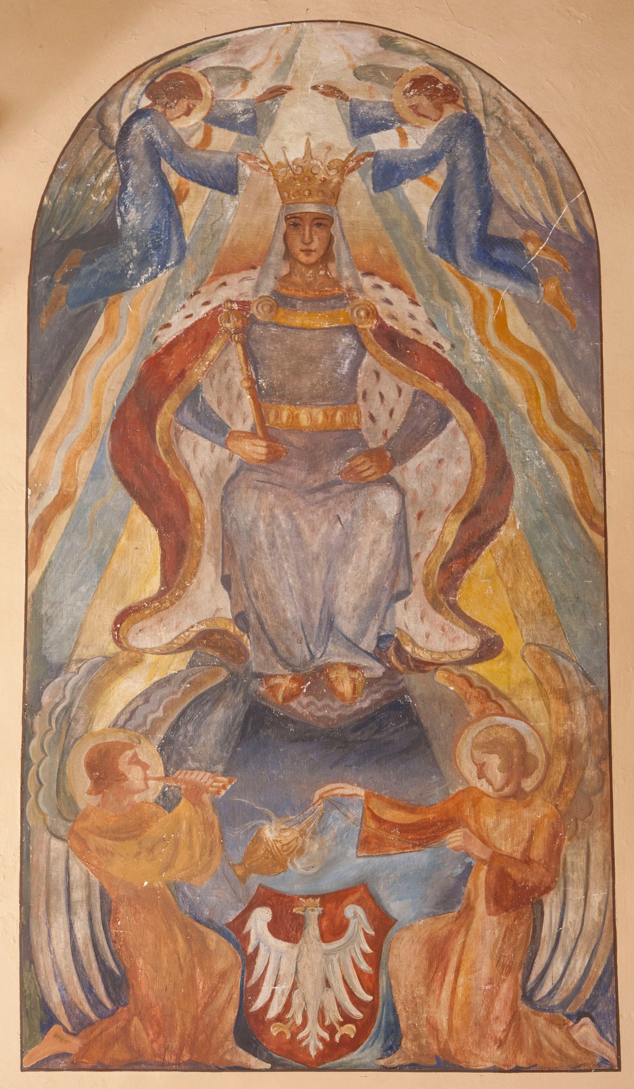 Polichromia w kształcie stojącego prostokąta zamkniętego łukiem półkolistym. W centrum kompozycji siedzi św. Jadwiga, która patrzy na widza. W prawej ręce trzyma berło, lewą ma złożoną na udzie. Jest ubrana w niebieską suknię ze złotym pasem, czerwony, podbity gronostajem płaszcz, który płynną linią opada ku ziemi oraz gronostajową pelerynę. Na głowie ma biały welon i złotą, otwartą koronę przytrzymywaną przez dwa, unoszące się ponad nią anioły w niebieskich sukniach. W dolnej części kompozycji herb Orzeł Biały między dwoma aniołami w pomarańczowym sukniach. Anioł z lewej gra na fletni, anioł z prawej okadza herb kadzielnicą. Wszystkie anioły mają duże, ekspresyjnie ujęte skrzydła. Tło przedstawienia stanowią skośnie uchodzące od centralnego punktu łuku promienie w kolorach niebieskim, żółtym i pomarańczowym.