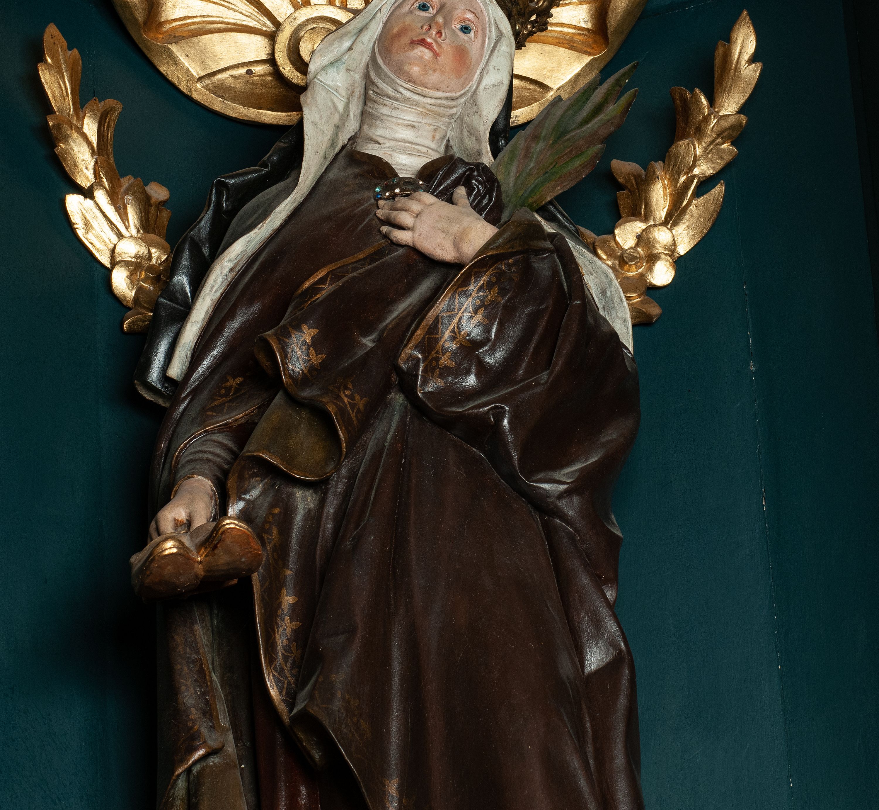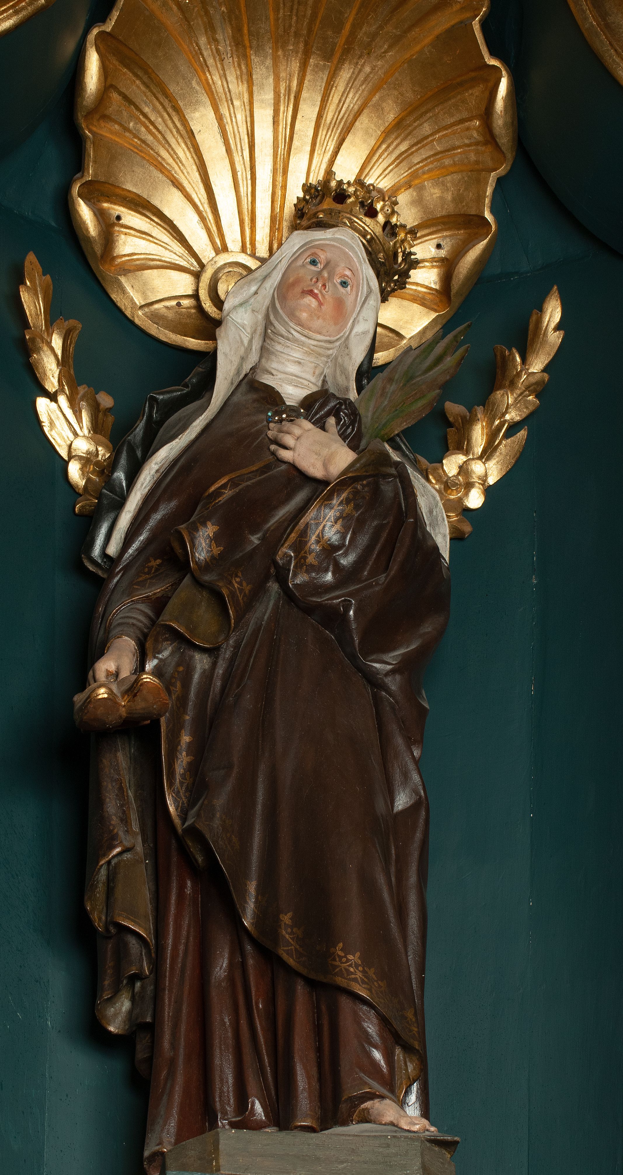 Rzeźba pełnoplastyczna przedstawiająca św. Jadwigę Śląską. Święta ukazana jest w pozycji stojącej na niskim cokole, frontalnie, w delikatnym kontrapoście z lewą nogą ugiętą w kolanie, z głową uniesioną do góry i nieznacznie skierowaną w swoją lewą stronę. W prawej dłoni trzyma parę butów; lewą dłonią, którą ma złożoną na piersi przyciska palmę męczeństwa. Twarz owalna, o spokojnym wyrazie, nos długi i wąski, wzrok wpatrzony w górę, delikatnie zarysowane łuki brwiowe, silnie zarumienione policzki. Ubrana w strój zakonny: ciemno-brązowy habit z białym welonem oraz ciemnobrązowy płaszcz spięty na piersi klamrą, zdobioną kamieniami, na głowie złota korona zamknięta. Fałdy habitu, silnie drapowane opadają ciężko w dół. Polichromia w odsłoniętych partiach ciała naturalistyczna, jasna.