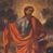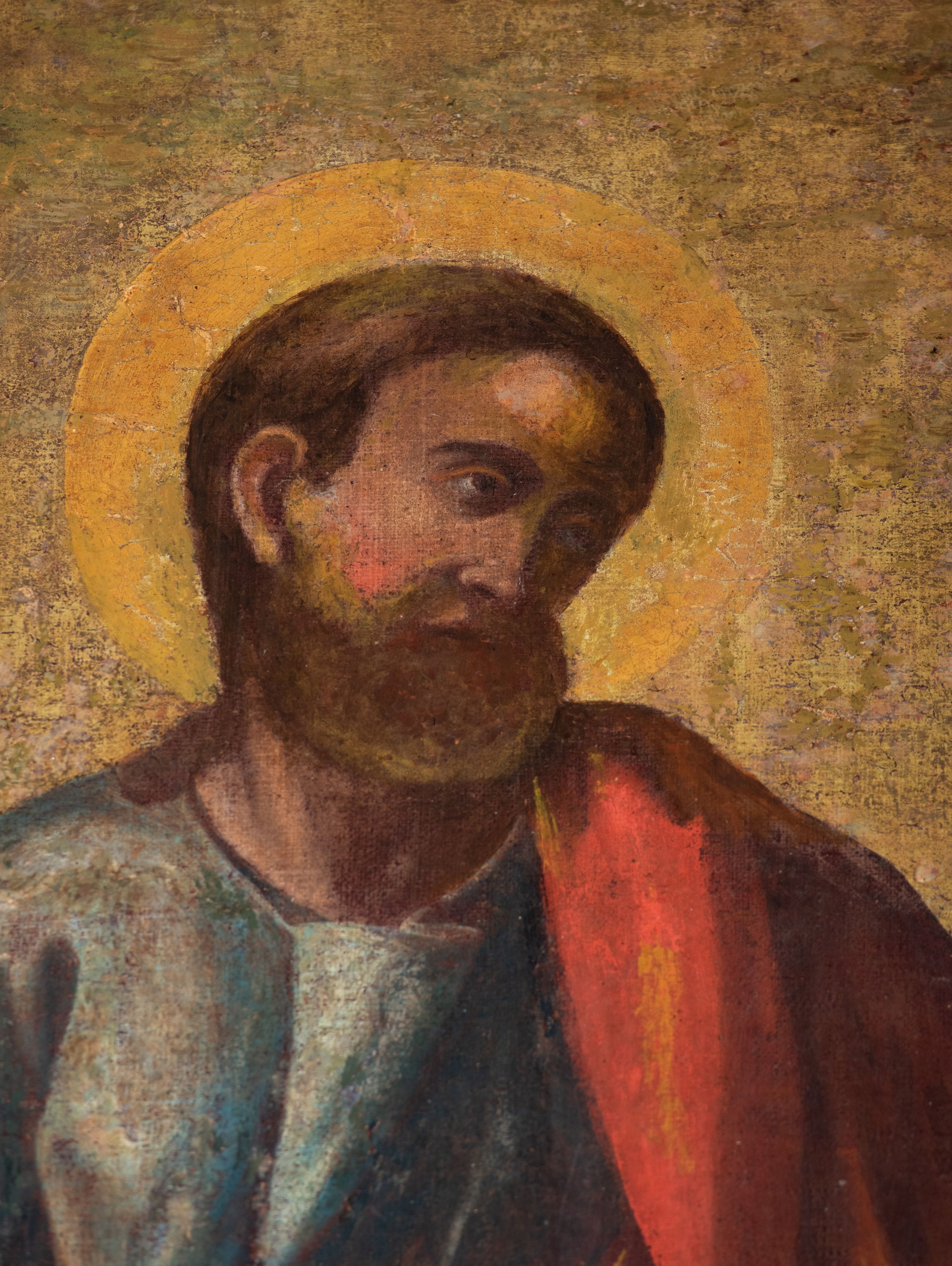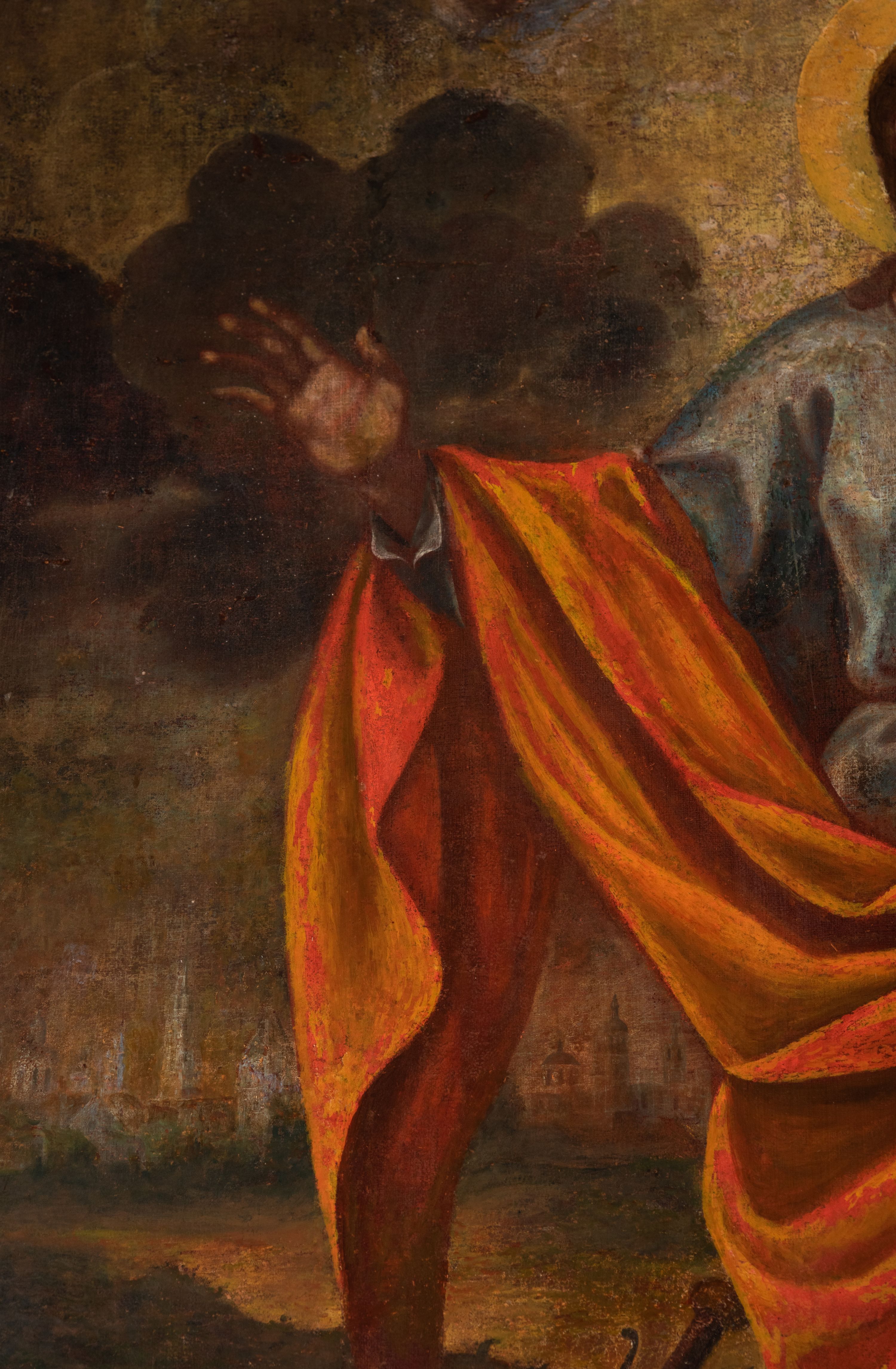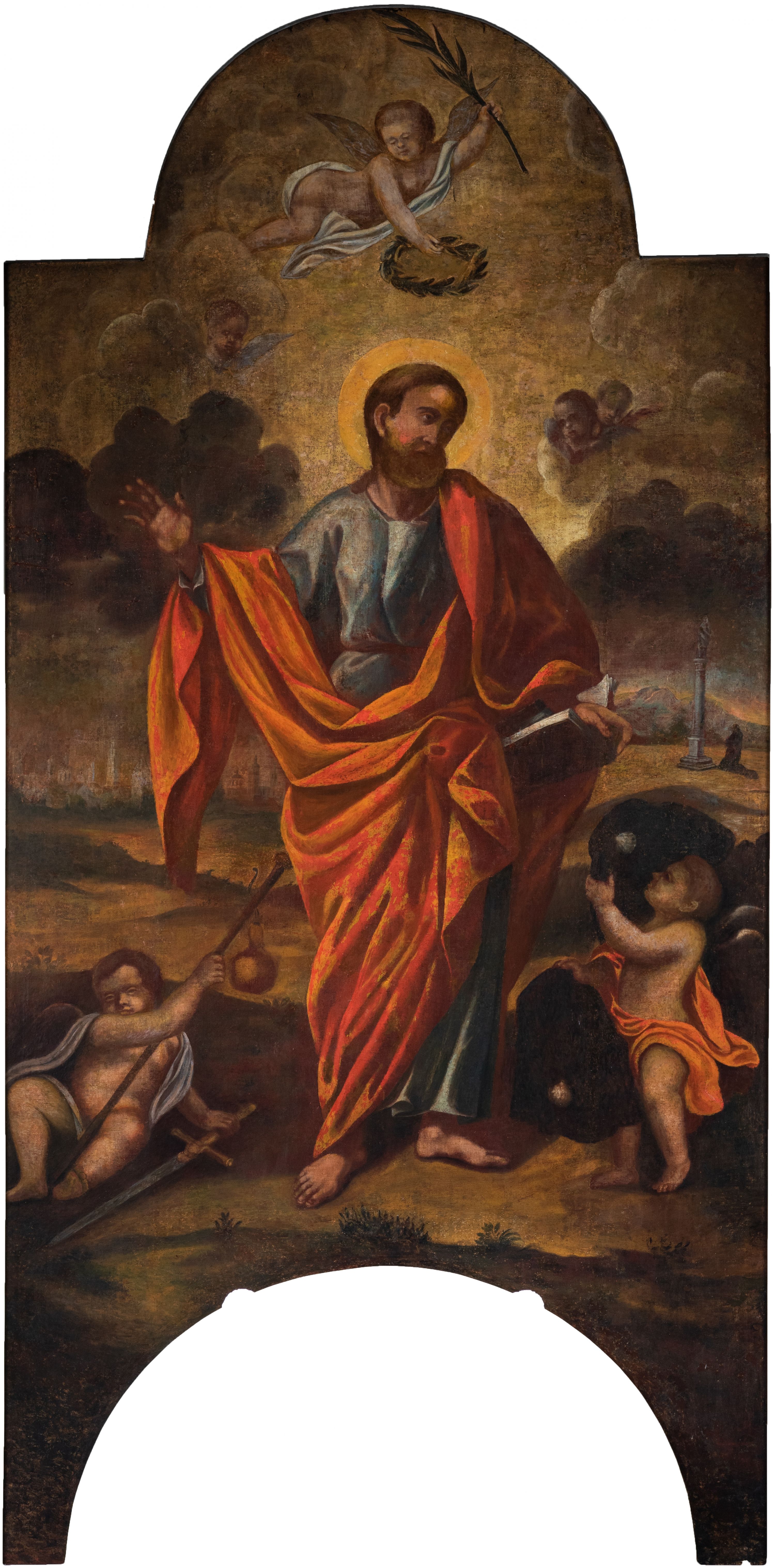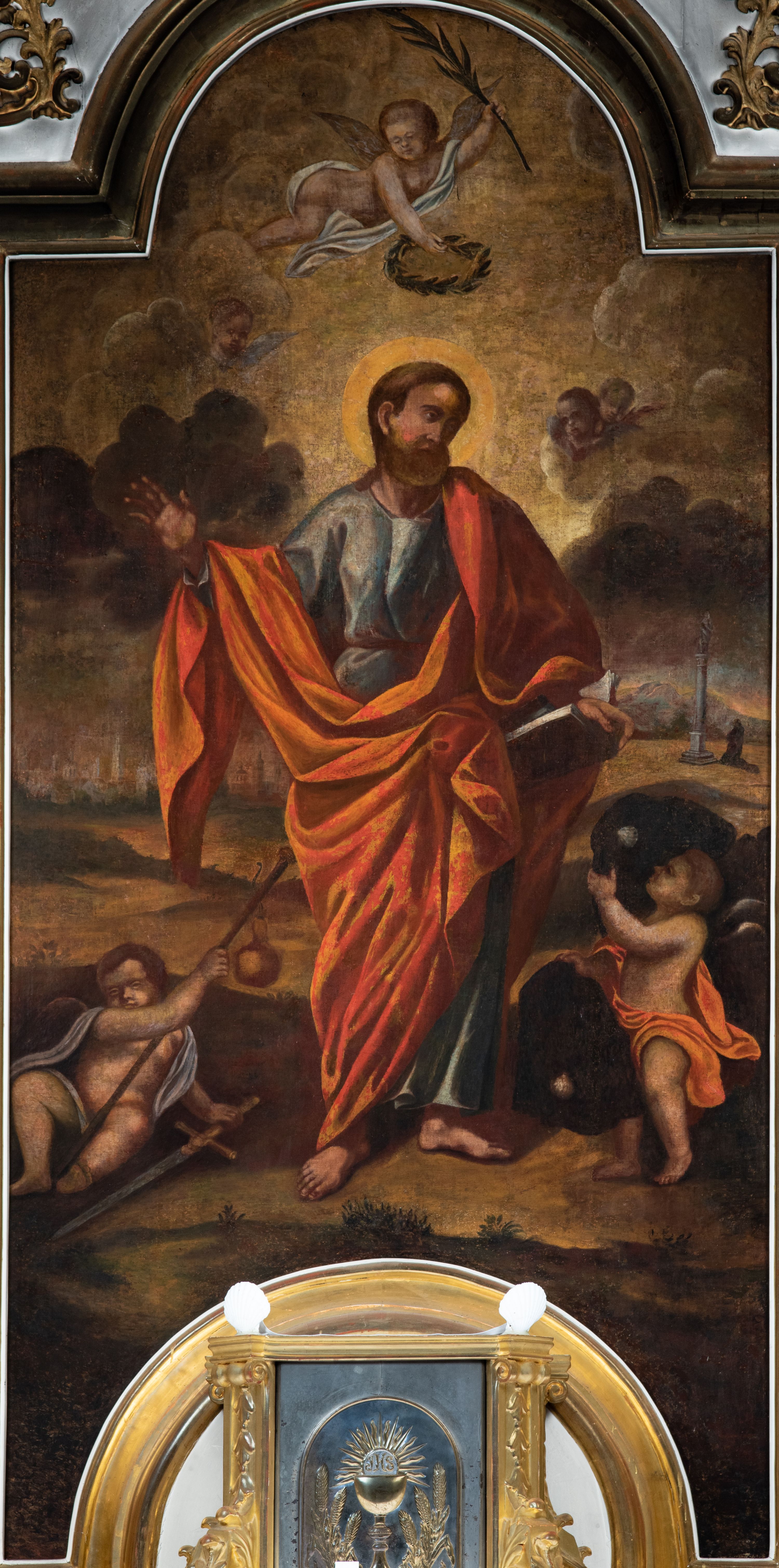 Obraz w kształcie prostokąta zamkniętego łukiem półkolistym nadwieszonym, u dołu z półkolistym wycięciem. Święty przedstawiony w całej postaci, frontalnie, z głową pochyloną na lewy bark i ukazaną w trzech czwartych; stoi w lekkim kontrapoście z wysuniętą prawą stopą; lewą ręką podtrzymuje opartą na biodrze otwartą księgę, lewa ręka ugięta w łokciu, odwiedziona w bok od ciała, z otwartą dłonią skierowaną do widza. Twarz o ciemnej karnacji okolona długimi ciemnymi włosami i takimż zarostem. Ubrany w długą błękitną suknię, okryty czerwoną draperią zarzuconą na lewe ramię, osłaniającą sylwetkę od bioder w dół i przewieszoną przez prawe przedramię. Po bokach świętego dwa uskrzydlone putta, putto po lewej trzyma kij pielgrzymi z zawieszonym bukłakiem, obok na ziemi leży miecz. Ponad głową Apostoła unosi się trzecie putto trzymające w lewej palmę męczeństwa, w prawej ręce wieniec z róż. W tle pejzaż ze scenami życia świętego oraz niebo rozjaśnione za jego głową.
