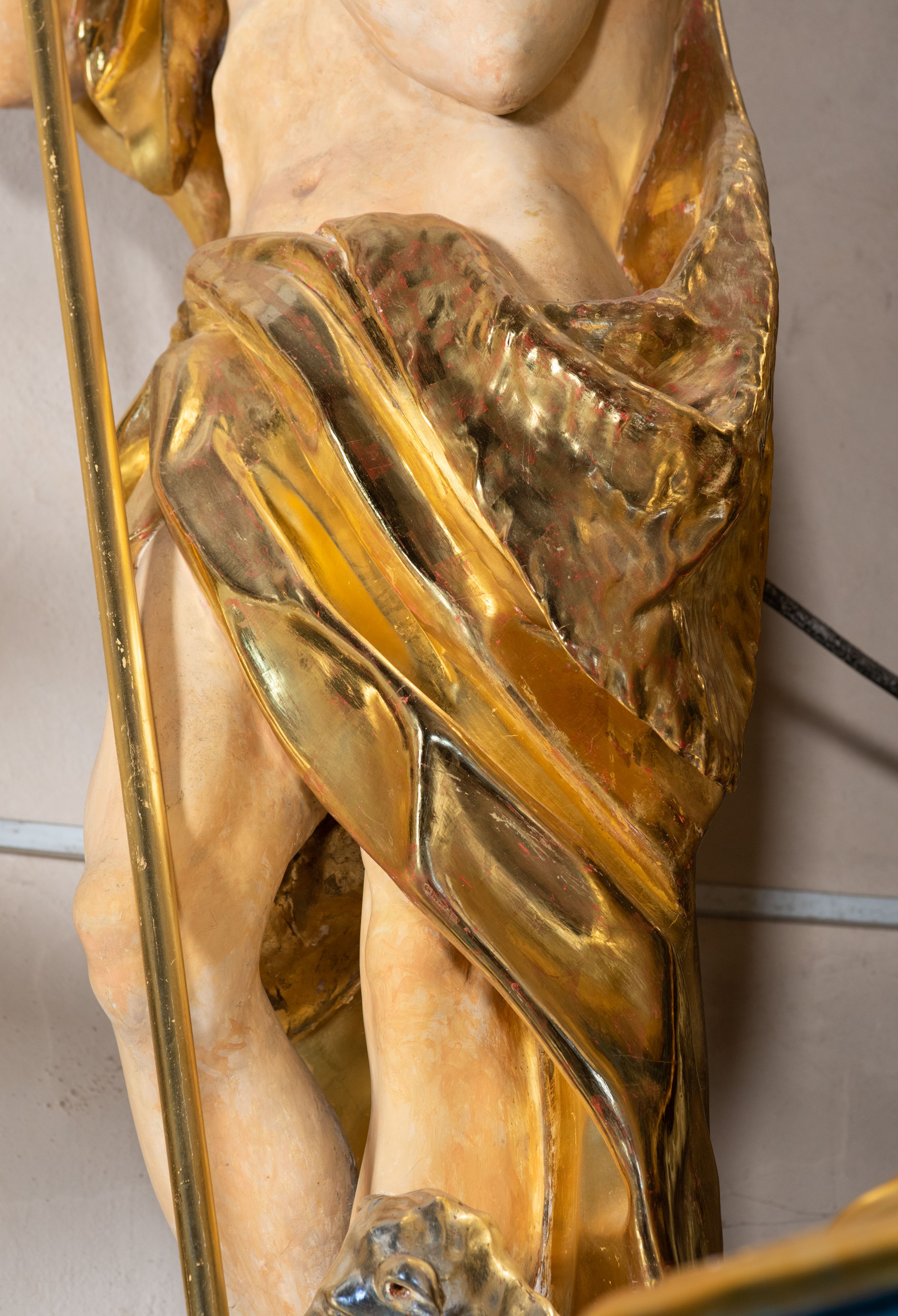Rzeźba wydrążona z tyłu. Postać Jana Chrzciciela stojąca w kontrapoście z prawą nogą ugiętą, głowa zwrócona w trzech czwartych na lewo. Prawa ręka zgięta w łokciu uniesiona, lewa zgięta z dłonią na piersi. Twarz zakończona ostrym podbródkiem okolonym brodą, rozchylone usta, otwarte oczy, prosty nos, wąskie ciemne brwi, wyraźne rysy z podkreślonymi kośćmi policzkowymi. Na głowie brązowe włosy w postaci loków spływające na plecy. Na prawe ramię zarzucona skóra wielbłąda. Święty w biodrach przepasany tkaniną przewieszoną przez sznur o wyraźnych, obfitych fałdowaniach. Sylwetka z poprawnie i wyraźnie zaznaczoną muskulaturą. Święty trzyma w ręku długi krzyż, a przy nogach leży baranek. Szaty i krzyż złocone, polichromia partii ciała naturalistyczna, figura baranka srebrzona.