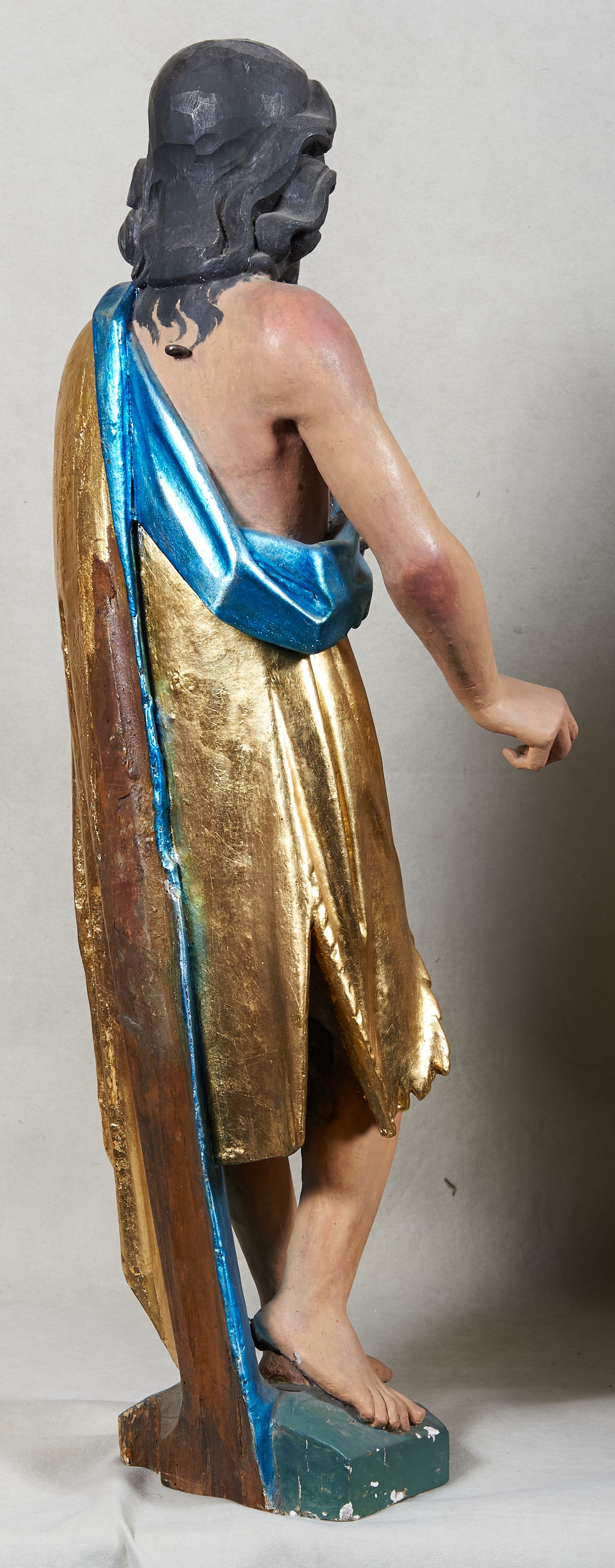 Rzeźba pełnoplastyczna z przedstawieniem Jana Chrzciciela. Święty ukazany frontalnie, w delikatnym kontrapoście, z prawą nogą ugiętą w kolanie, ręce ugięte w łokciach, lewą dłonią podtrzymuje przed sobą księgę, prawa ułożona w geście trzymania niezachowanego atrybutu. Ubrany w krótką szatę (zapewne ze skóry wielbłąda), sięgającą do kolan i odsłaniającą prawe ramię, oraz złoty płaszcz z niebieską podszewką, zarzucony na lewe ramię. Twarz podłużna, okolona ciemną brodą i silnie falowanymi włosami, sięgającymi do ramion i opadającymi na plecy. Karnacja jasna, policzki silnie zarumienione.