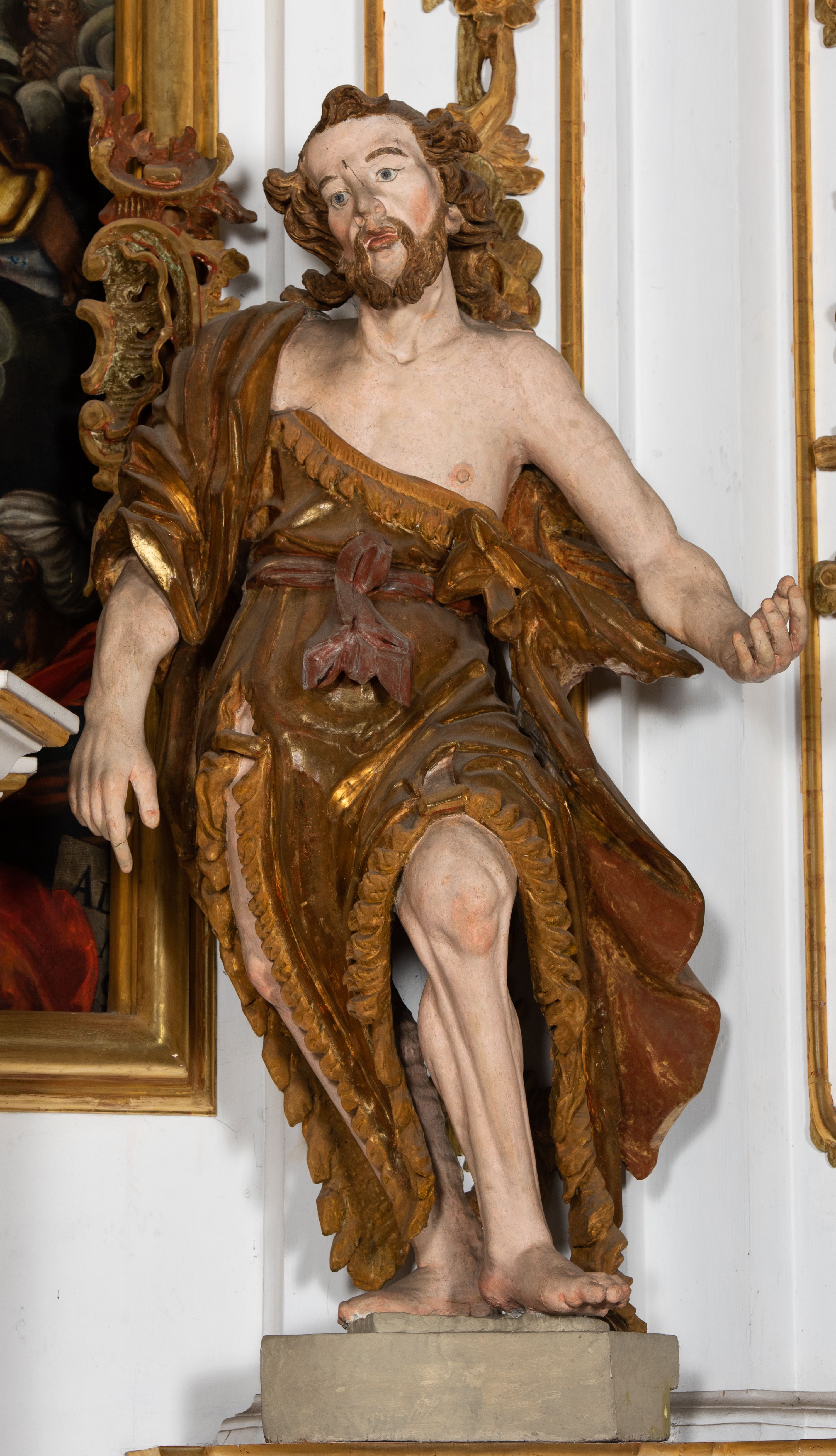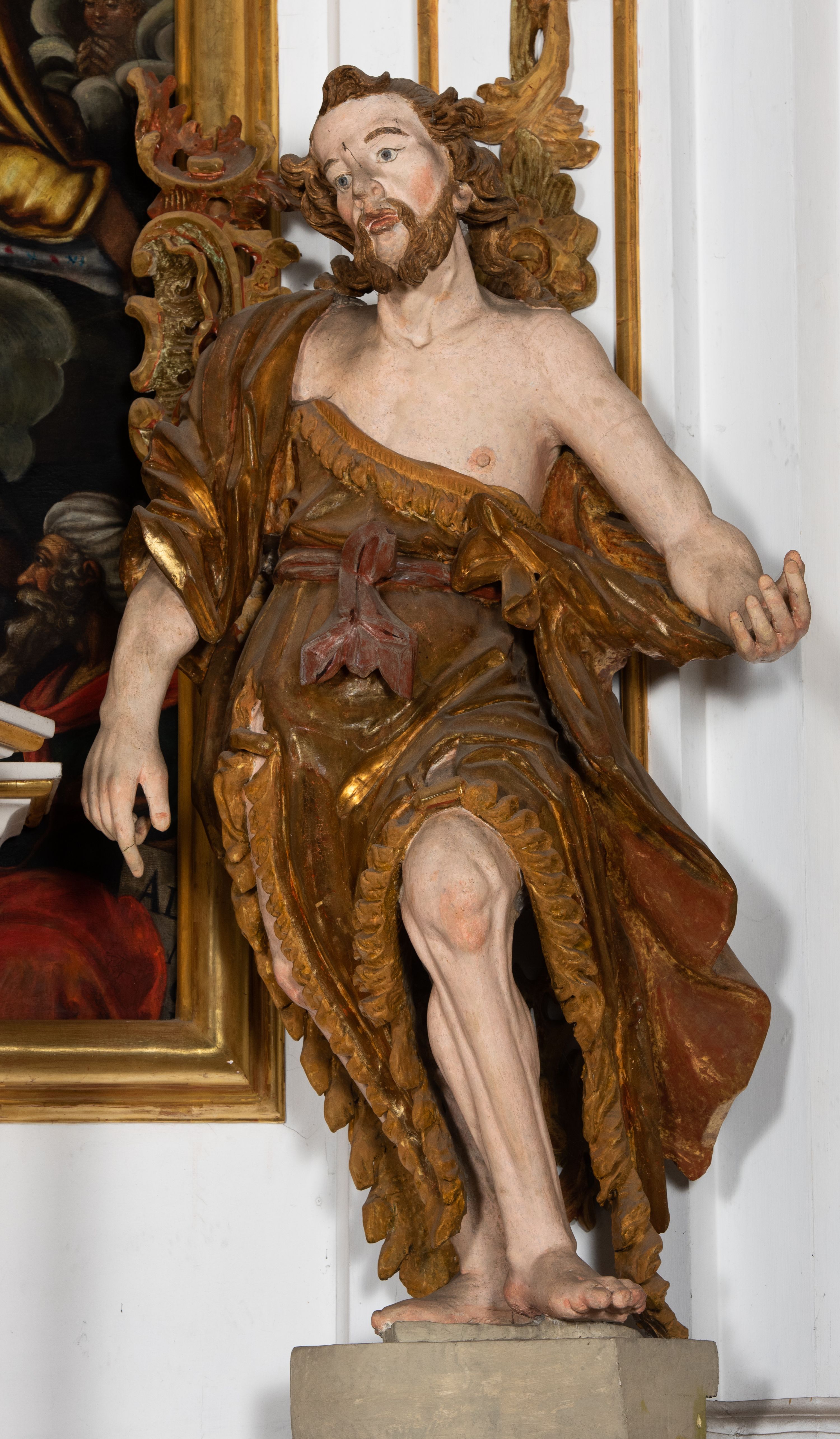 Ustawiona na cokole o nieregularnym planie, pełnoplastyczna rzeźba drążona, ukazuje św. Jana Chrzciciela. Figura zwrócona jest do widza frontalnie, w kontrapoście, z głową lekko przechyloną w prawo, o silnym esowatym wygięciu ciała. Święty prawą rękę opuszcza wzdłuż ciała. Jego dłoń zdaje się wskazywać coś na dole. Natomiast lewą rękę ma wyciągniętą w bok. Być może pierwotnie podtrzymywał nią księgę z przedstawieniem Baranka. Jan Chrzciciel został ukazany jako dojrzały mężczyzna. Jego ciało jest szczupłe o wyraźnie podkreślonej muskulaturze rąk i nóg oraz mostku i obojczykach klatki piersiowej. Ma szczupłą, pociągłą twarz, o silnie podkreślonych kościach policzkowych, łukach brwiowych i silnie zadartym, wąskim nosie z wysuniętą do przodu górną wargą, oczy niewielkie, okrągłe, usta pełne i lekko rozchylone. Twarz okala krótki zarost skręcony w dwa pukle oraz włosy układające się w rozwiane, silne skręcone pukle na czubku głowy i po jej bokach. Święty ubrany jest w silnie przylegającą do ciała, lekko marszczoną melotę przewiązaną w pasie szarfą, odsłaniającą połowę torsu oraz nogi. Na prawe ramię ma narzucony silnie drapowany płaszcz, opadający z tyłu i na lewy boku postaci. W odsłoniętych partiach ciała polichromia rzeźby jest naturalistyczna, szaty złocone natomiast szarfa w pasie srebrzona.