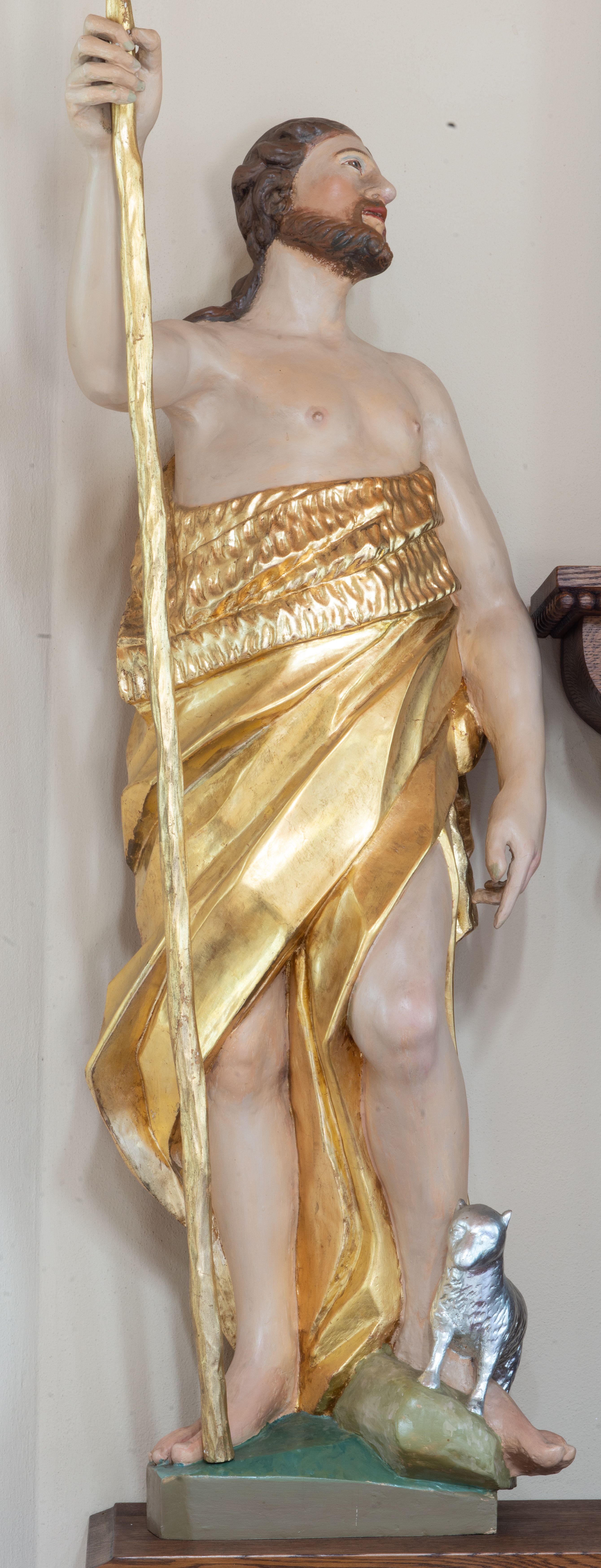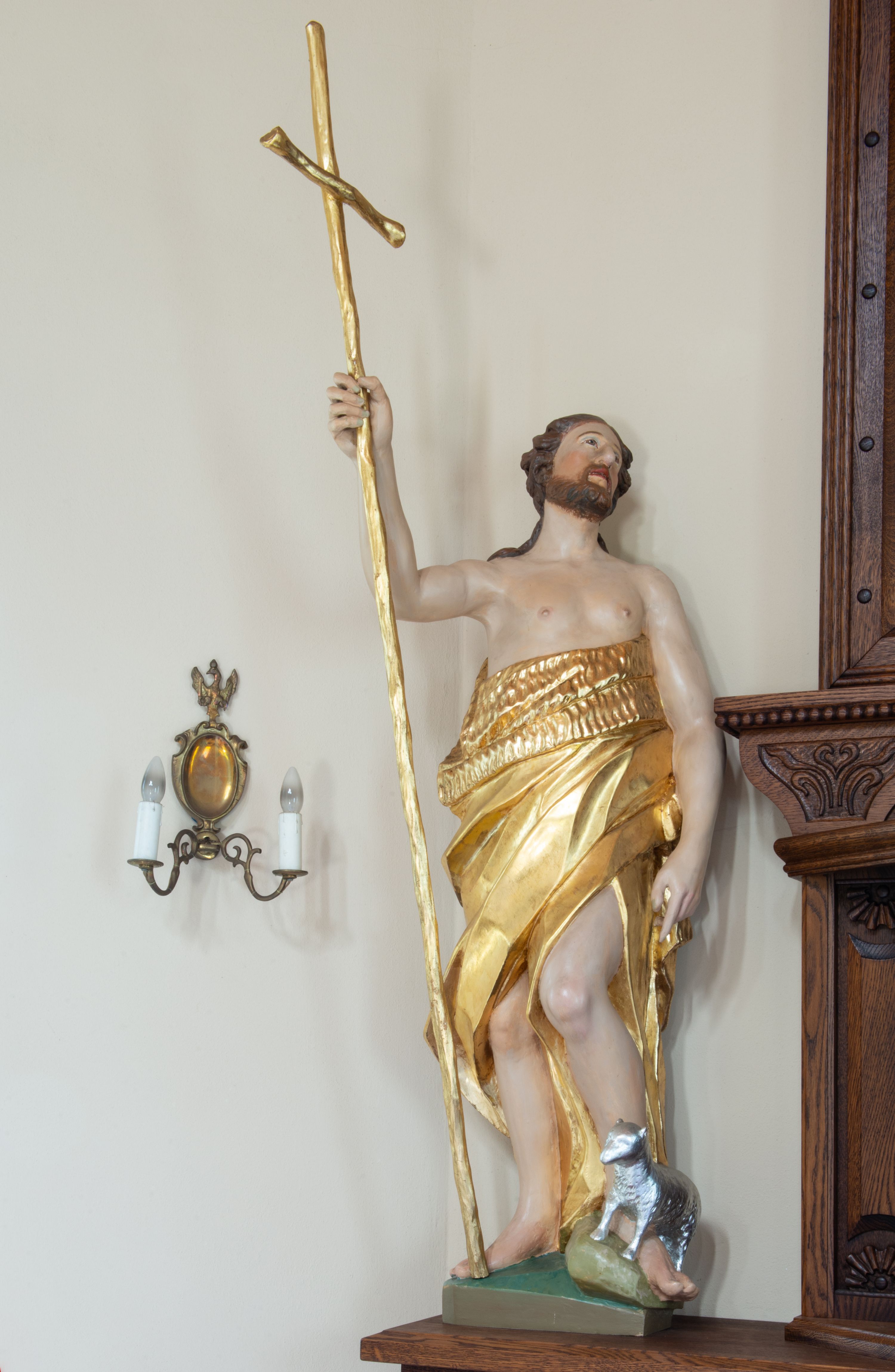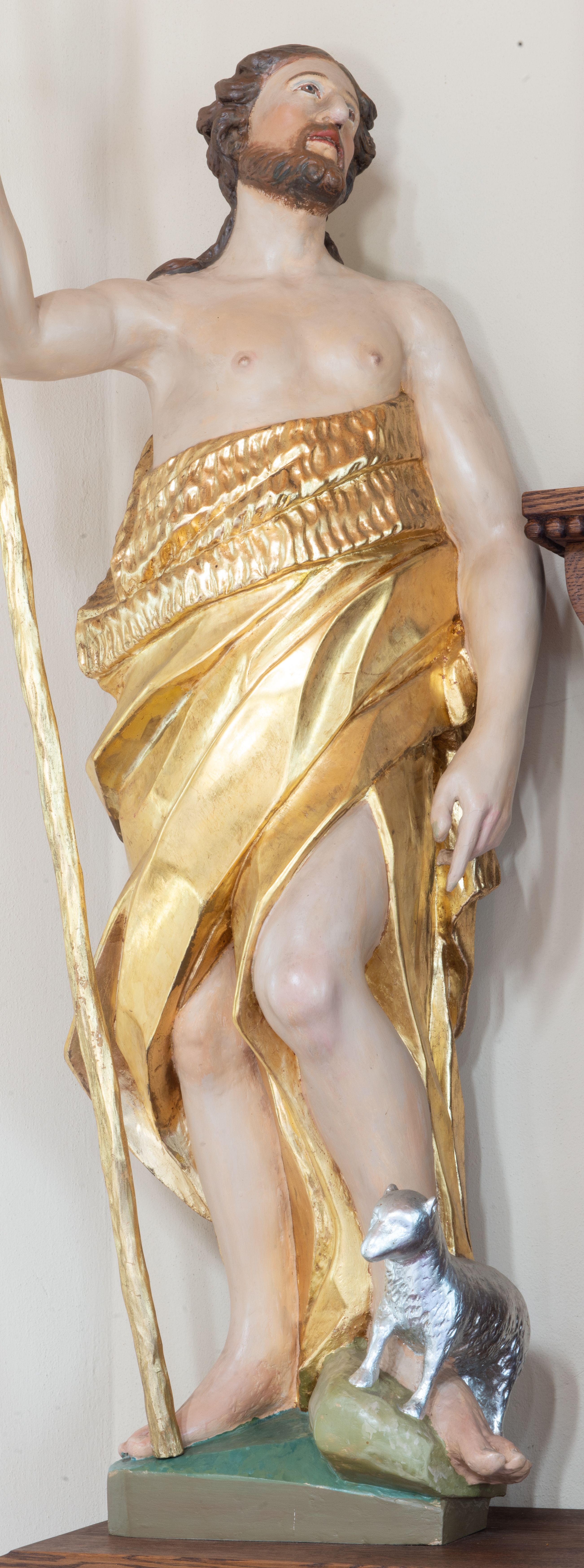 Święty ukazany frontalnie, z głową skierowaną w lewo, w prawej ręce trzyma laskę zakończoną krzyżem, lewą ma opuszczoną wzdłuż boku, lewą nogę opiera na rzeźbionym kamieniu, na którym stoi baranek. Twarz ma pociągłą, o migdałowatych oczach skierowanych w górę, prostym nosie i rozchylonych ustach, okoloną krótką, kręconą brodą oraz kręconymi włosami opadającymi na ramiona. Ubrany jest w melotę opasującą jego korpus i nogi, odsłaniającą część klatki piersiowej i ramiona oraz lewą nogę. Polichromia ciała naturalistyczna, włosy i broda brązowe, strój i laska złocone, baranek srebrzony.