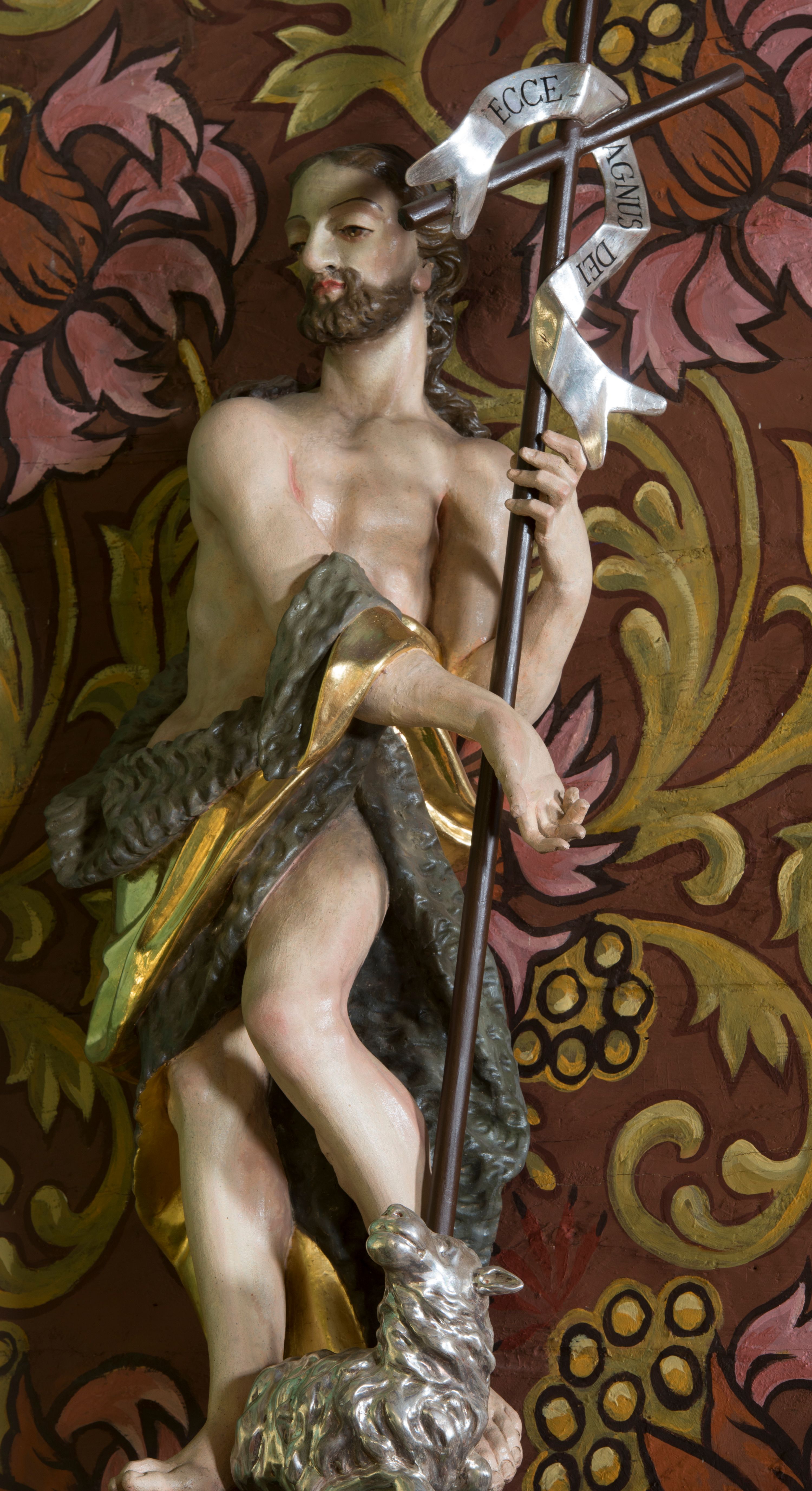 Figura ukazująca św. Jana Chrzciciela w całej postaci, w kontrapoście, sylwetka delikatnie wygięta w lewo, w skręcie. Święty w lewej ręce trzyma długie drzewce zakończone krzyżem z przewiązaną banderolą z napisem „ECCE AGNUS DEI”, prawą rękę silnie wysuwa w lewą stronę. Twarz szczupła o dużych szeroko rozstawionych i migdałowatych oczach z wyraźnie rzeźbionymi powiekami, dużym zaoblonym nosem; okolona zarostem oraz włosami do ramion w postaci silnie przylegających do głowy, falujących pukli. Święty ma narzucony płaszcz ze skóry ze złoconym podbiciem, zawiązany na prawym przedramieniu i w partii bioder, odsłaniający lewe udo. U stóp figury rzeźba leżącego baranka z głową skierowaną ku górze. Polichromia partii ciała naturalistyczna, detal złocony i srebrzony.