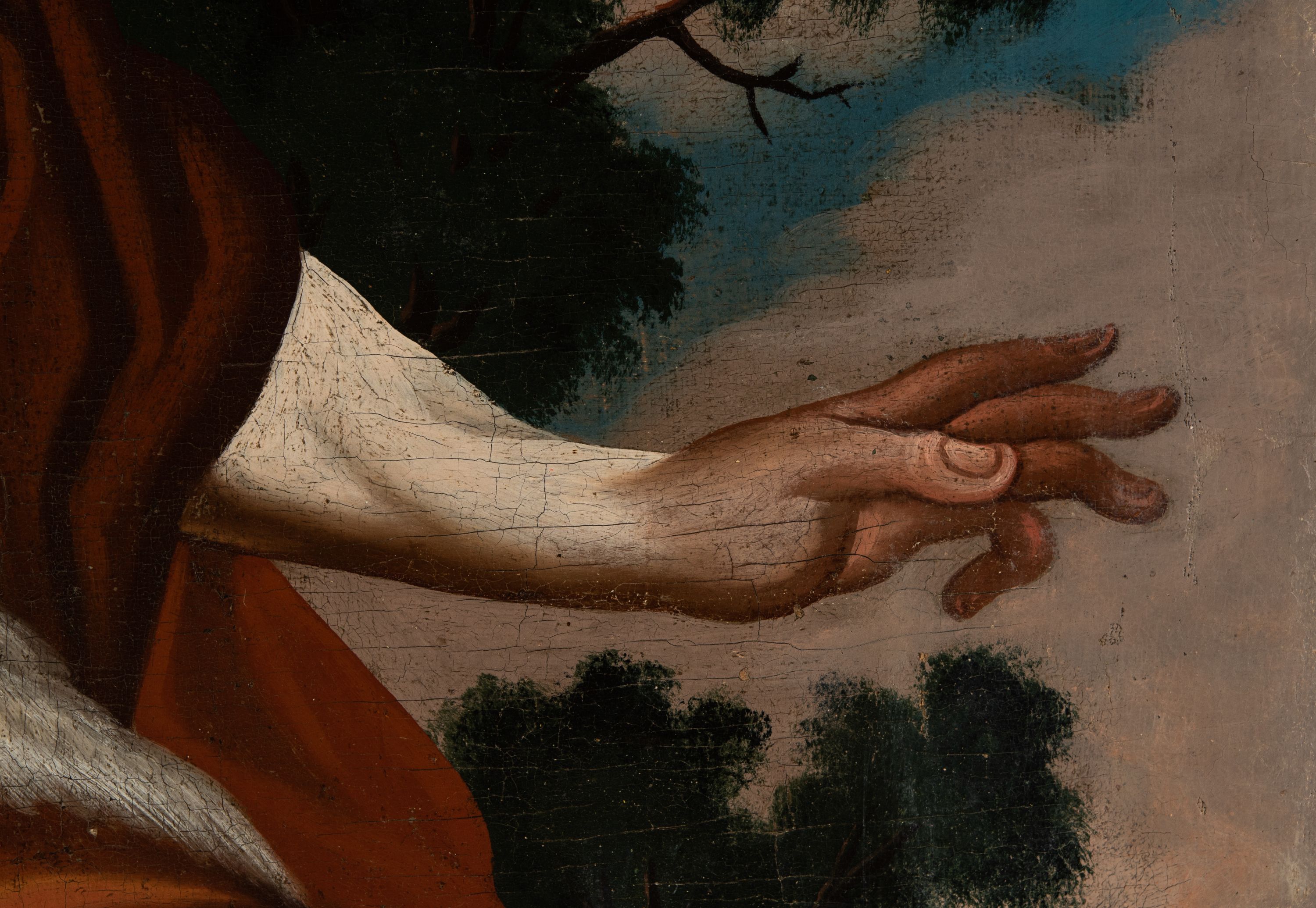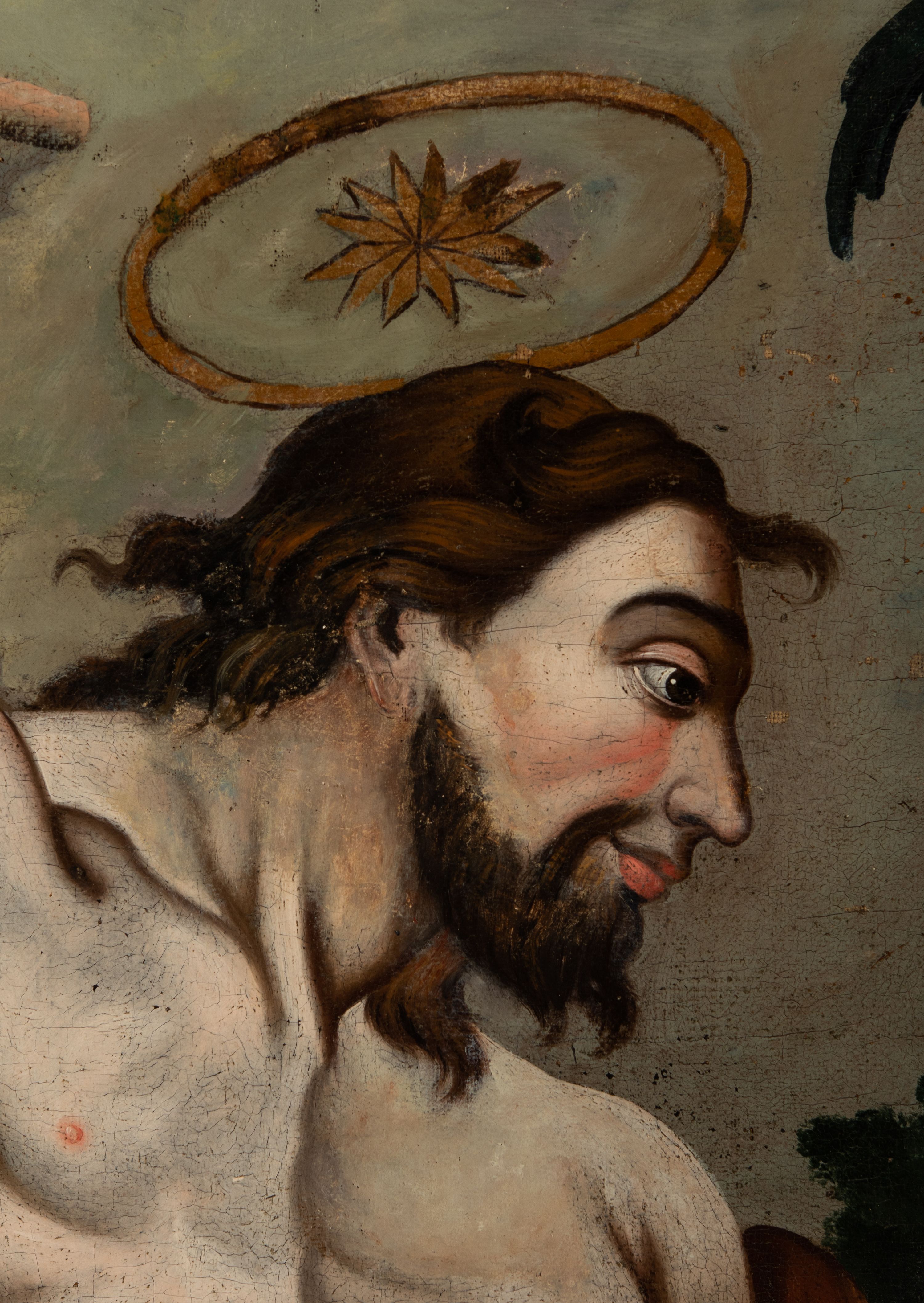 Na rewersie feretronu znajduje się obraz przedstawiający św. Jana Chrzciciela przemawiającego do niewielkiej grupy ludzi. Jako ostatni z proroków i bezpośredni poprzednik Jezusa uważany jest za postać jednoczącą Stary i Nowy Testament. Jan Chrzciciel był jedynym, późno urodzonym dzieckiem Zachariasza i krewnej Marii – Elżbiety. Jego narodziny zwiastował Zachariaszowi Archanioł Gabriel. Według legendy anioł wyprowadził młodego Jana na pustynię i ofiarował mu szatę ze skóry zwierzęcej, która miała się w cudowny sposób zrosnąć z jego ciałem. Okrywający nagą sylwetkę ukazanego na obrazie świętego płaszcz, który podszyty jest futrem stanowi także odzwierciedlenie słów Ewangelii (Mt 3,4; Mk 1,6). Pustelniczy żywot wiódł ów prorok do momentu, kiedy rozpoczyna działalność pokutnego kaznodziei i chrzciciela (Łk 1,80). Prezentowana scena odnosi się do kazań do ludu, podczas których wzywał do nawrócenia (Mt 3,1; Łk 3,3; J 1,19). Leżący u stóp świętego baranek nawiązuje do świadectwa Jana o Chrystusie, jakie zawarte zostało także na wstędze oplatającej trzymany przez niego krzyż: „Oto baranek Boży, który gładzi grzechy świata” (J 1,29). O chrzcie Jezusa, jakiego dokonał w rzece Jordan przypomina zaś leżąca obok niego muszla.