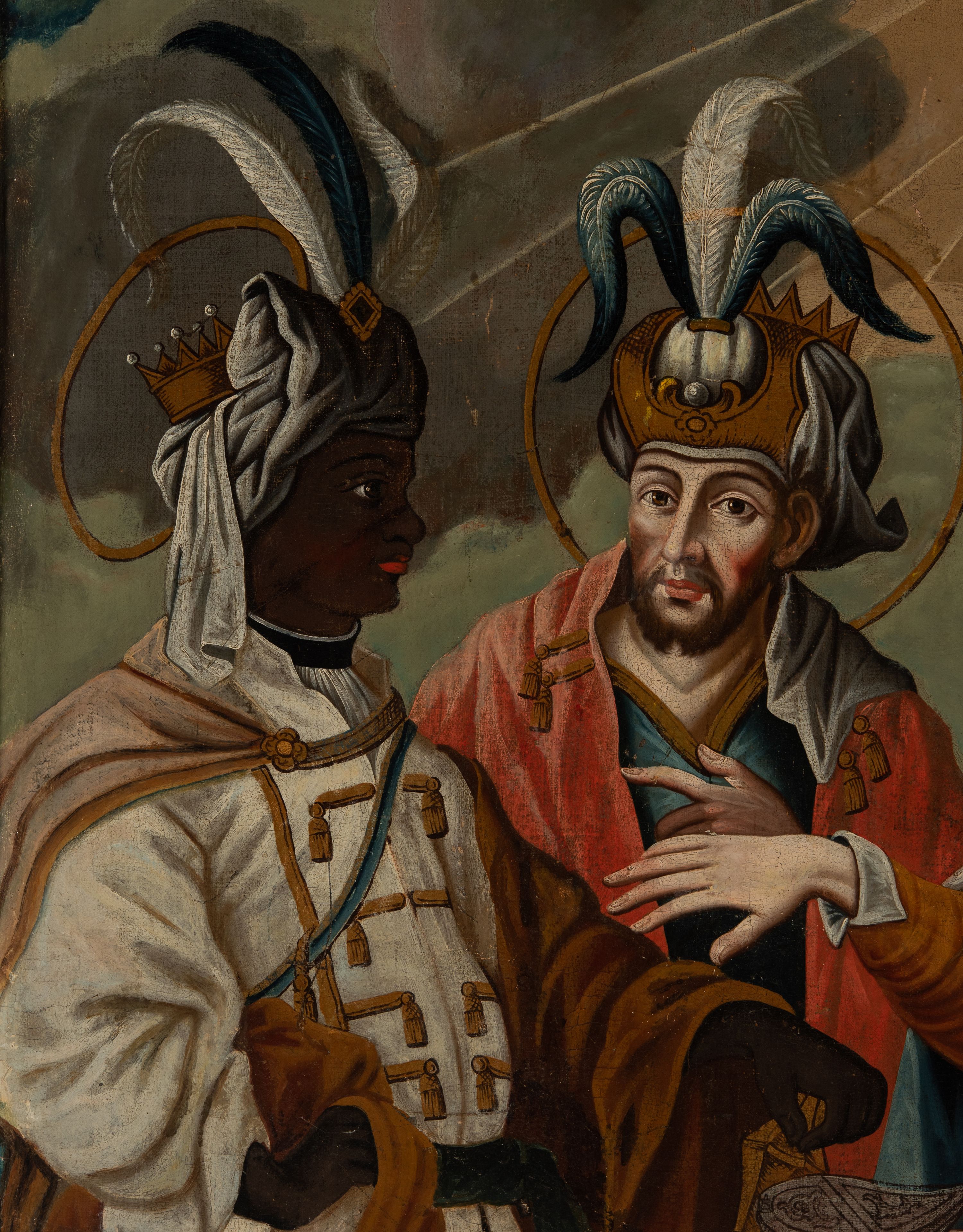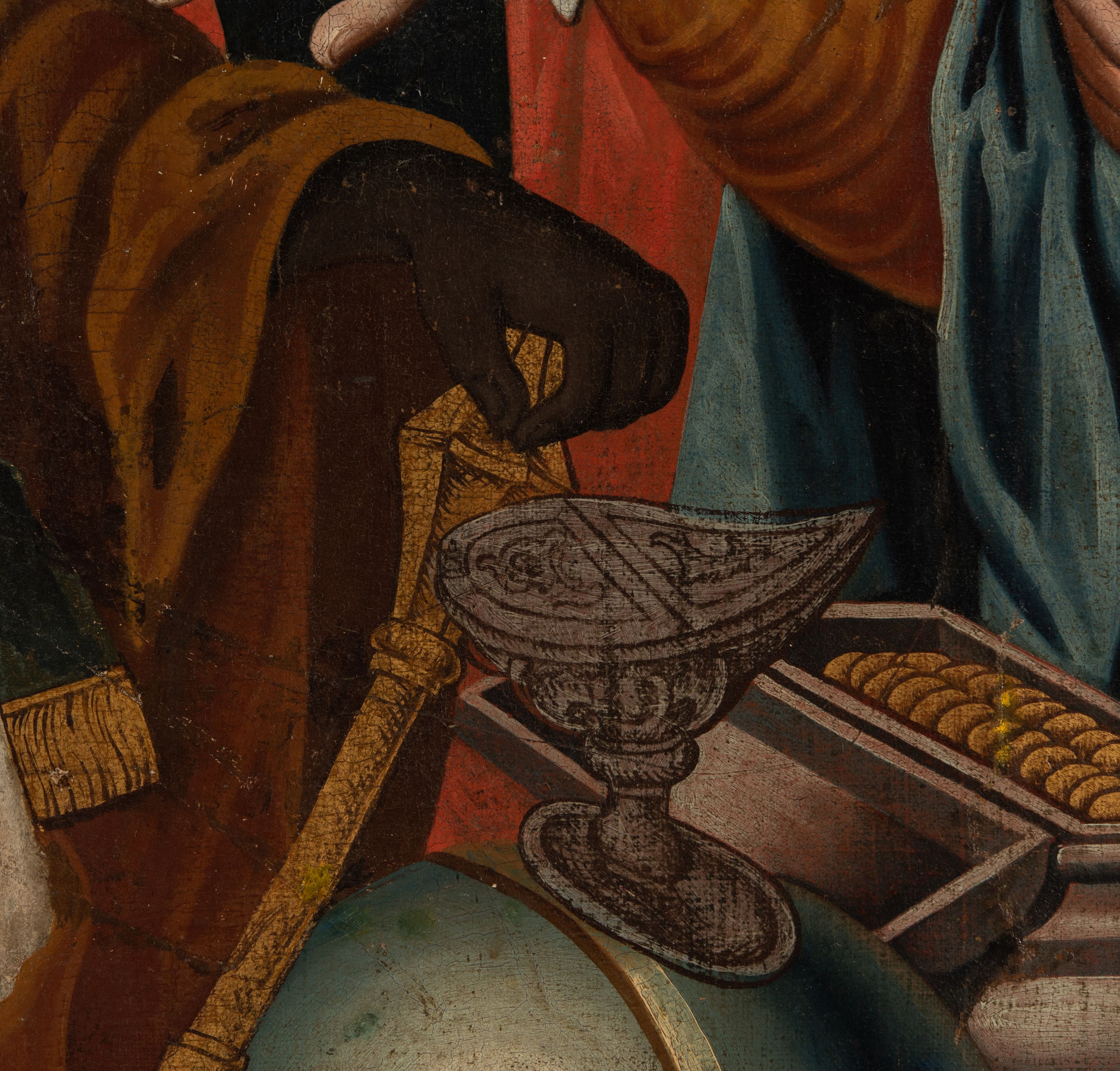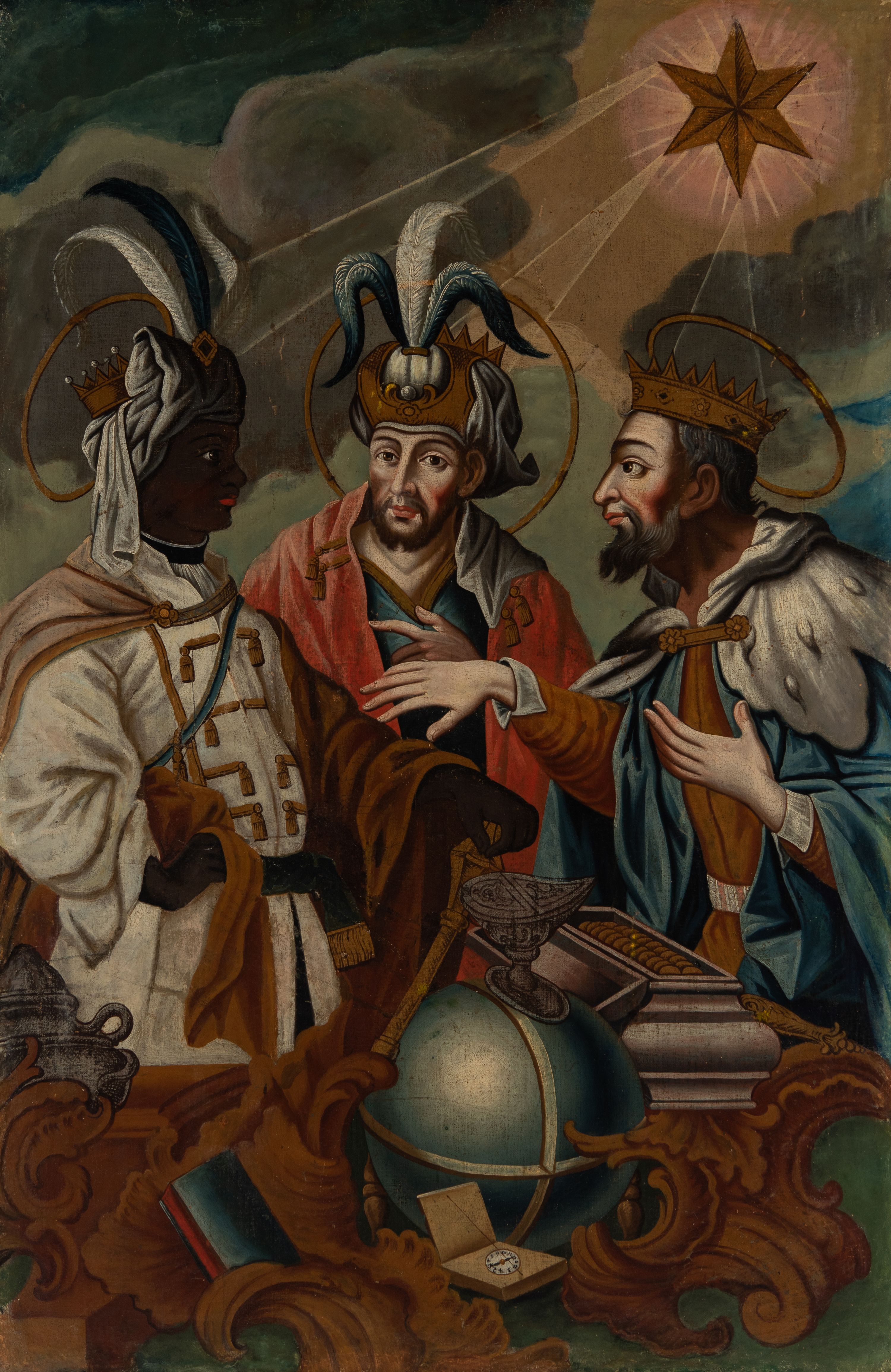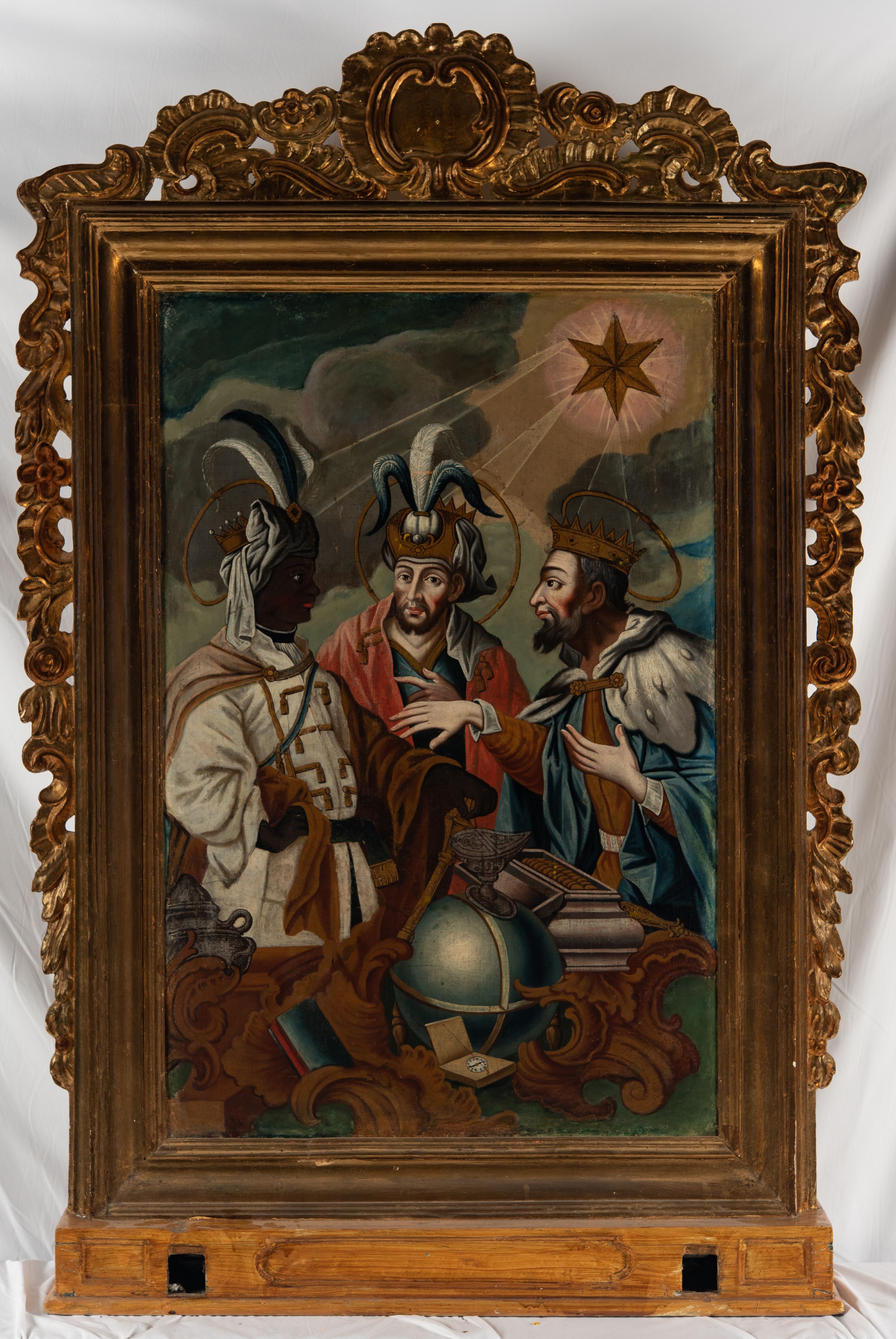 Obraz na awersie feretronu ukazuje sylwetki Trzech Króli zwanych Mędrcami, bądź Magami, którzy według tradycji chrześcijańskiej przybyli do nowonarodzonego Jezusa by oddać mu hołd i złożyć dary. W zawartej w Ewangelii opowieści św. Mateusz (Mt 2, 1-12) wspominał o cudzoziemcach, nie podając ich liczby, którzy prowadzeni przez gwiazdę przybyli do Betlejem, gdzie wedle proroctwa z Księgi Micheasza (Mi 5,1) miał przyjść na świat król żydowski. Nowonarodzonemu złożyli trzy dary: złoto, kadzidło i mirrę. Dopiero w średniowieczu nadano im imiona: Kacper, Melchior i Baltazar. Owe postaci interpretowane są najczęściej jako uczeni perscy kapłani. Zastosowane przez św. Mateusza greckie słowo „magoi” odnosi się do osoby zgłębiającej wiedzę astrologiczną. Trzech Mędrców zatem można utożsamiać z obszarem starożytnego Babilonu, gdzie rozwijała się astrologia. Do tego odnoszą się ukazane na obrazie (związane wprawdzie z późniejszymi odkryciami) przedmioty, jak glob ziemski czy kompas. W dziejach chrześcijaństwa pokłon Magów rozumiano jako hołd pogan oddany Synowi Bożemu oraz symbol utworzonego z nich Kościoła. Zjawisko gwiazdy na niebie natomiast jako symbol Chrystusa – Mesjasza i Króla Chwały. Widoczne na malowidle zróżnicowanie nacji Mędrców odnosi się do późnośredniowiecznej tradycji, według której uważano ich za przedstawicieli trzech kontynentów: Afryki, Azji i Europy. Zgodnie z tradycją ikonograficzną ukazane na obrazie dary znajdują się w naczyniach nawiązujących formą do naczyń liturgicznych, jak łódka (łac. navicula) z kadzidłem czy ozdobne cyborium z mirrą. Złoto natomiast umieszczone jest w ozdobnej szkatule.