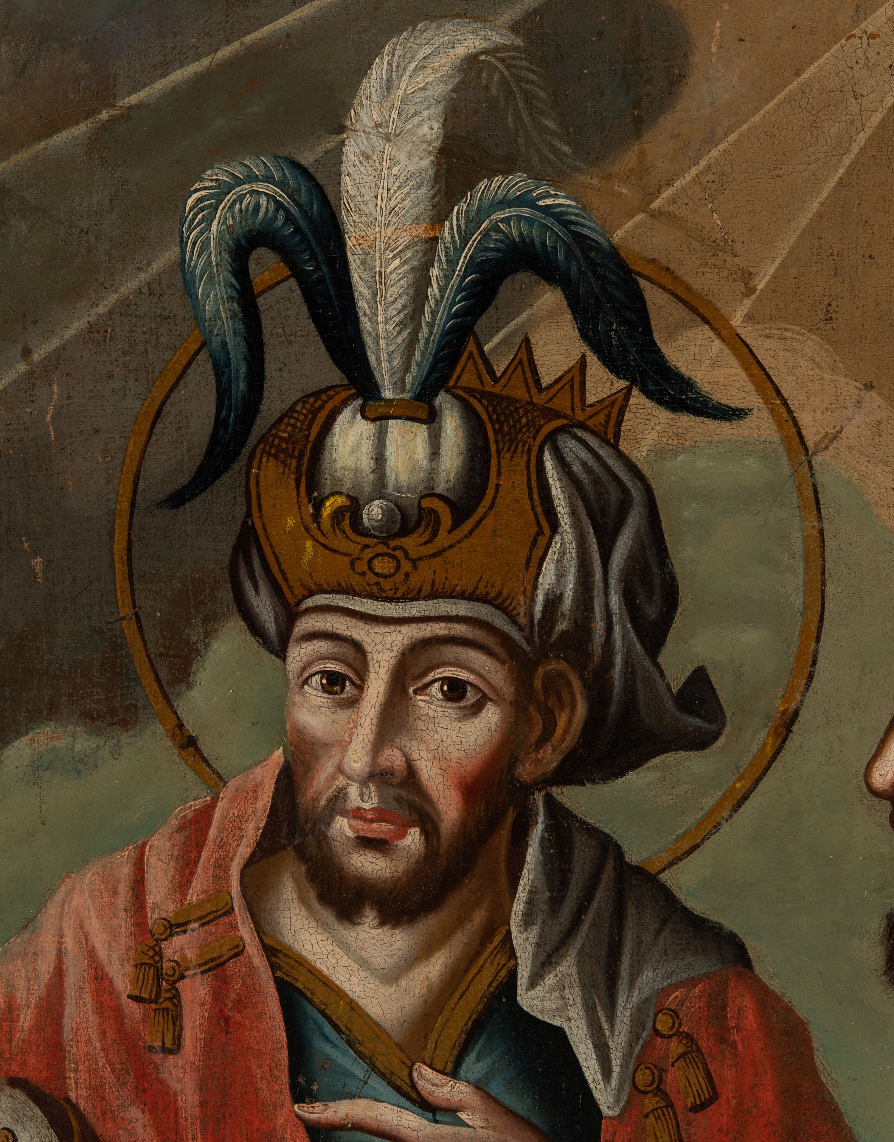 Na rewersie przedstawienie Trzech Króli ukazanych w półpostaciach. Po lewej stronie kompozycji stoi zwrócony w trzech czwartych w lewo ciemnoskóry mężczyzna. Ujętą z profilu twarz charakteryzują wyraziste rysy i zaczerwienione usta i policzki. Ubrany jest w strój dworski składający się z białego żupana ze złotymi obszyciami, przewiązanego granatowym pasem oraz z spiętego pod szyją jasnoróżowego płaszcza ze złotym podszyciem. Głowę mężczyzny osłania biały turban z pióropuszem i wieńczy korona. Prawą rękę wspiera na biodrze, lewą na złotym berle. Pośrodku kompozycji stoi zwrócony na wprost drugi z magów, kierujący głowę w trzech czwartych w prawo. Pociągłą twarz charakteryzują wyraziste rysy o szeroko otwartych oczach, długim nosie, zaróżowionych policzkach oraz krótkim zaroście. Mężczyzna ma na sobie niebieską suknię ze złotym obszyciem dekoltu oraz narzucony na ramiona czerwony płaszcz, na głowie zaś ma biały turban z pióropuszem oraz koronę. Lewą rękę unosi na wysokości piersi. Po prawej stronie obrazu jest zwrócony profilem w prawo trzeci król o lekko pochylonej do przodu sylwetce. Pociągłą twarz charakteryzują wyraziste rysy o dużych oczach, długim nosie, wydatnych ustach, zaróżowionych policzkach i siwym zaroście. Mężczyzna ubrany jest w złotą suknię i spięty pod szyją niebieski płaszcz z gronostajowym kołnierzem. Na głowie jest korona. Król unosi obydwie ręce na wysokości klatki piersiowej, prawą wysuwając nieco do przodu. Głowy magów okalają aureole. Na pierwszym planie, na nakrytym zieloną tkaniną stole, pośród złotych motywów ornamentalnych znajdują się: podłużna szkatuła ze złotymi monetami, globus ze stojącą na nim łódką na kadzidło i leżącym obok kompasem, niewielka książka w niebieskiej oprawie oraz srebrna pyksida. W tle zachmurzone niebo z dużą , sześcioramienną gwiazdą w promieniach w prawym, górnym rogu.