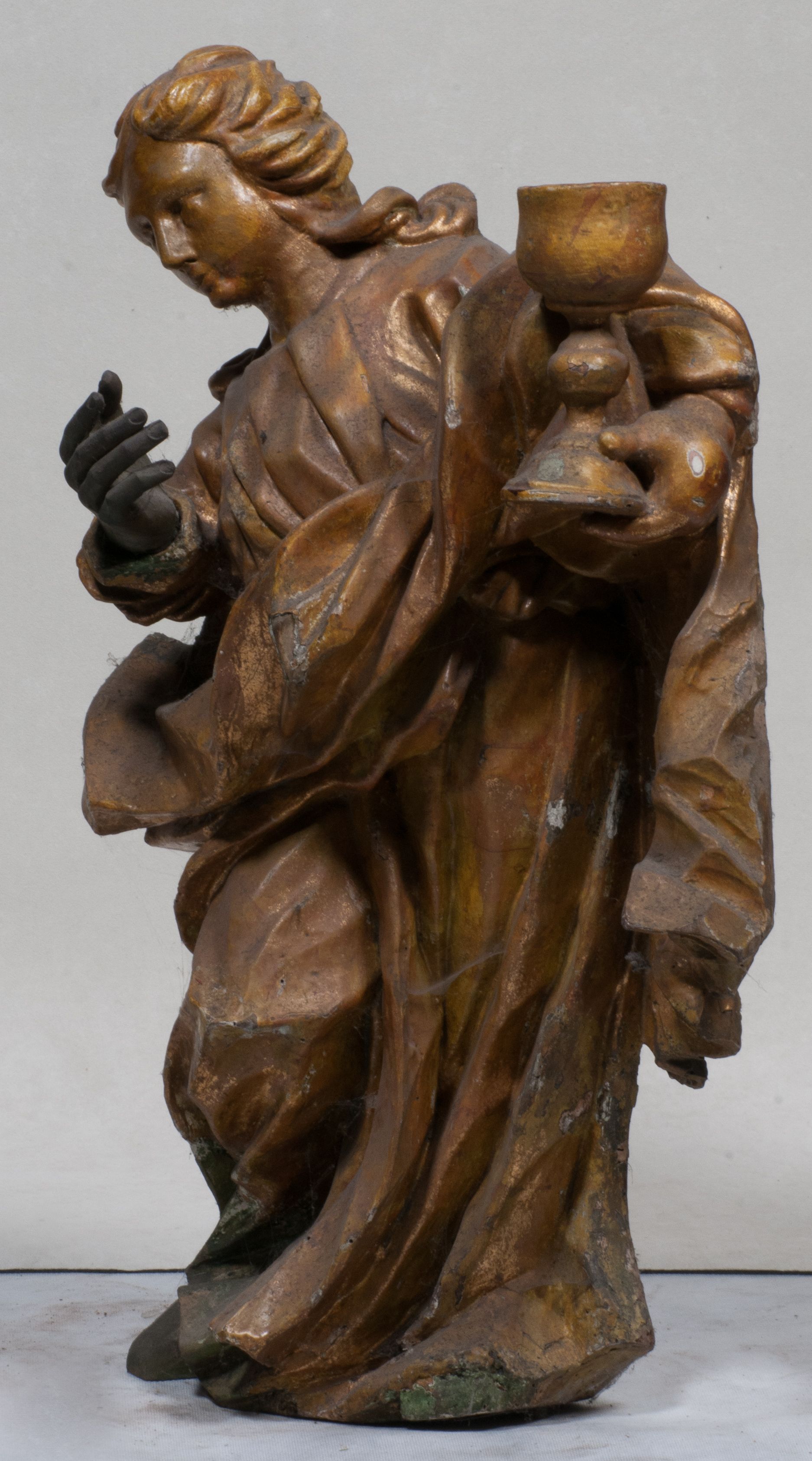 Rzeźba pełnoplastyczna, zwrócona frontalnie, ukazana w silnym kontrapoście i przegięciu ciała w prawą stronę. Święty lewą ręką podtrzymuje kielich, prawą wyciąga do przodu. Jego twarz jest okrągła o pełnych policzkach, okrągłych oczach, małym, prostym nosie, pełnych ustach i wystającej brodzie. Okolona jest długimi, silnie kręconymi włosami, opadającymi skręconymi pasmami na ramiona. Święty ubrany jest w obficie drapowaną tunikę, przylegającą do ciała w partii nóg oraz płaszcz zarzucony na plecy, z przodu postaci skręcony i zarzucony na lewe przedramię. Figura w całości pozłocona.